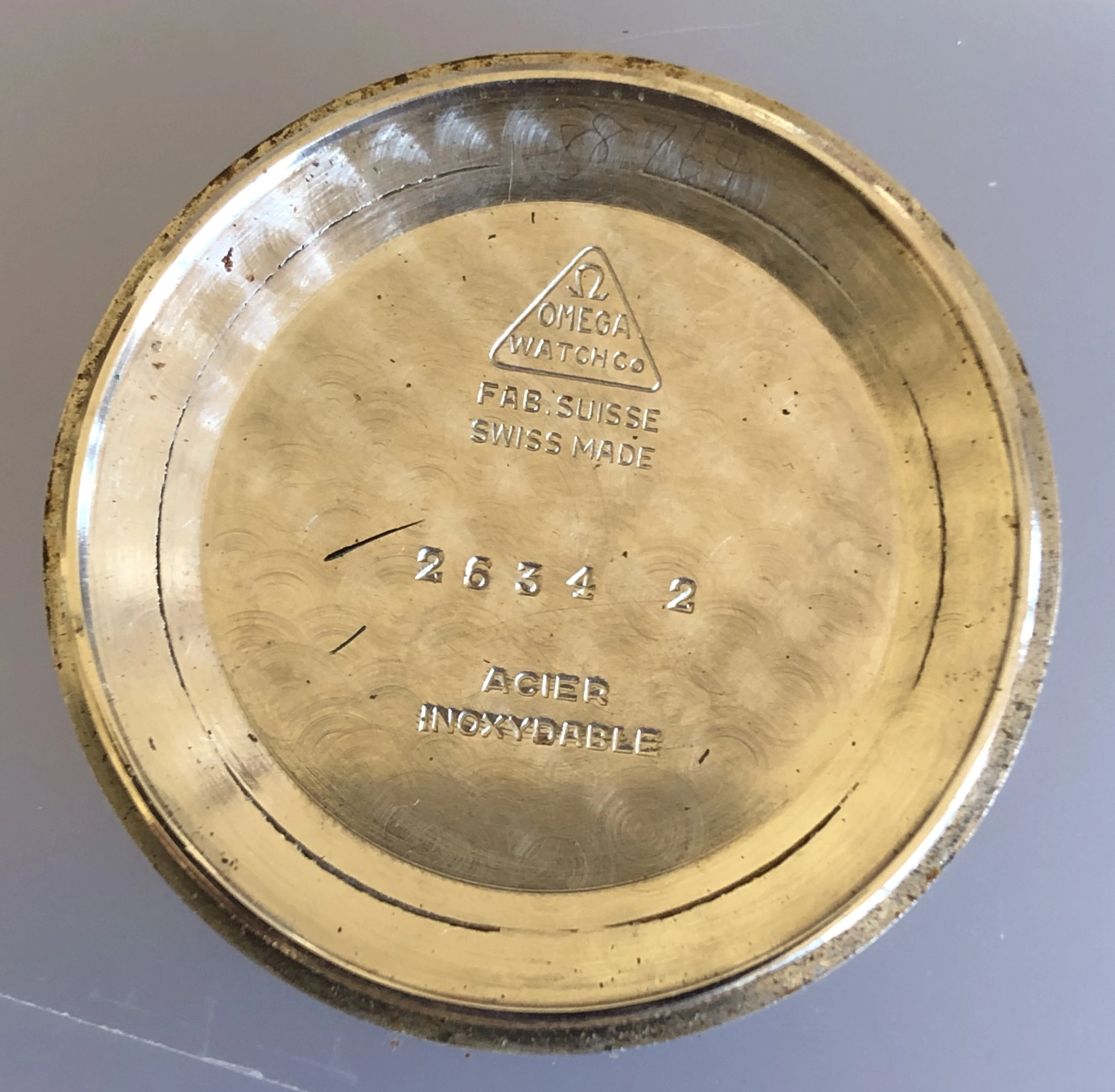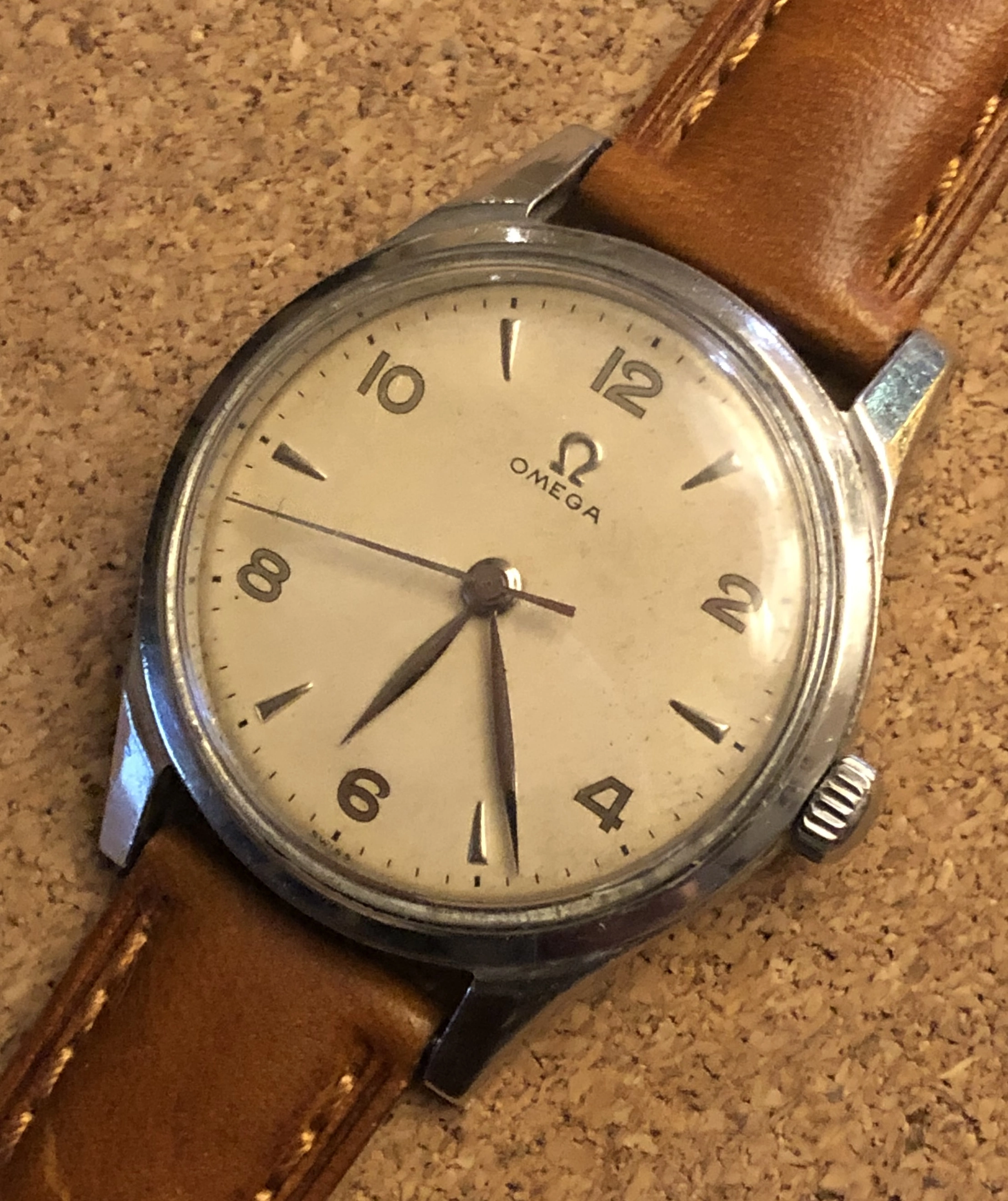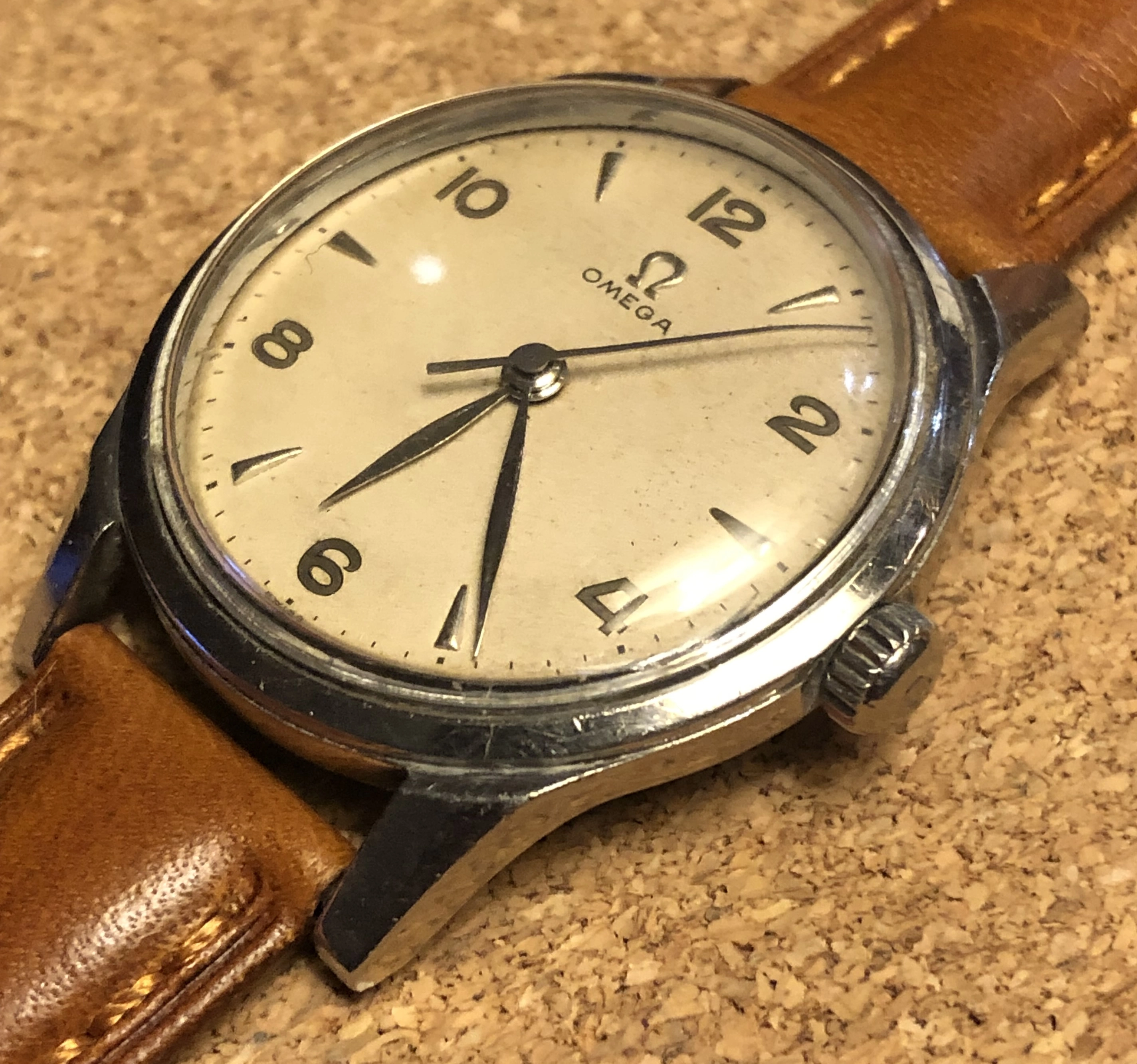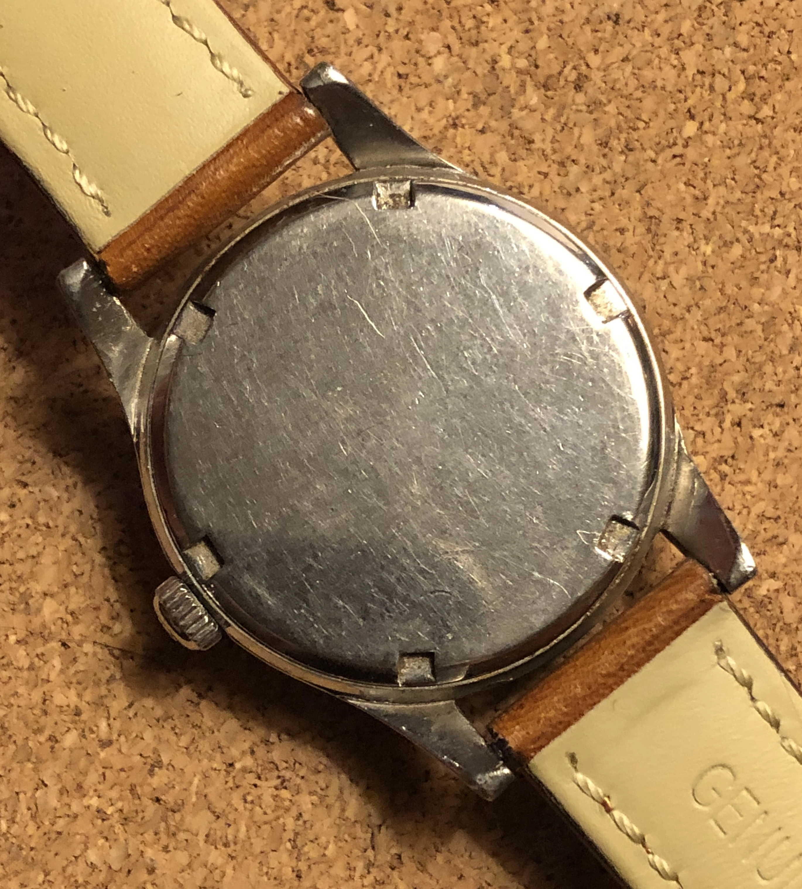 ·Next up is a nice starter piece, a hand-winding reference 2634 from approximately 1949. The dial has gilt even numerals alternating with daggers. The case is 33mm in diameter. The movement is a cal 371, which is a shock-protected member of the 28mm caliber family. Not serviced in my possession but it winds, sets, and runs. It is running slow, and a service is recommended if you plan to use it regularly. The case and dial exhibit wear and aging as shown in the photos. The watch comes with the unworn leather strap as shown.