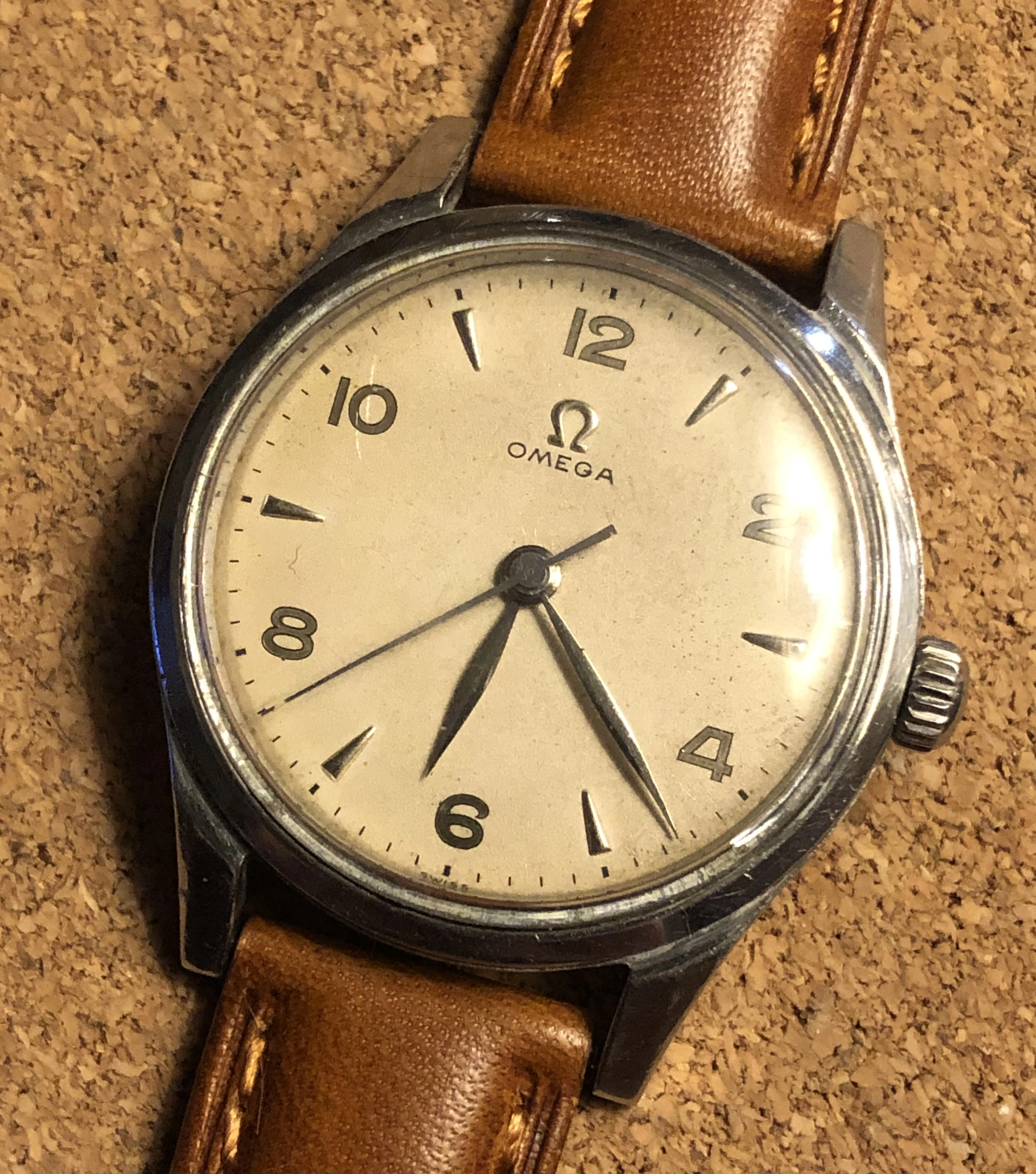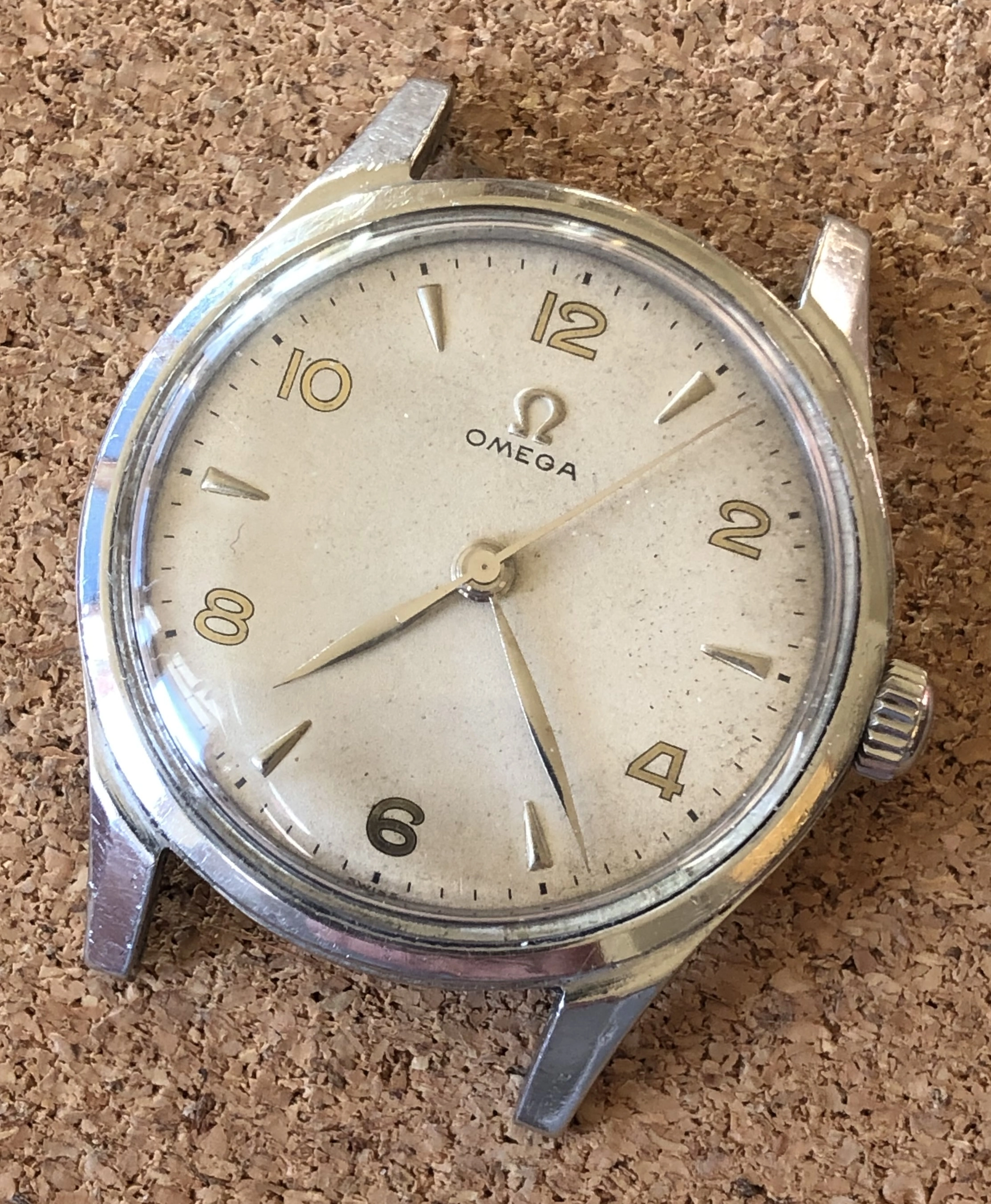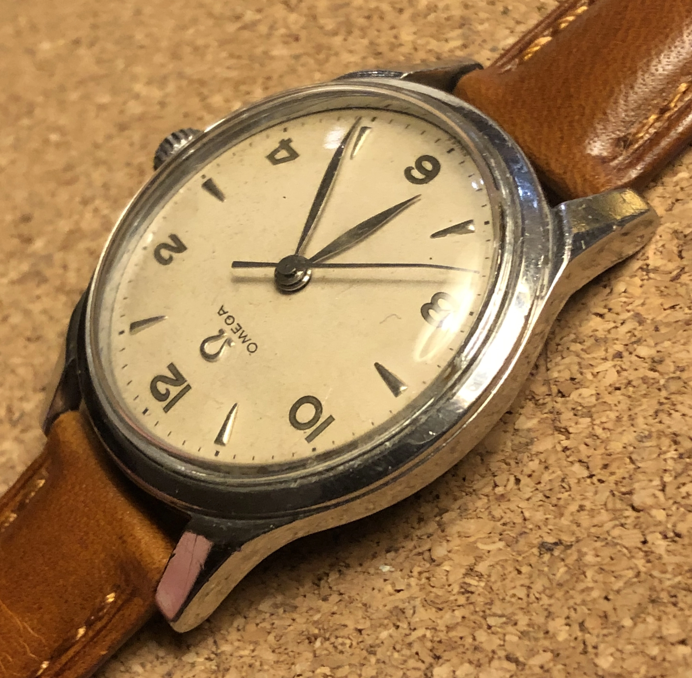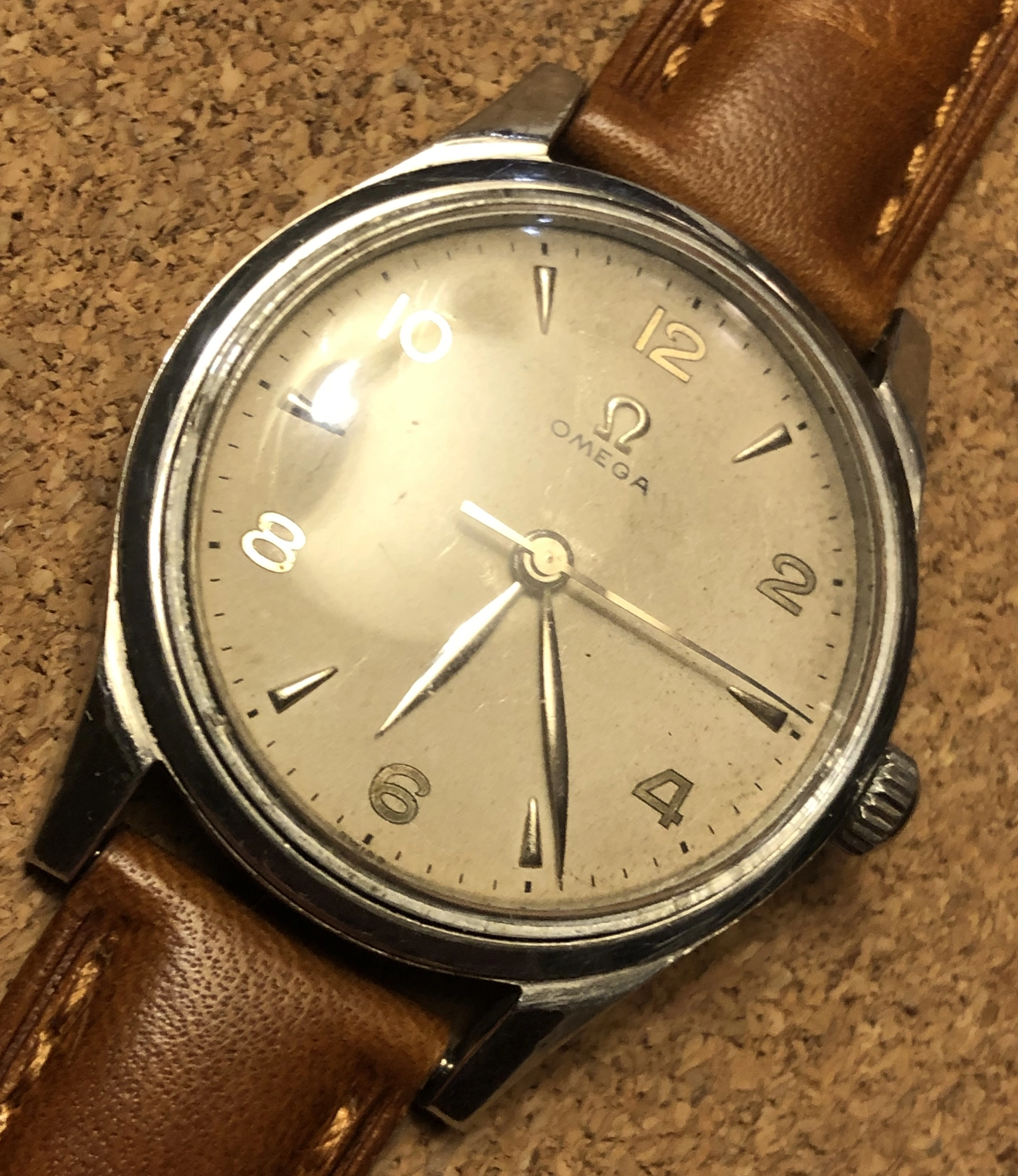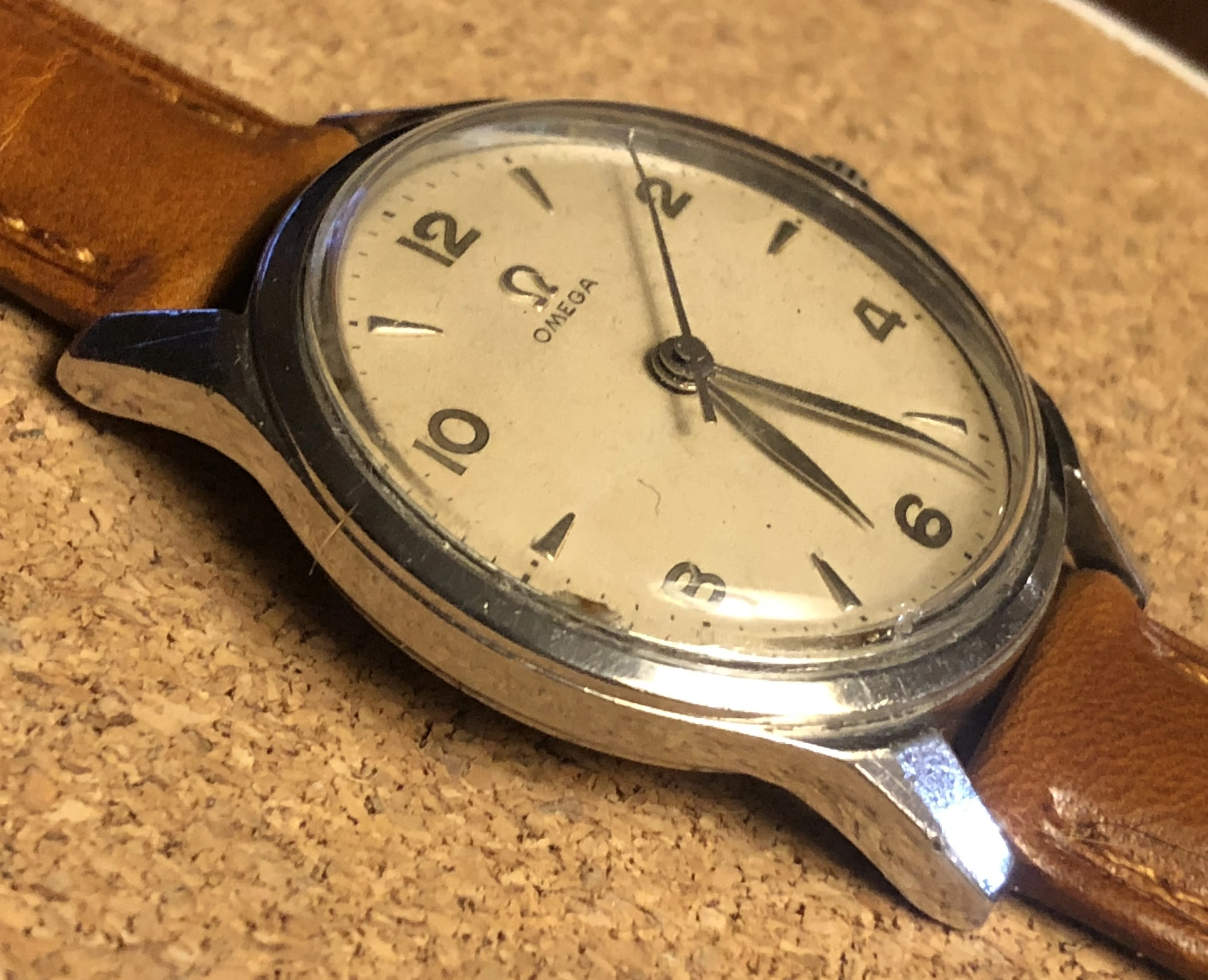 ·Next up is a nice starter piece, a hand-winding reference 2634 from approximately 1949. The dial has gilt even numerals alternating with daggers. The case is 33mm in diameter. The movement is a cal 371, which is a shock-protected member of the 28mm caliber family. Not serviced in my possession but it winds, sets, and runs. It is running slow, and a service is recommended if you plan to use it regularly. The case and dial exhibit wear and aging as shown in the photos. The watch comes with the unworn leather strap as shown.