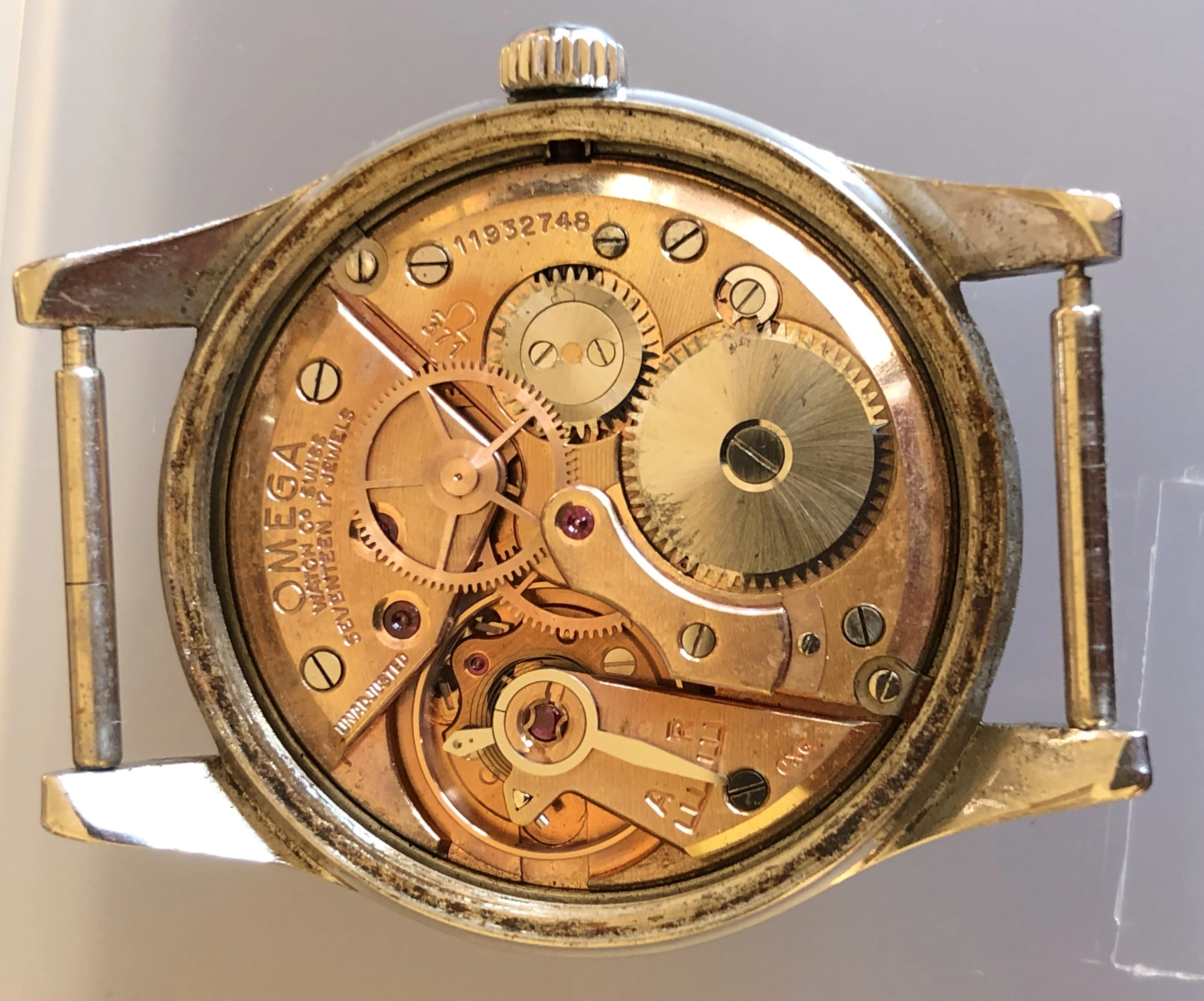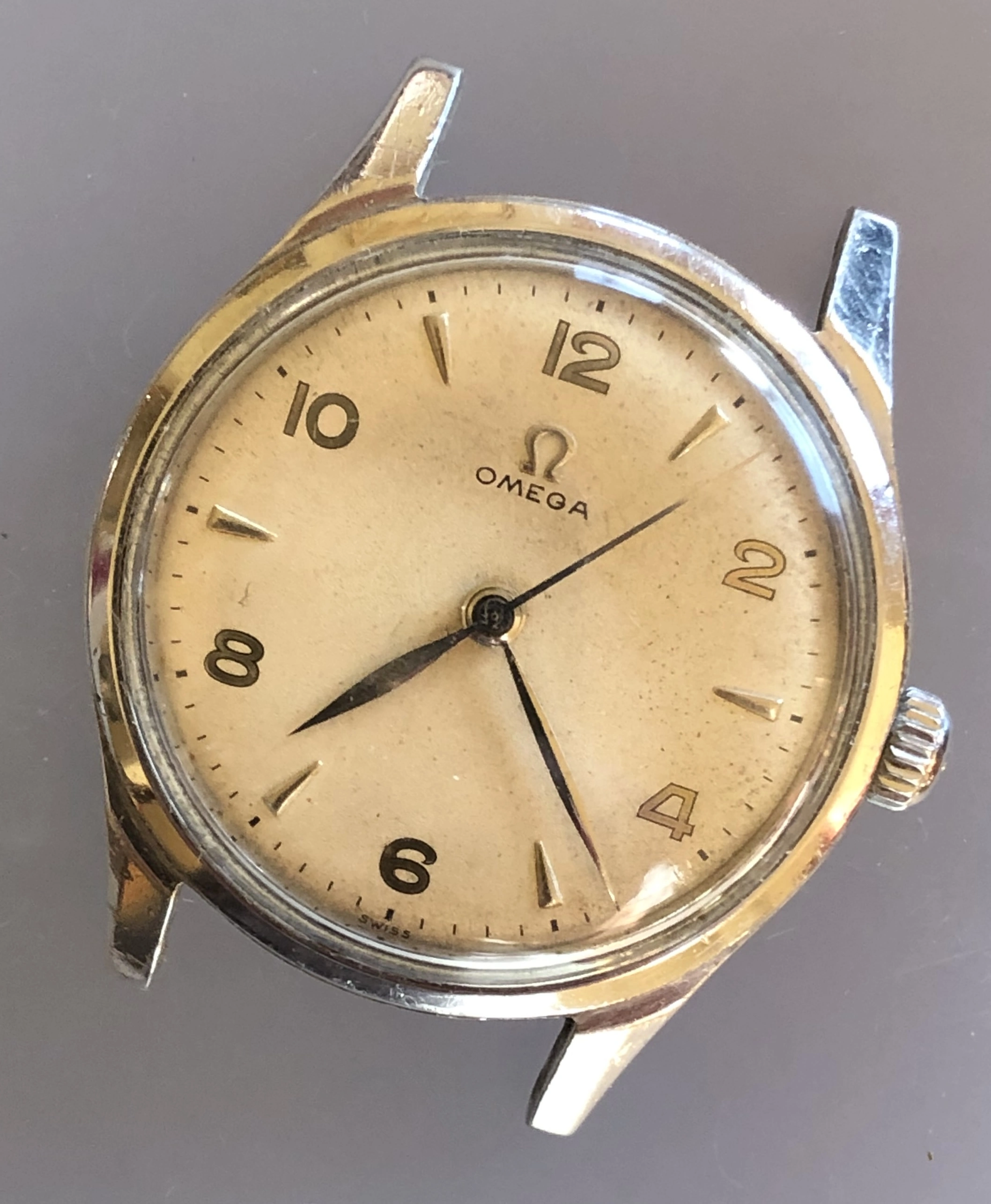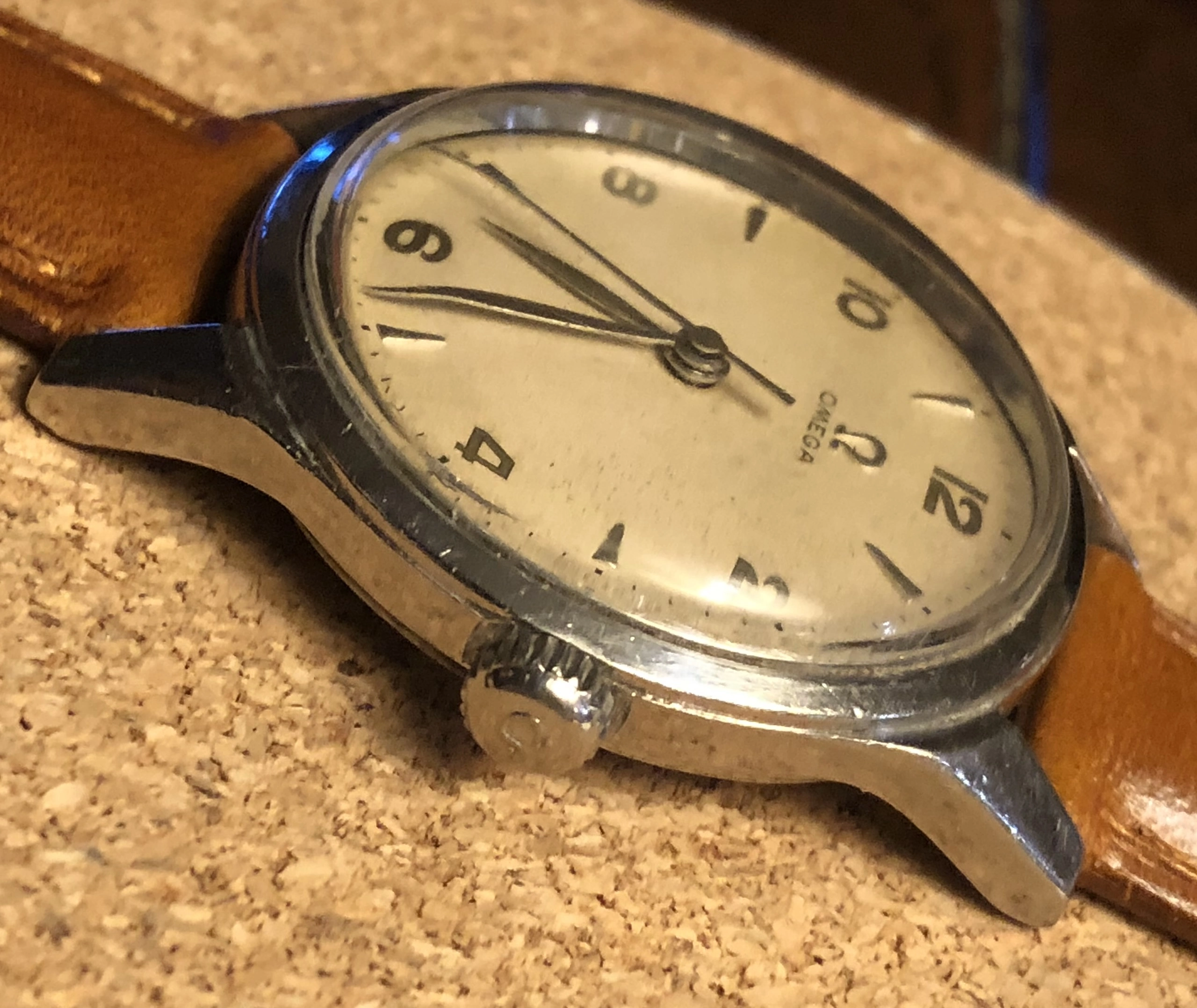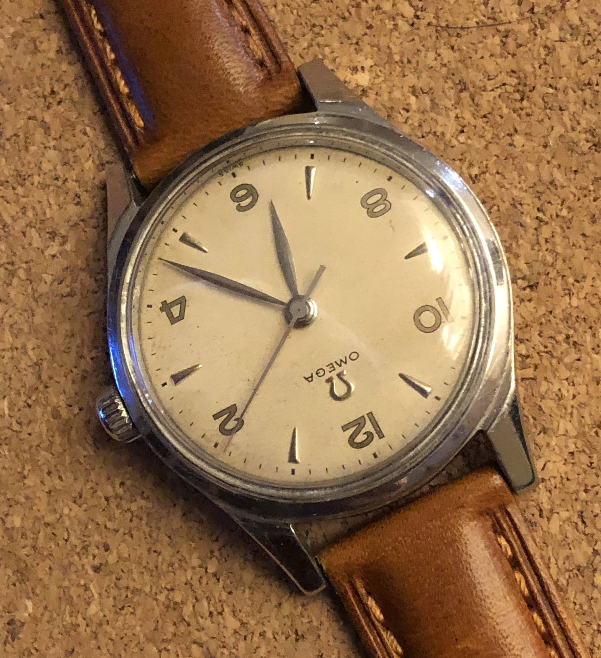 ·Next up is a nice starter piece, a hand-winding reference 2634 from approximately 1949. The dial has gilt even numerals alternating with daggers. The case is 33mm in diameter. The movement is a cal 371, which is a shock-protected member of the 28mm caliber family. Not serviced in my possession but it winds, sets, and runs. It is running slow, and a service is recommended if you plan to use it regularly. The case and dial exhibit wear and aging as shown in the photos. The watch comes with the unworn leather strap as shown.
