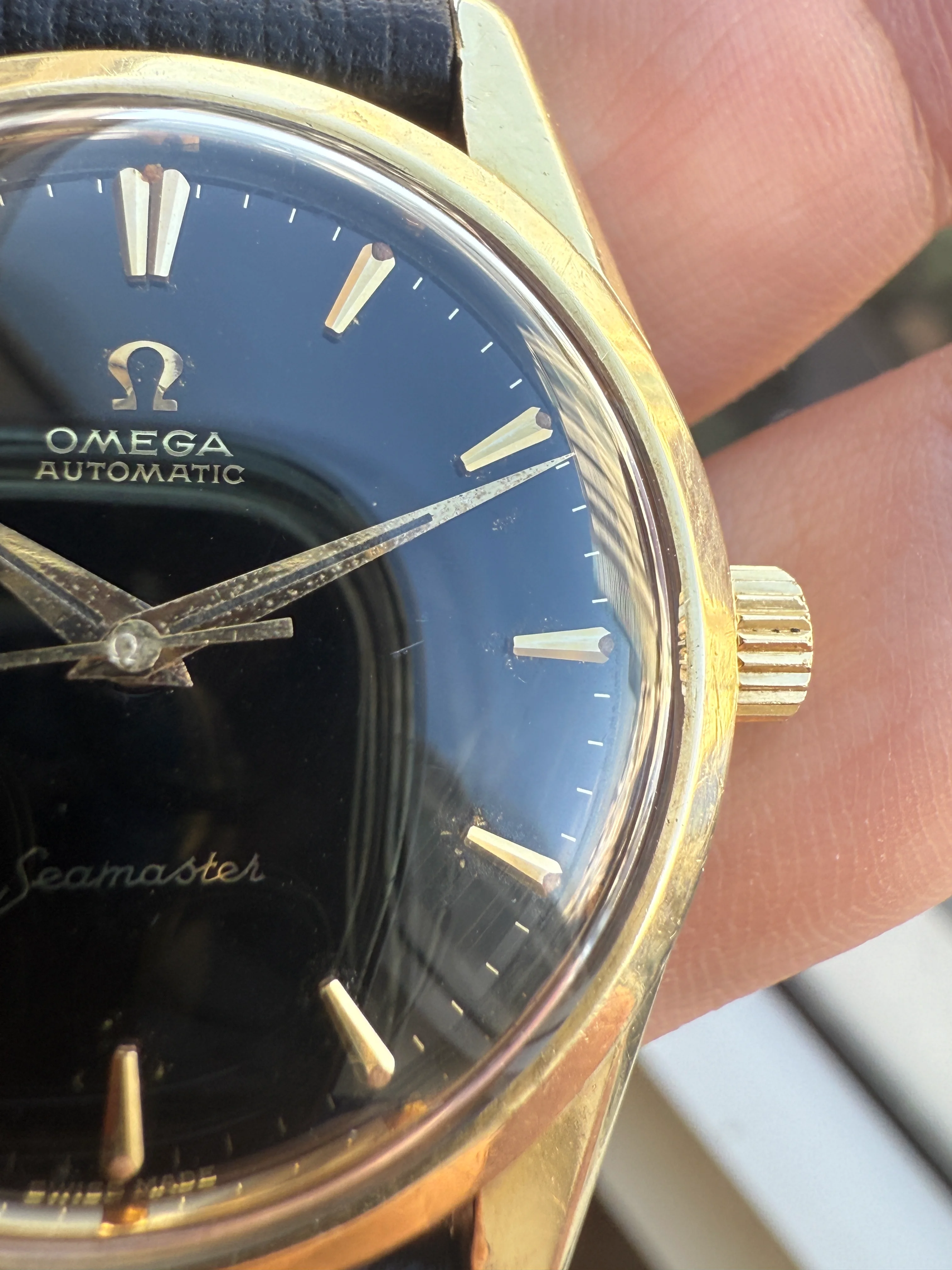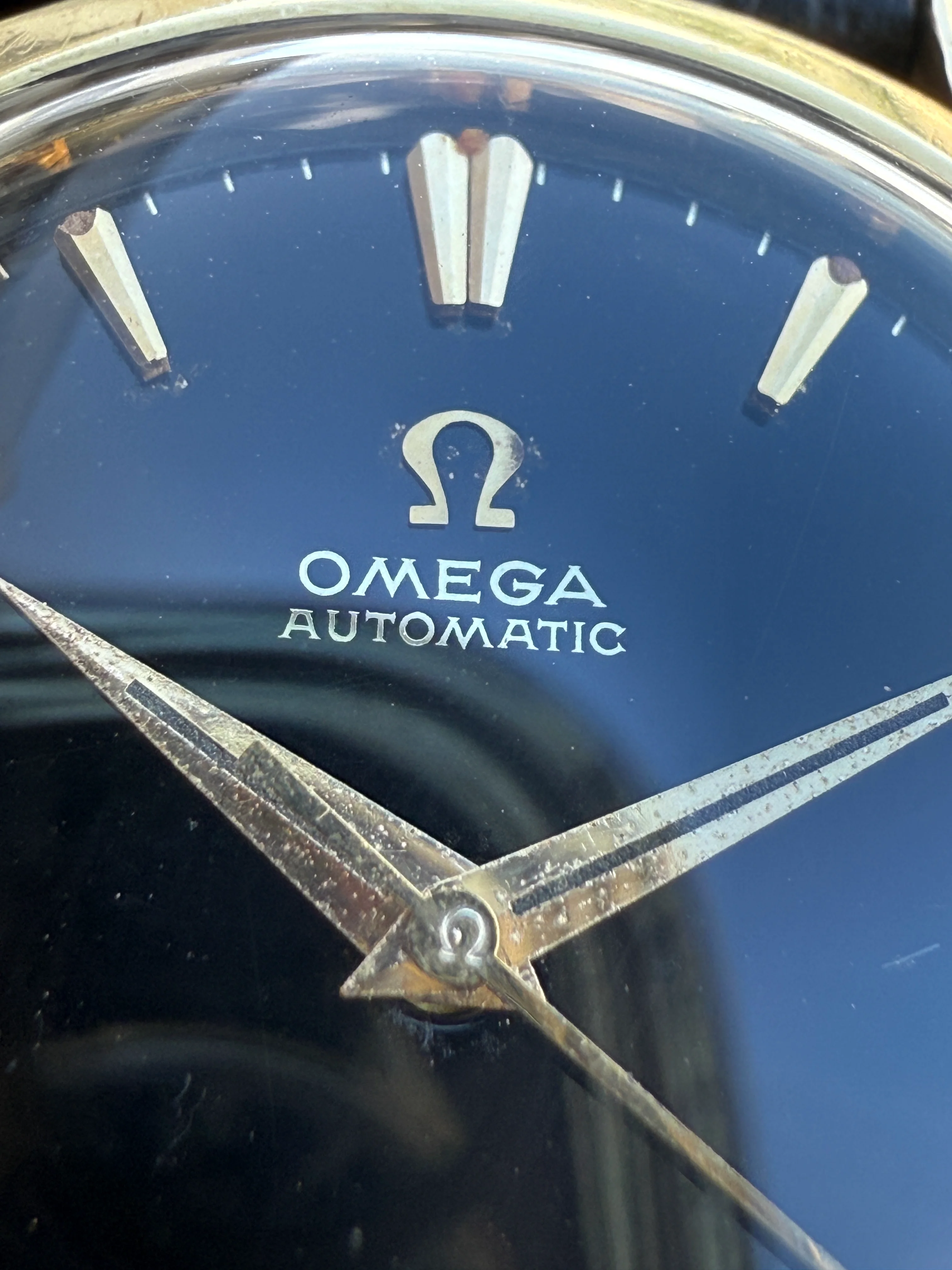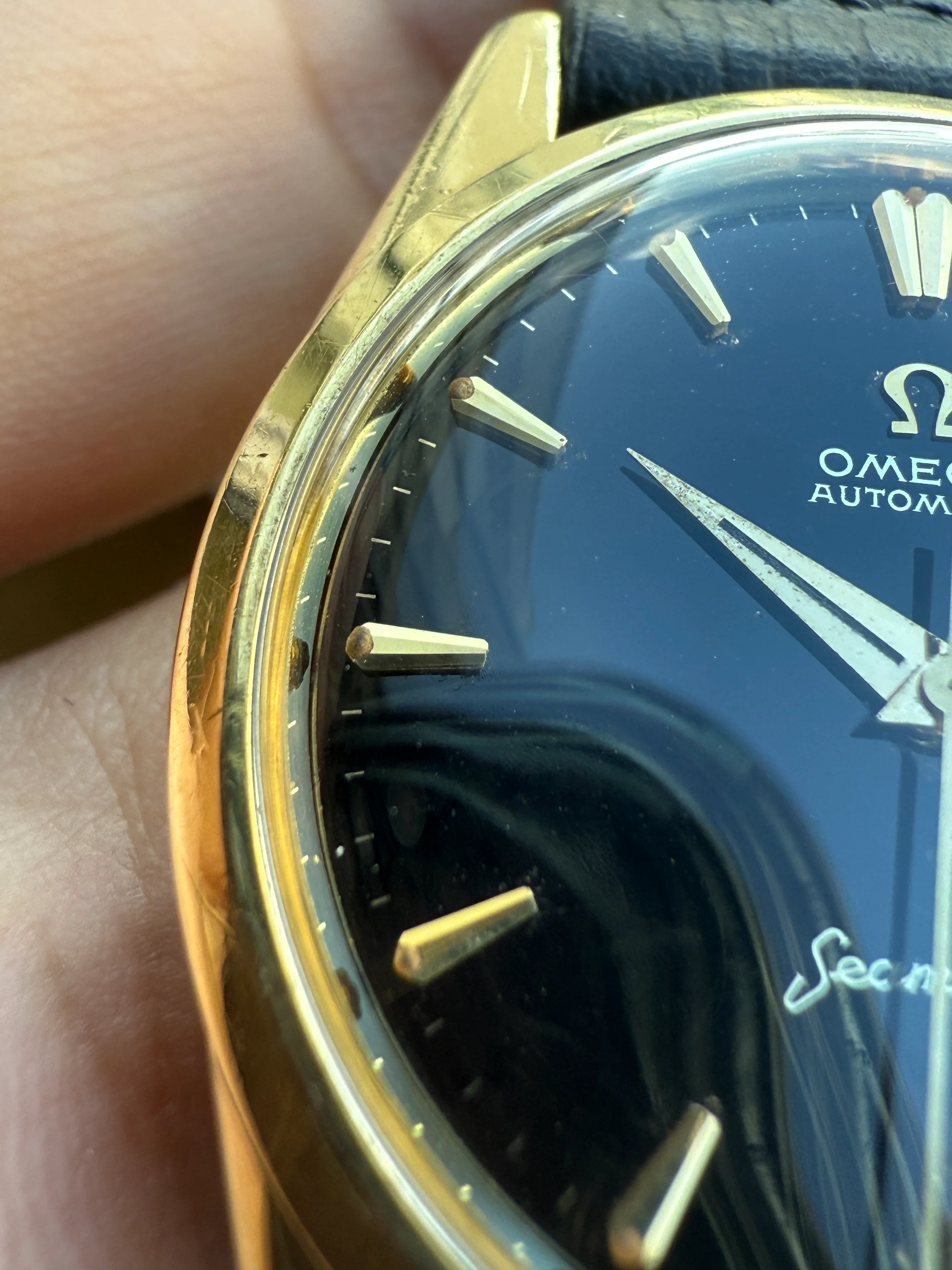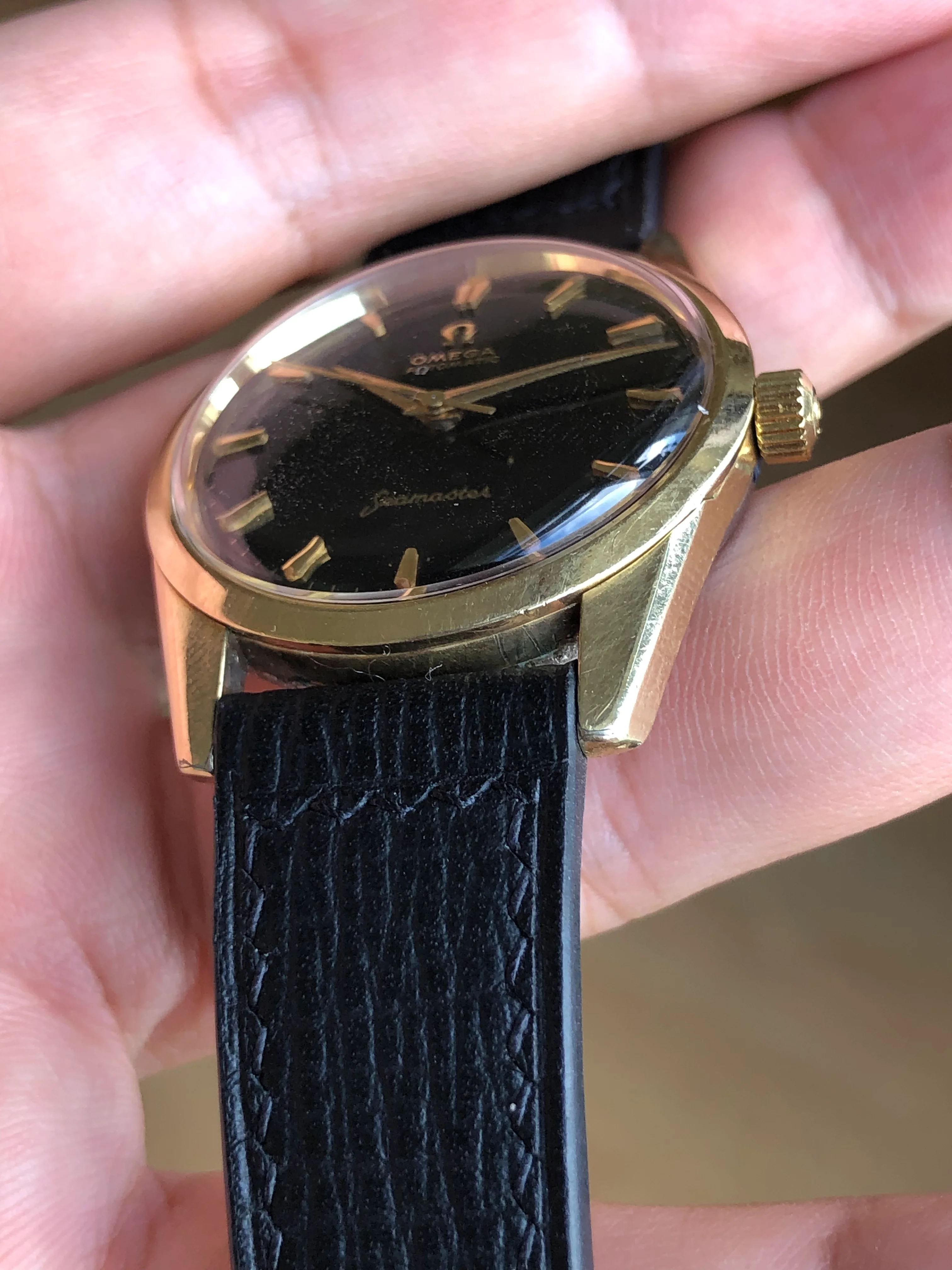 - Dial: Original gloss black gilt dial in very good condition; the dial start getting patinated around the hour markers. Applied Omega logo. The lume on hands and faceted hour markers are intact; no-date; dauphine hands; prints, hands and hour markers are all good.