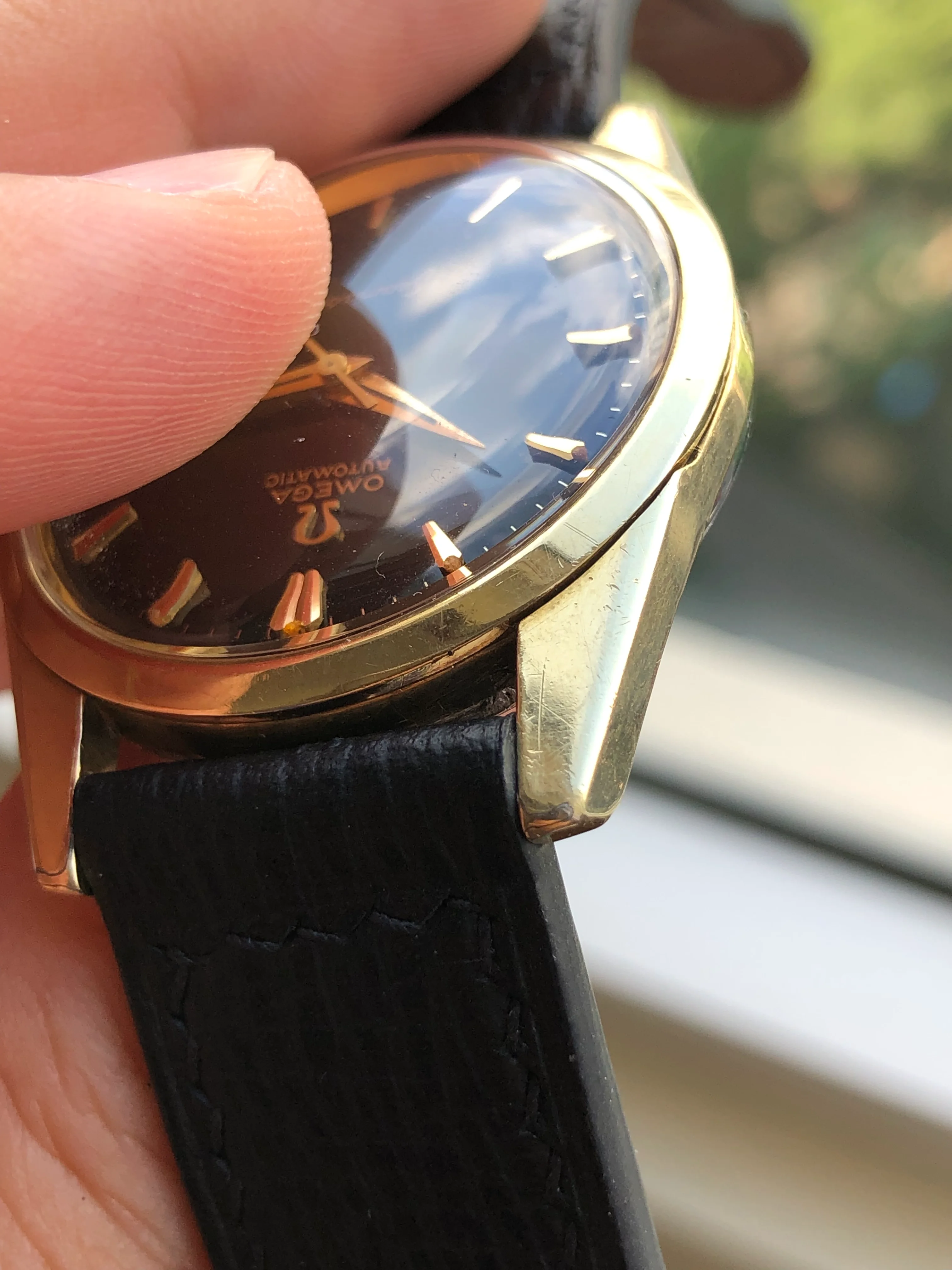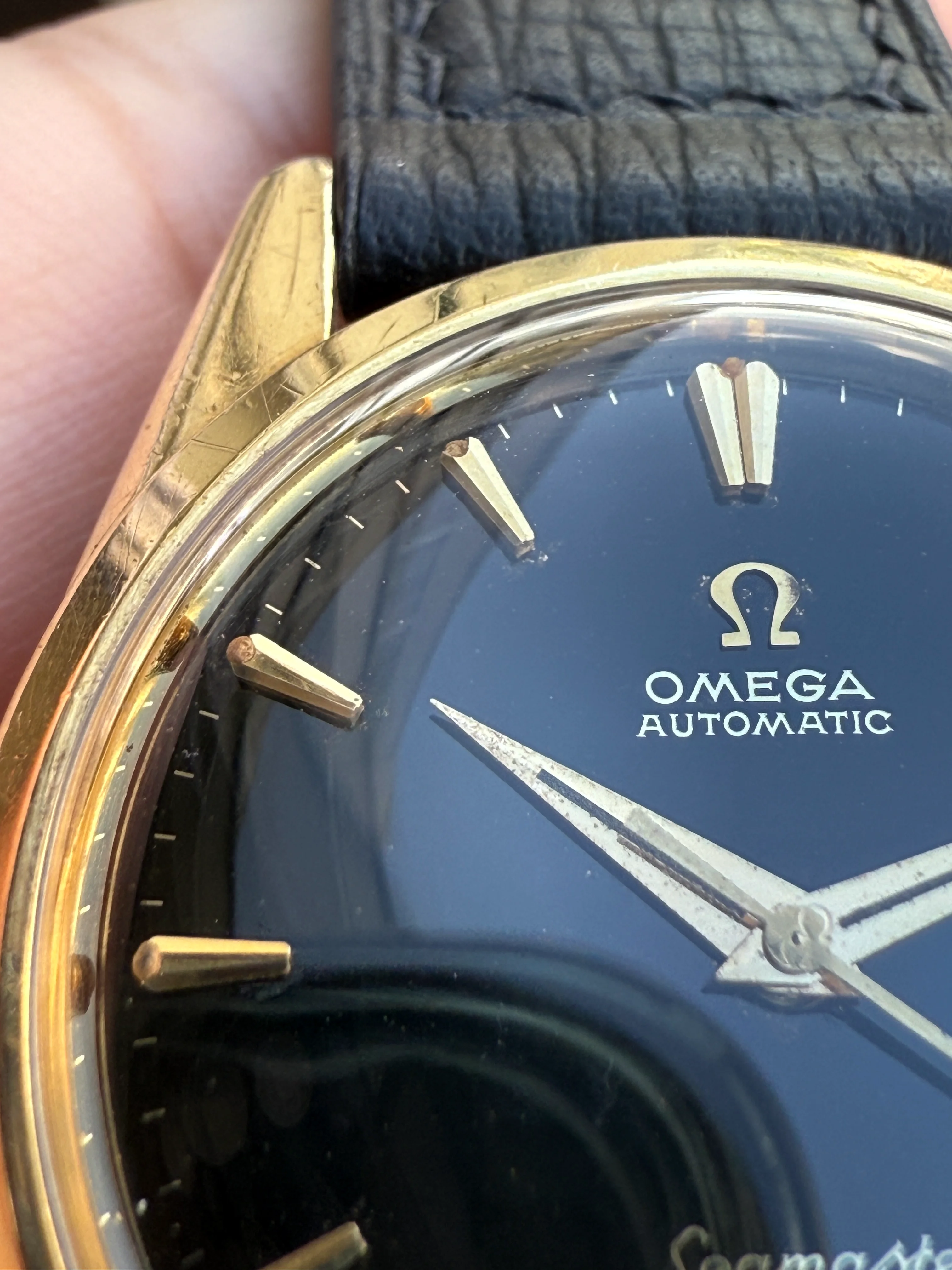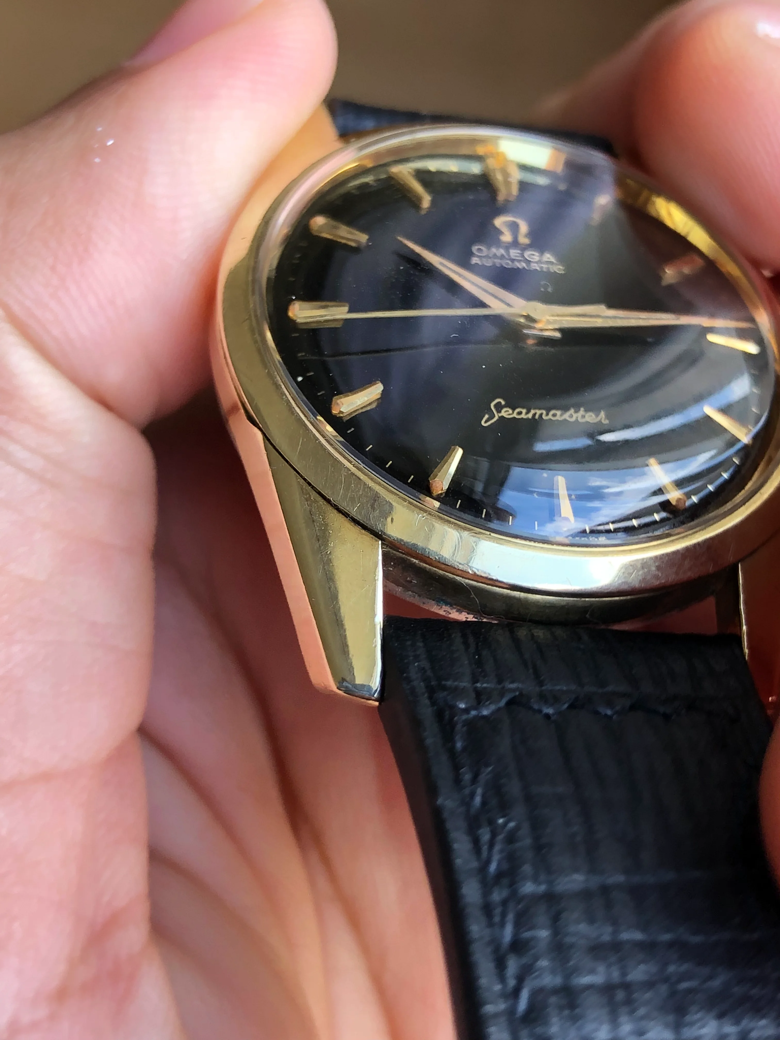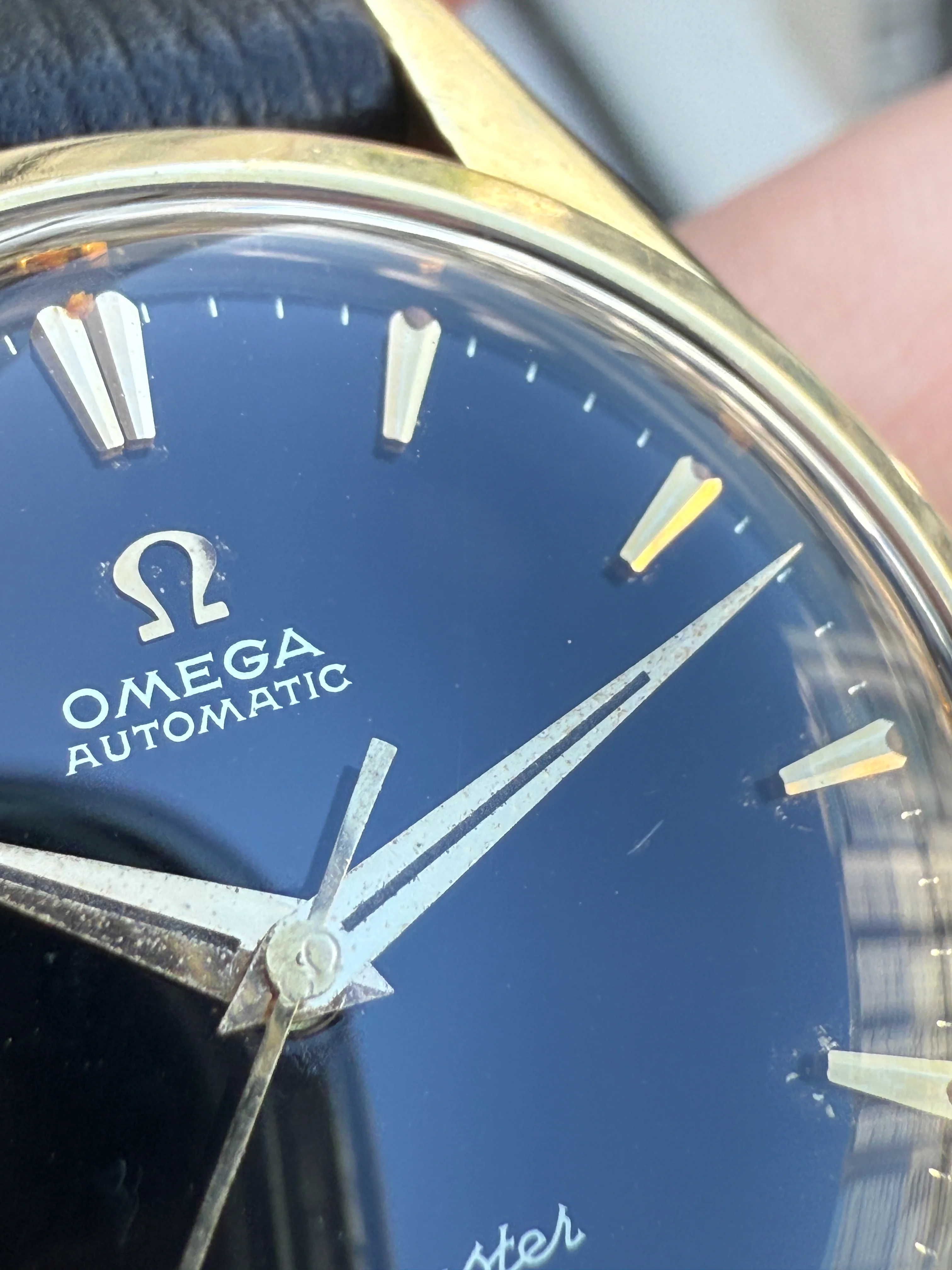 - Dial: Original gloss black gilt dial in very good condition; the dial start getting patinated around the hour markers. Applied Omega logo. The lume on hands and faceted hour markers are intact; no-date; dauphine hands; prints, hands and hour markers are all good.