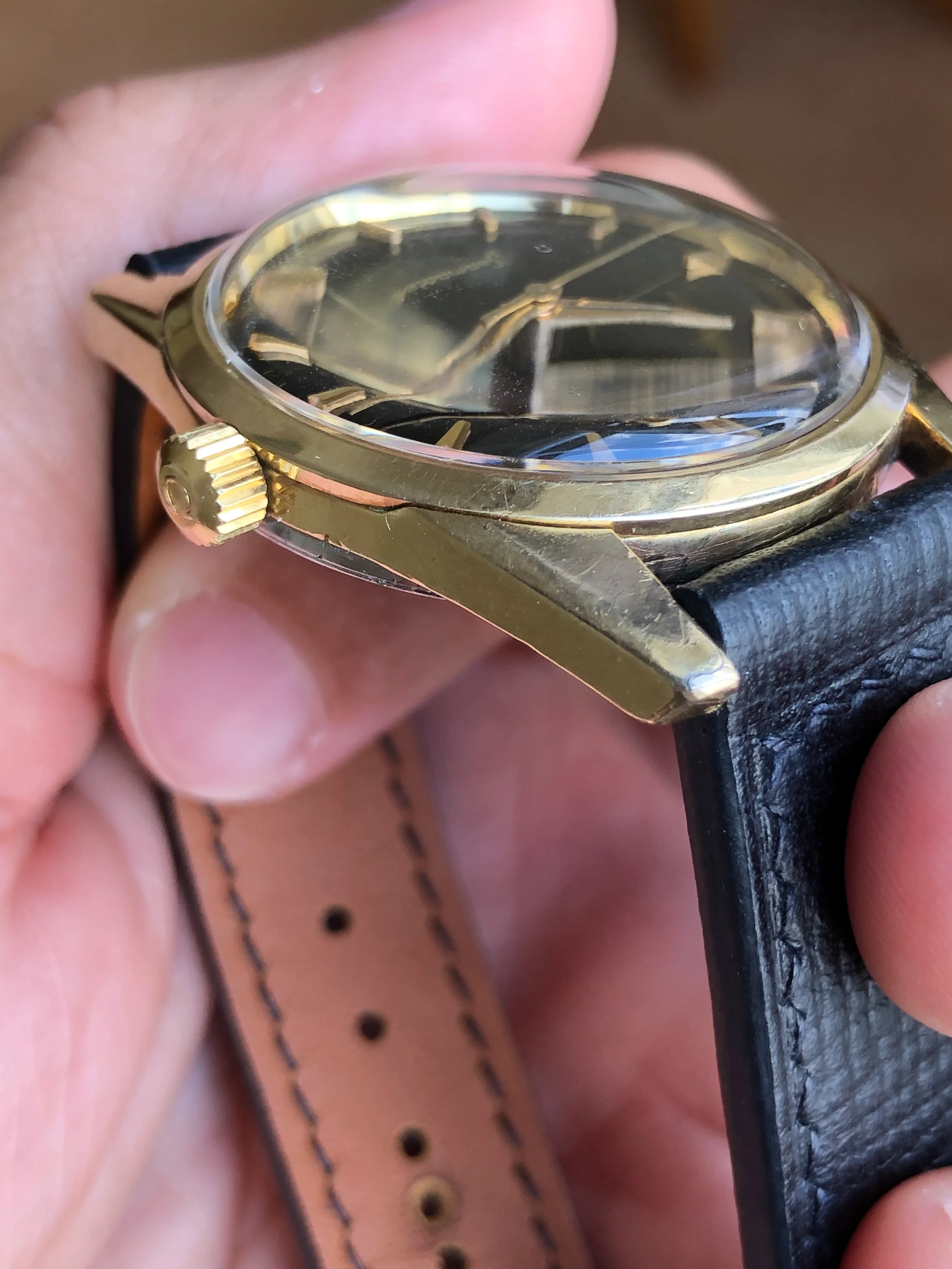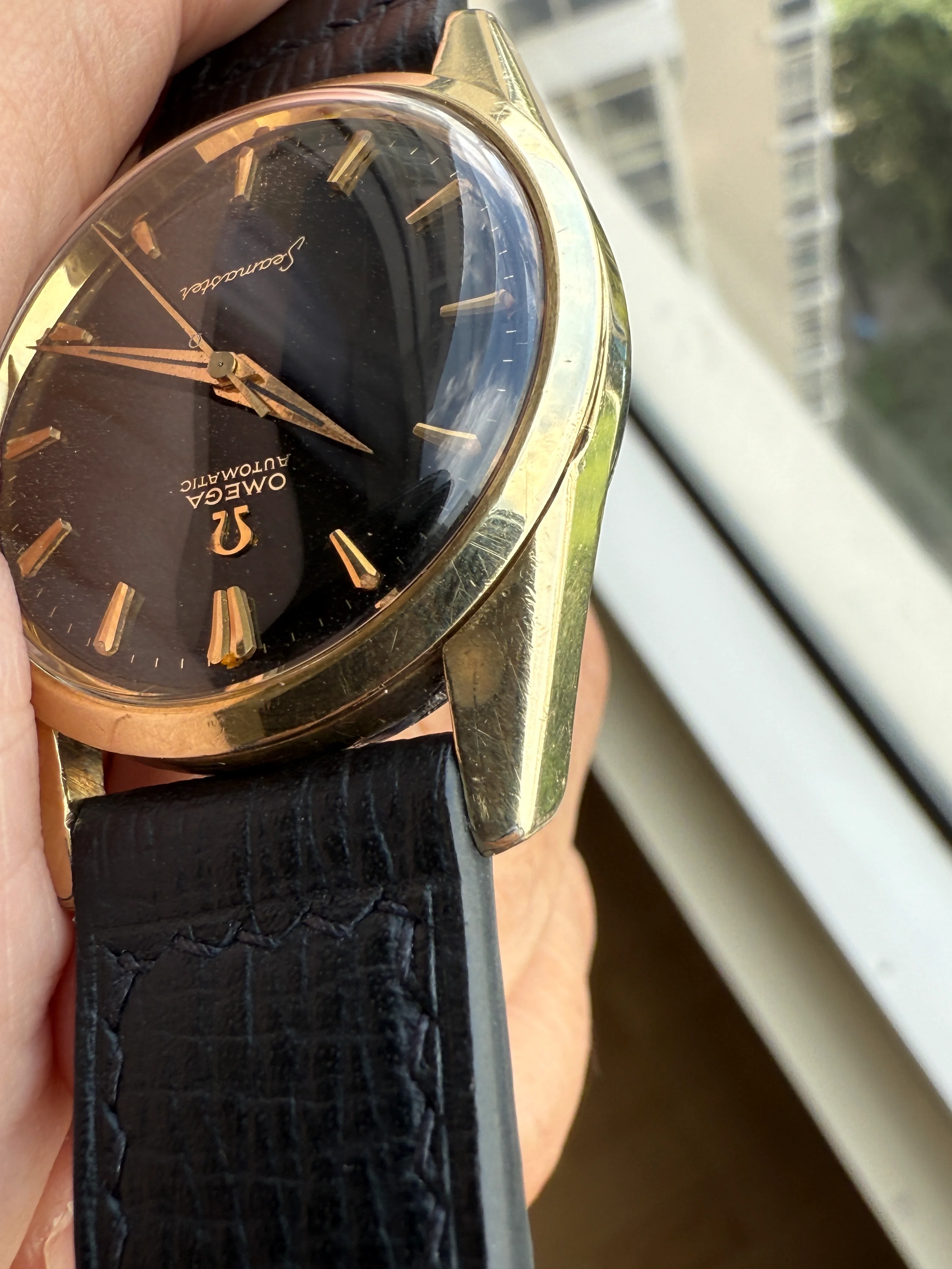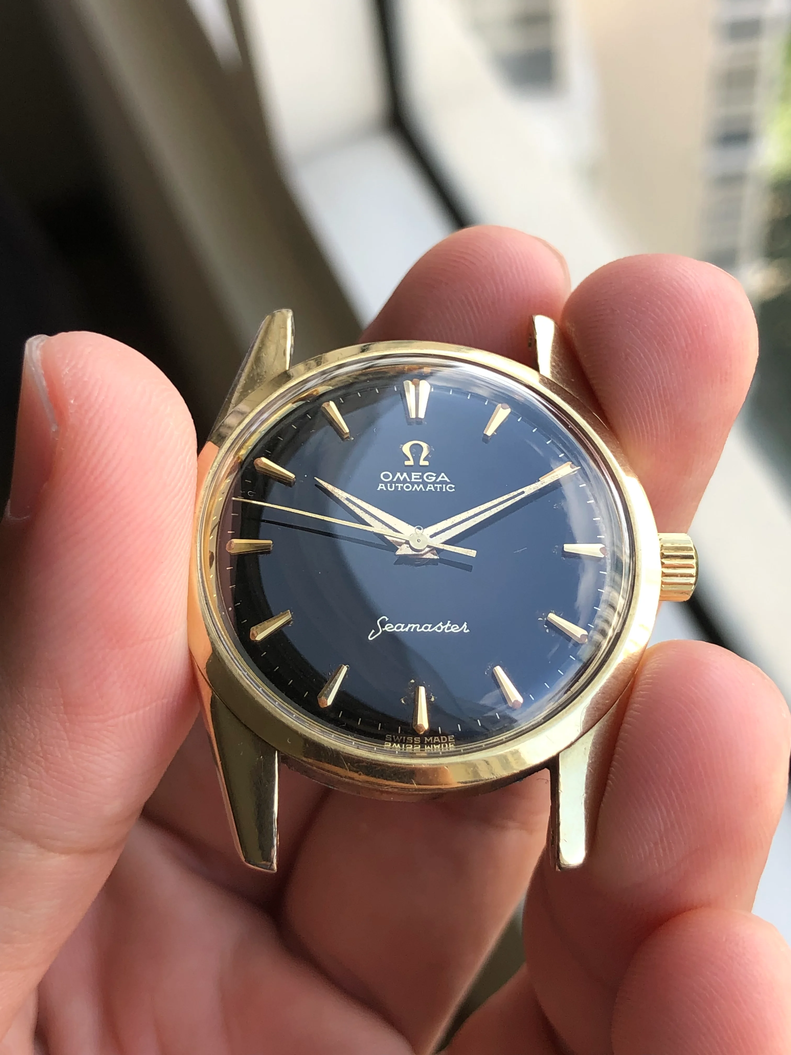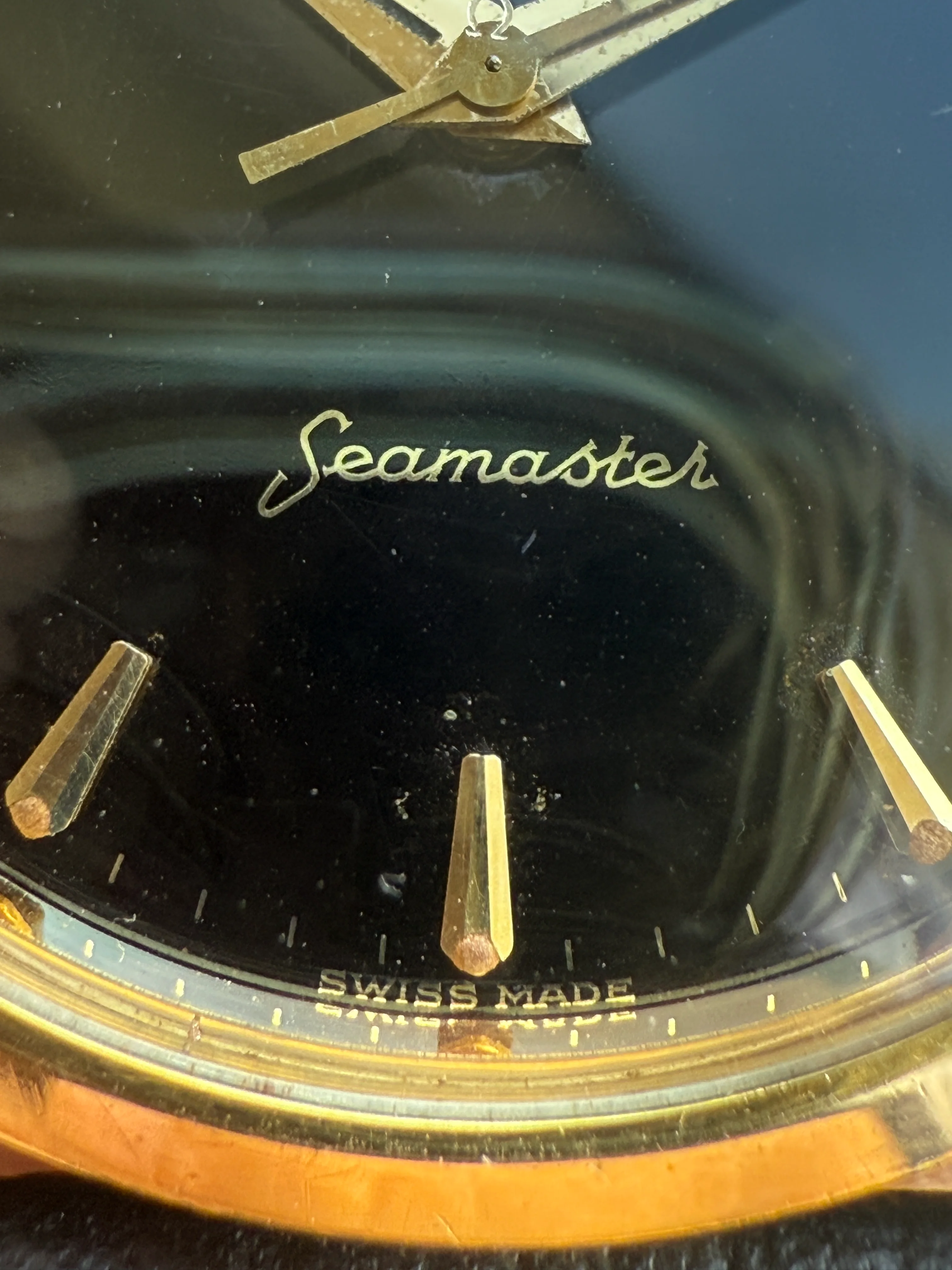 - Dial: Original gloss black gilt dial in very good condition; the dial start getting patinated around the hour markers. Applied Omega logo. The lume on hands and faceted hour markers are intact; no-date; dauphine hands; prints, hands and hour markers are all good.