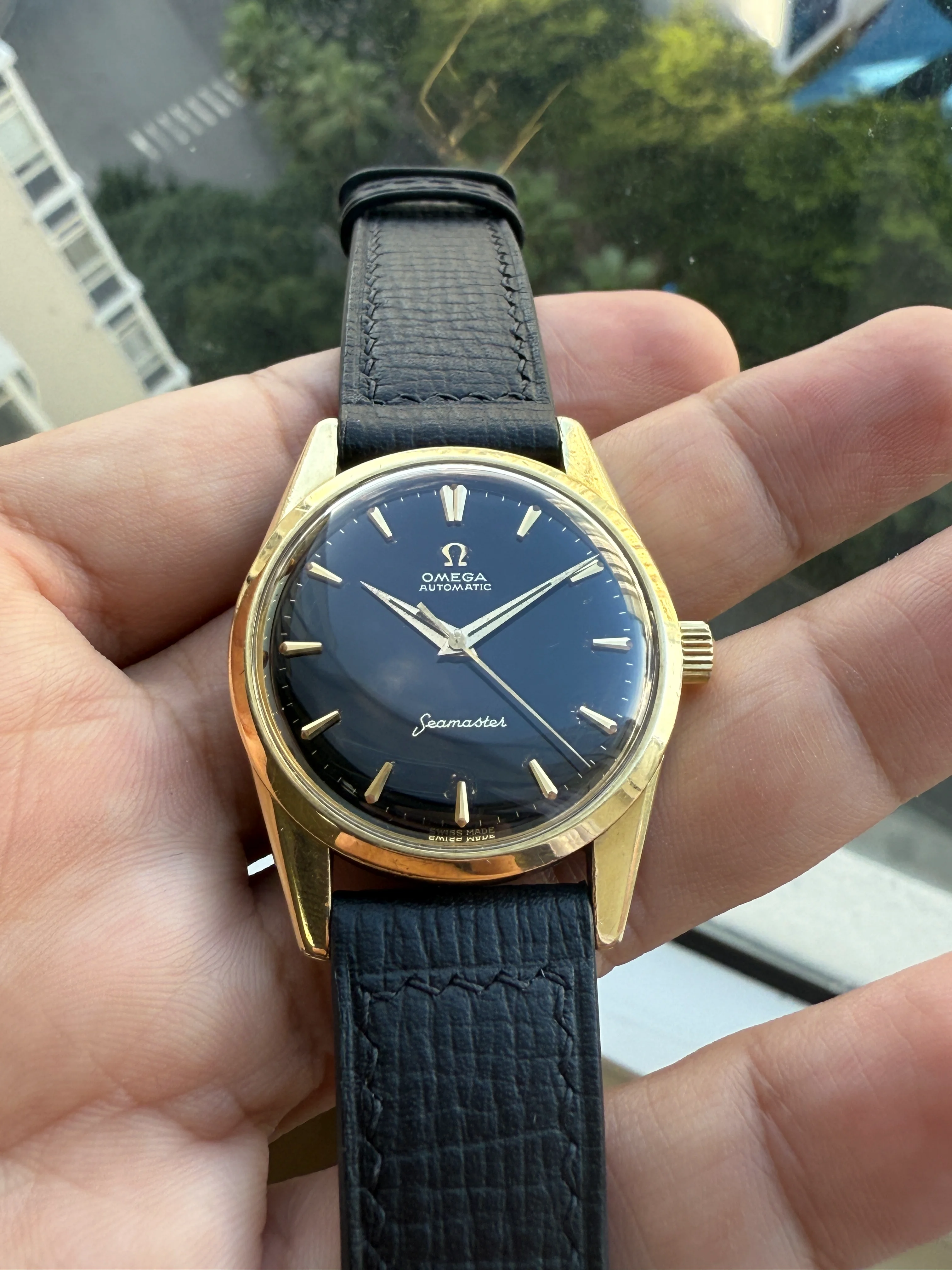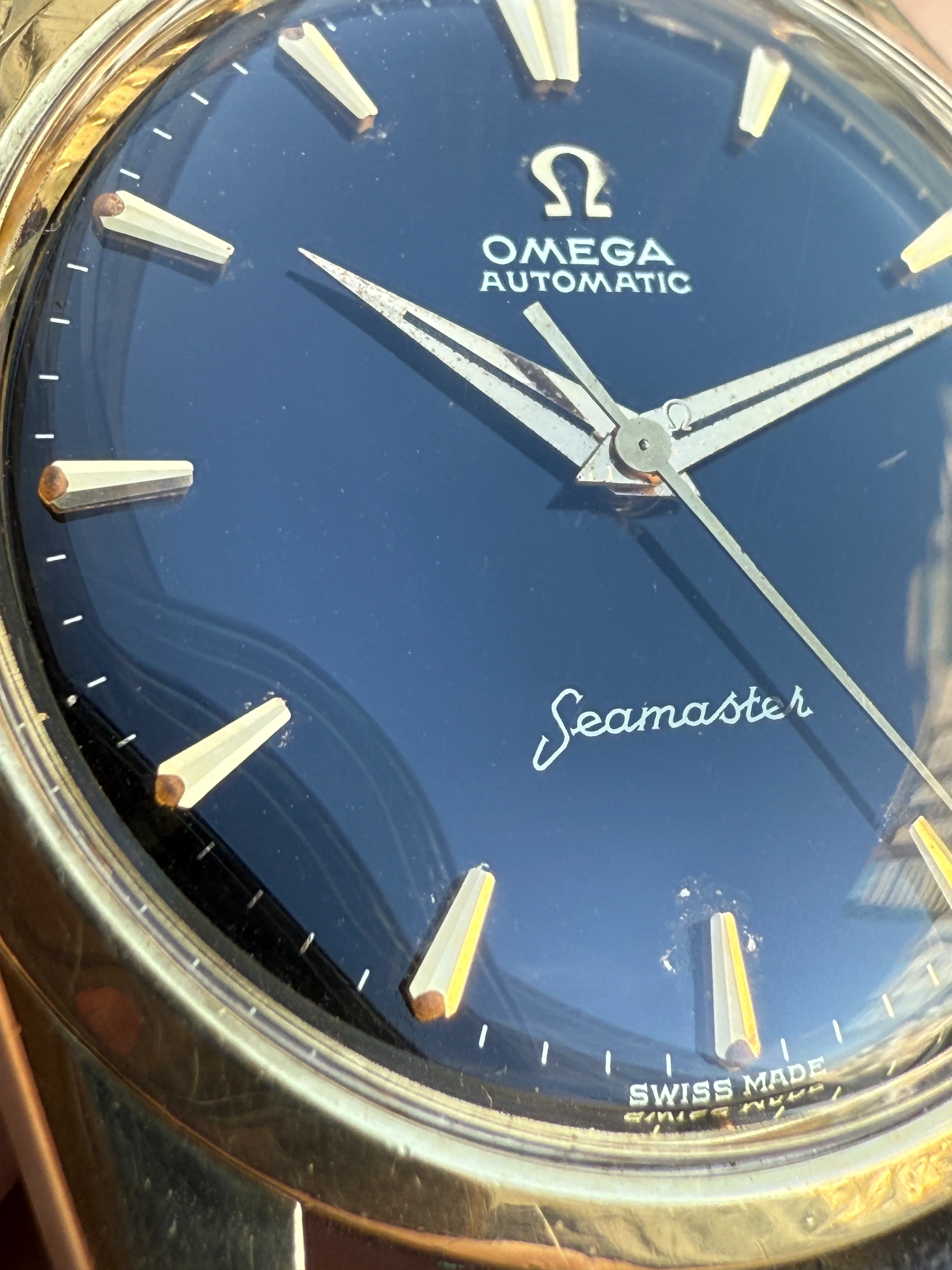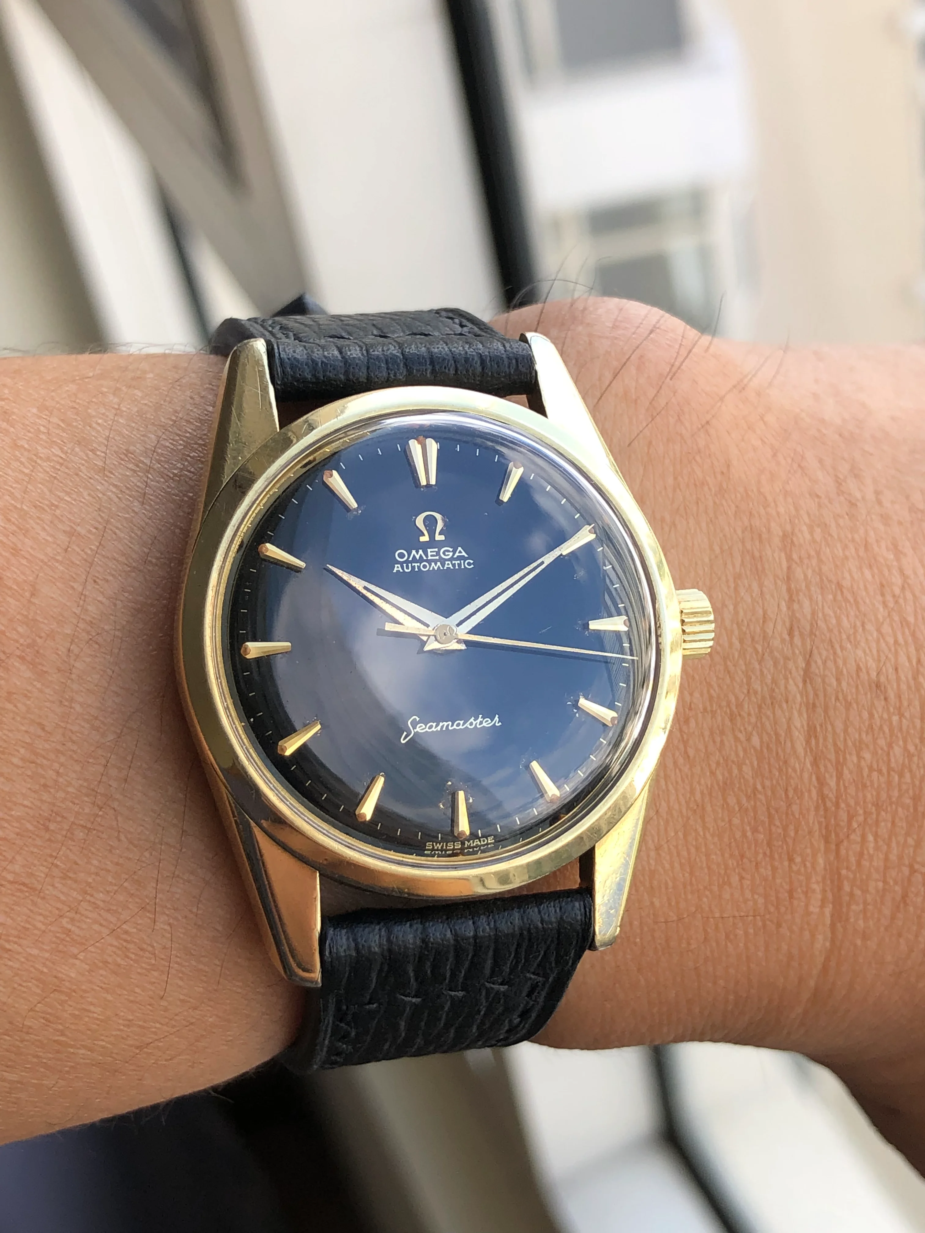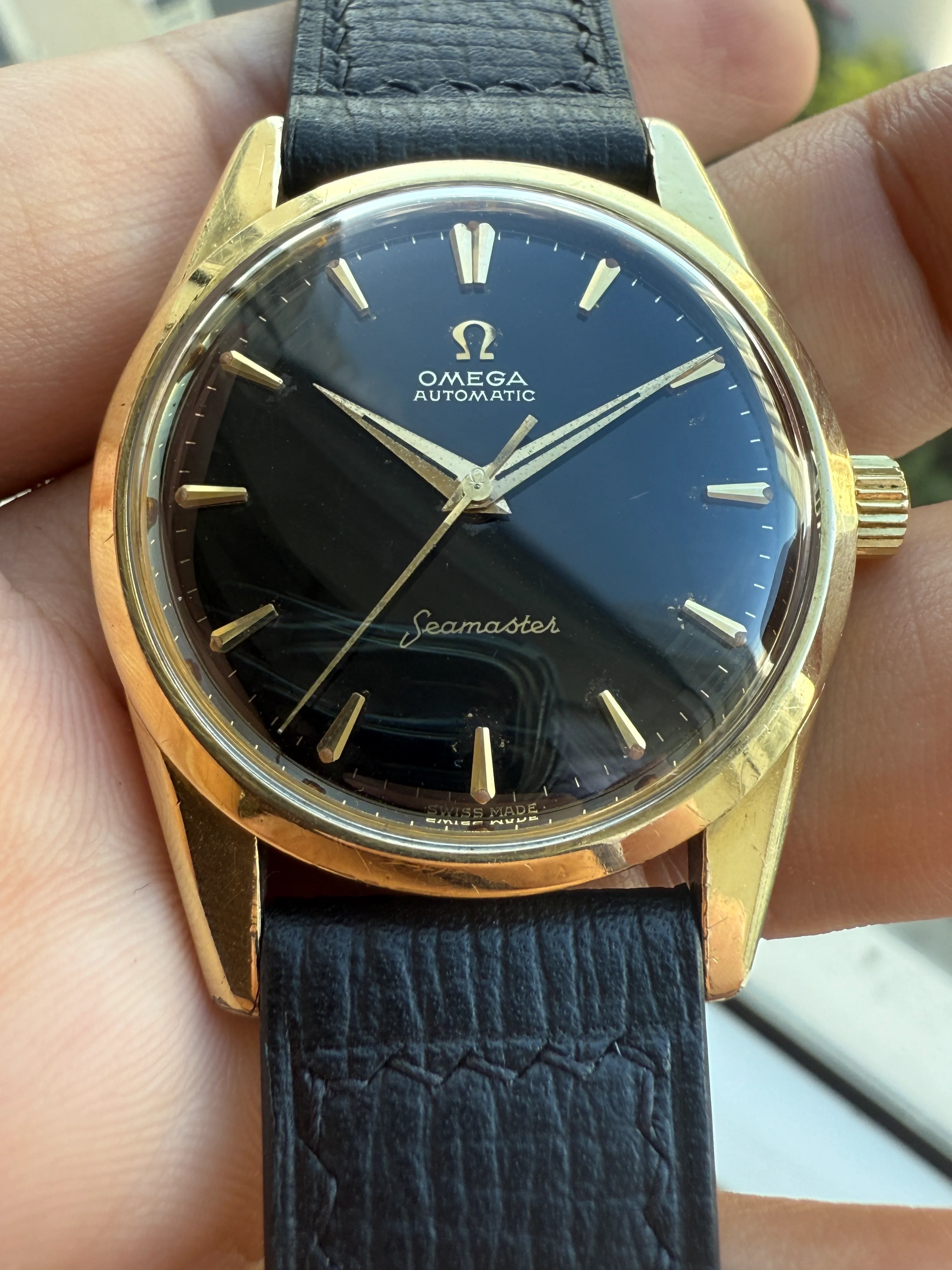 - Dial: Original gloss black gilt dial in very good condition; the dial start getting patinated around the hour markers. Applied Omega logo. The lume on hands and faceted hour markers are intact; no-date; dauphine hands; prints, hands and hour markers are all good.