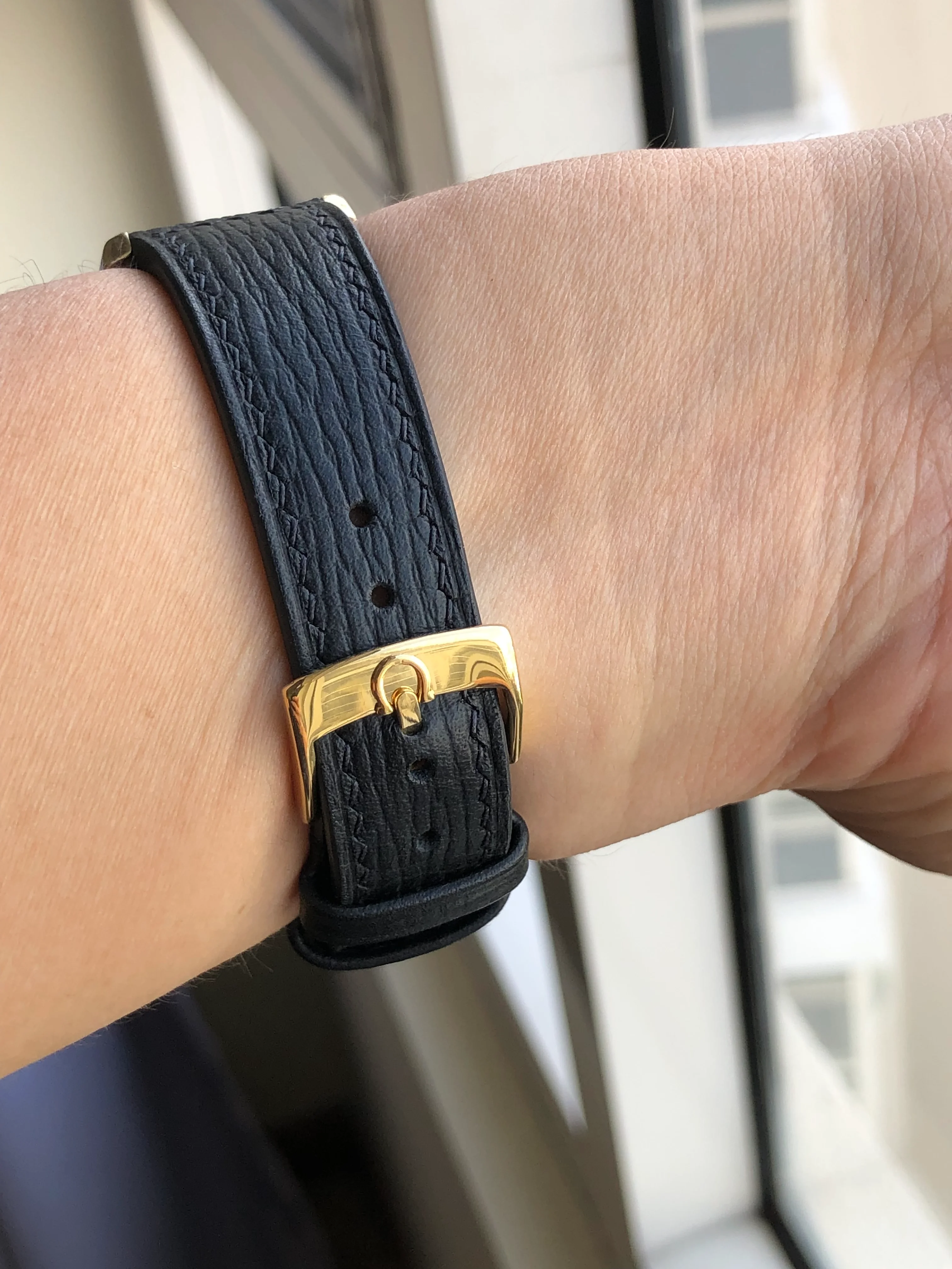 - Strap: Handmade black leather strap with smart spring bars generic gold plated buckle.