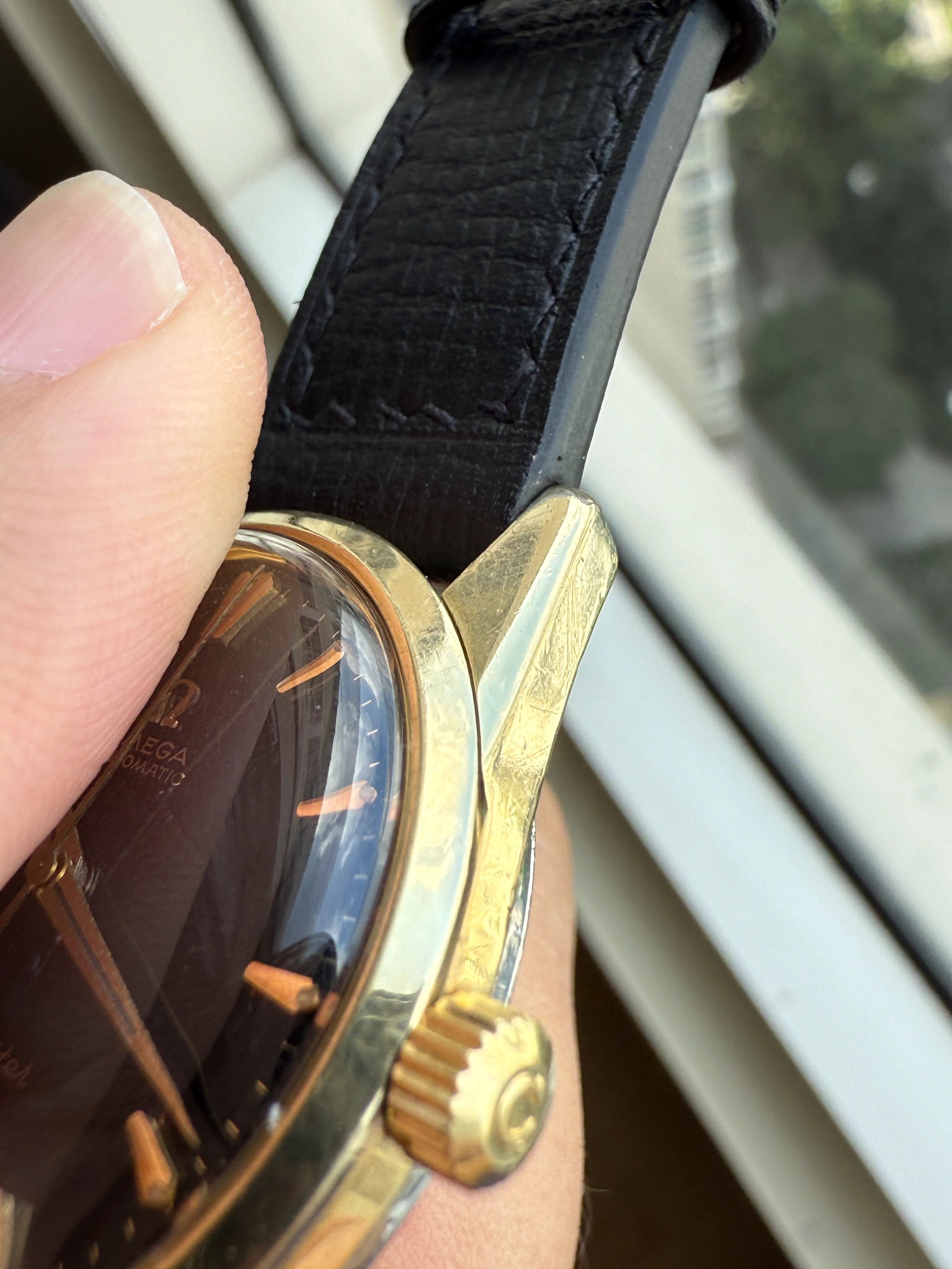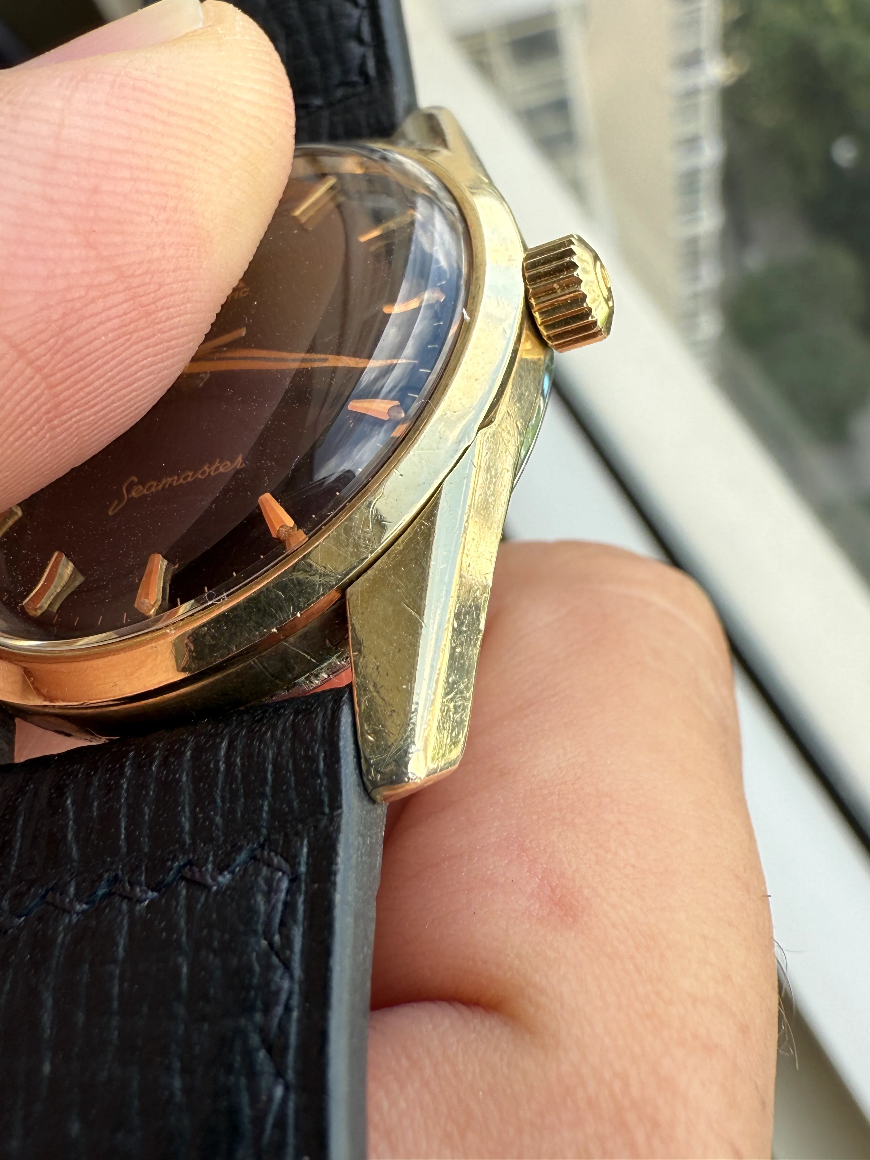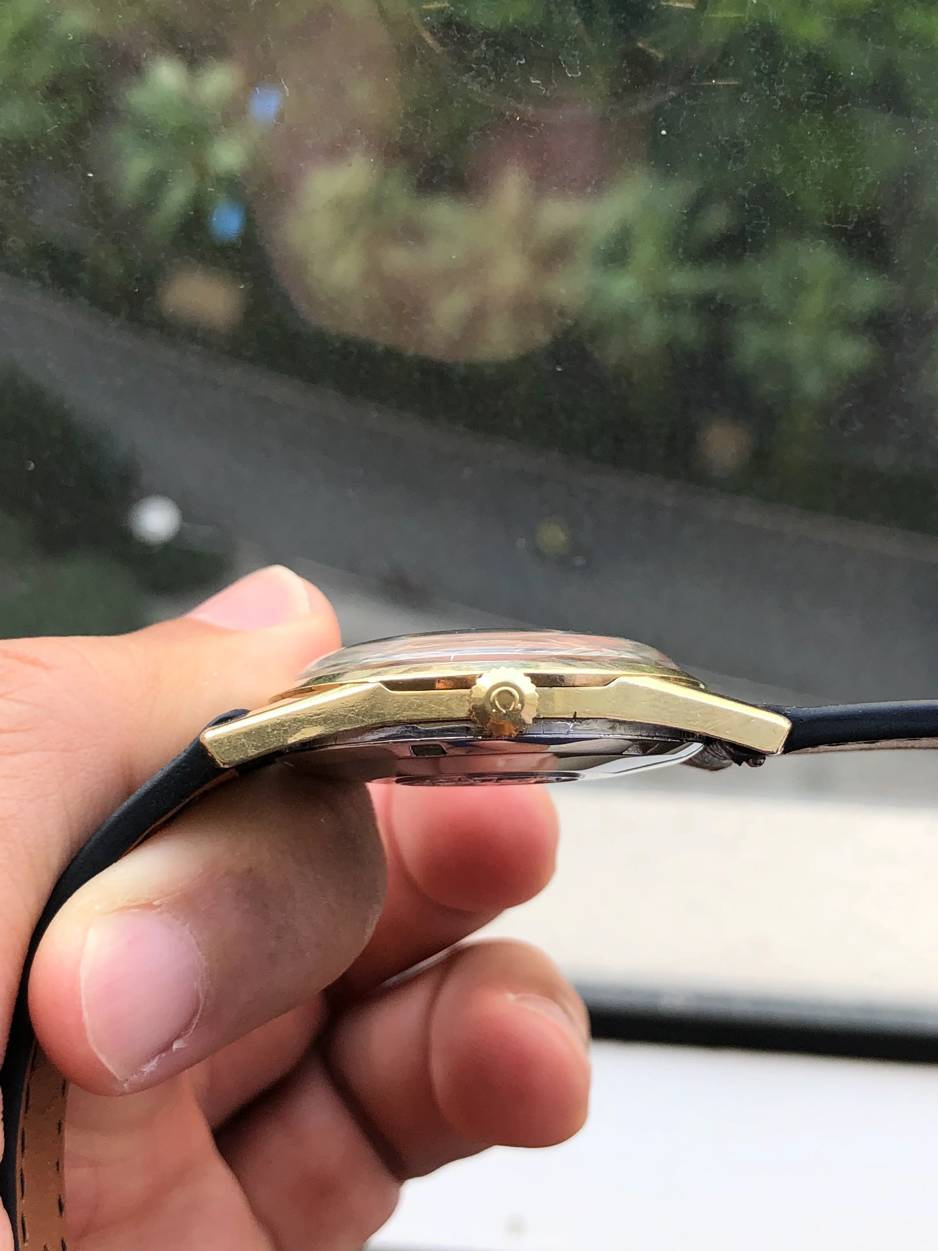- Case: The diameter is 33.5mm without the crown. Original case is in okay condition (a bit soft IMO) with small scratches. Omega knurled crown.