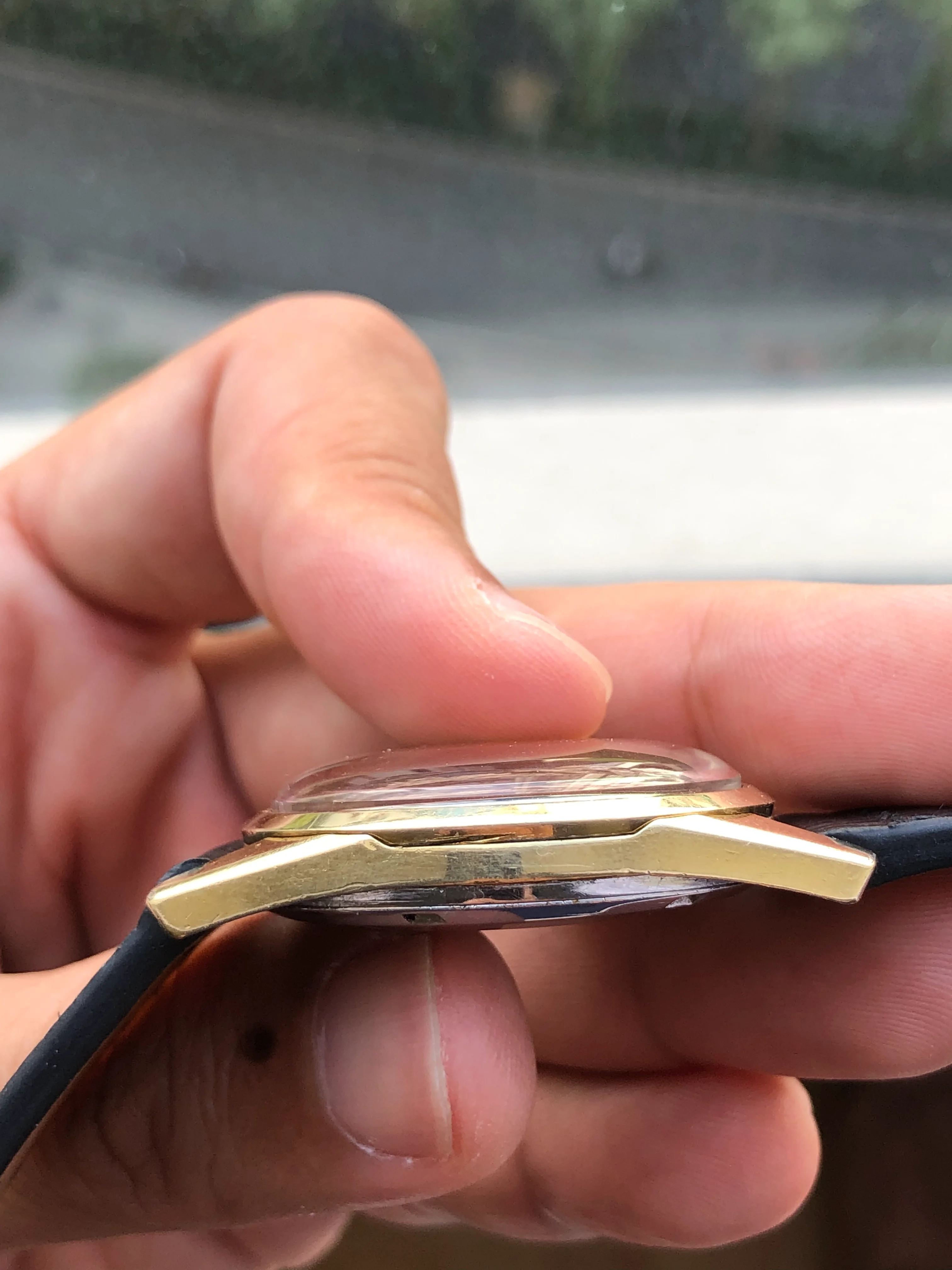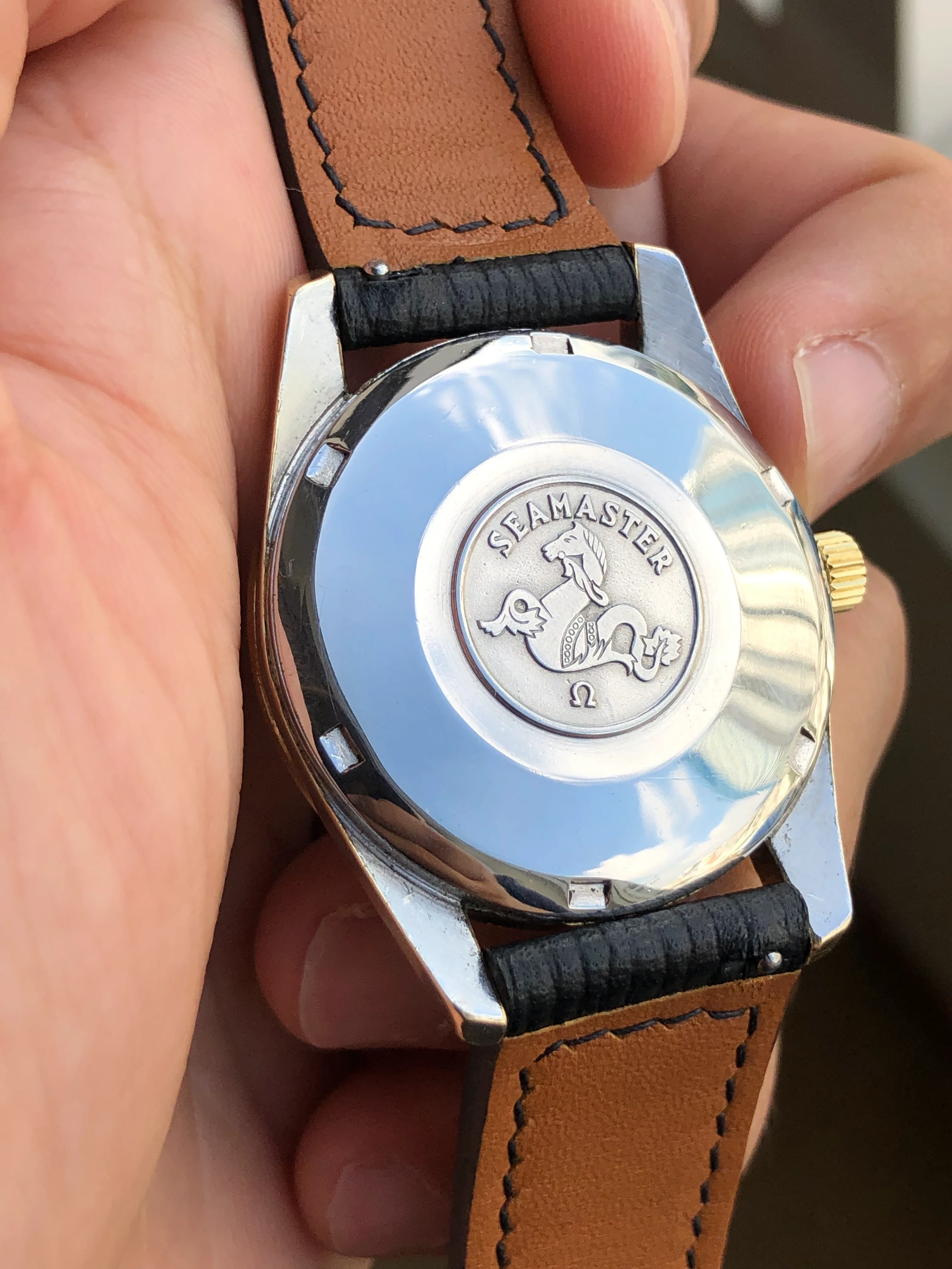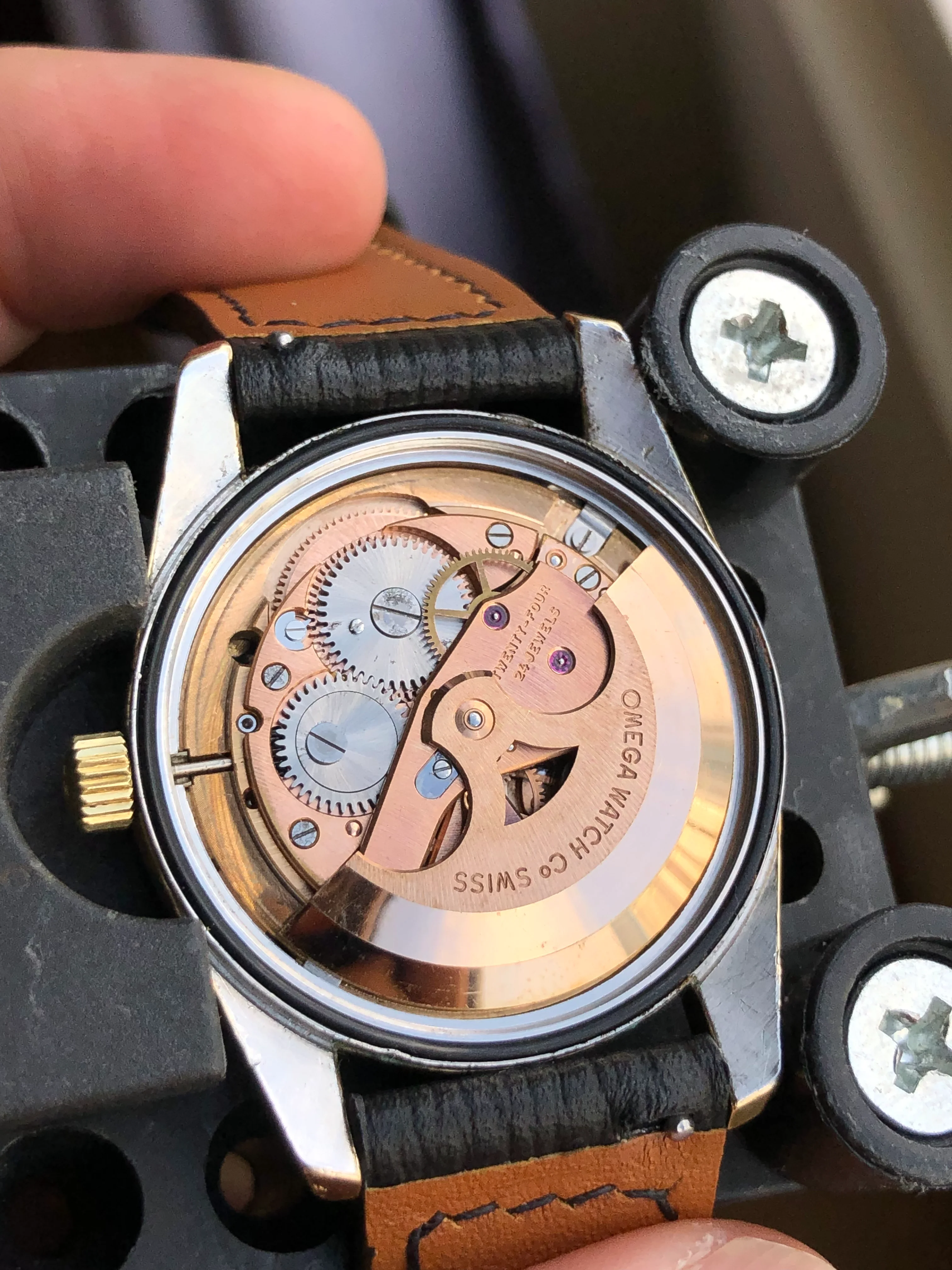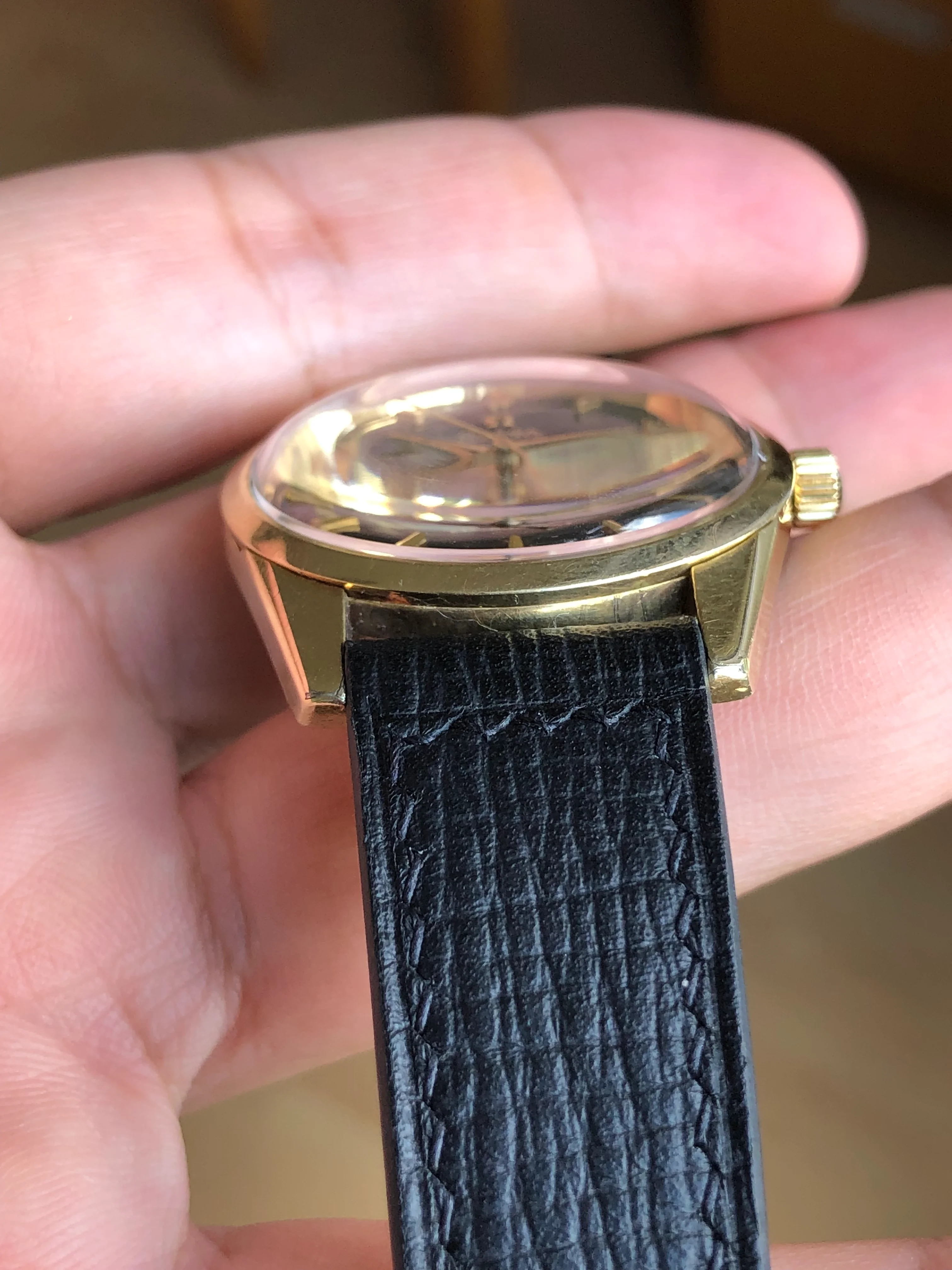 - Case: The diameter is 33.5mm without the crown. Original case is in okay condition (a bit soft IMO) with small scratches. Omega knurled crown.