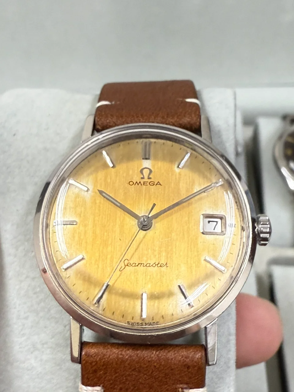 - Dial: Original evenly distributed brown patinated dial; date windown at 3; original hands and hour markers; lume on hour markers has been lost; hanger "Seamaster".