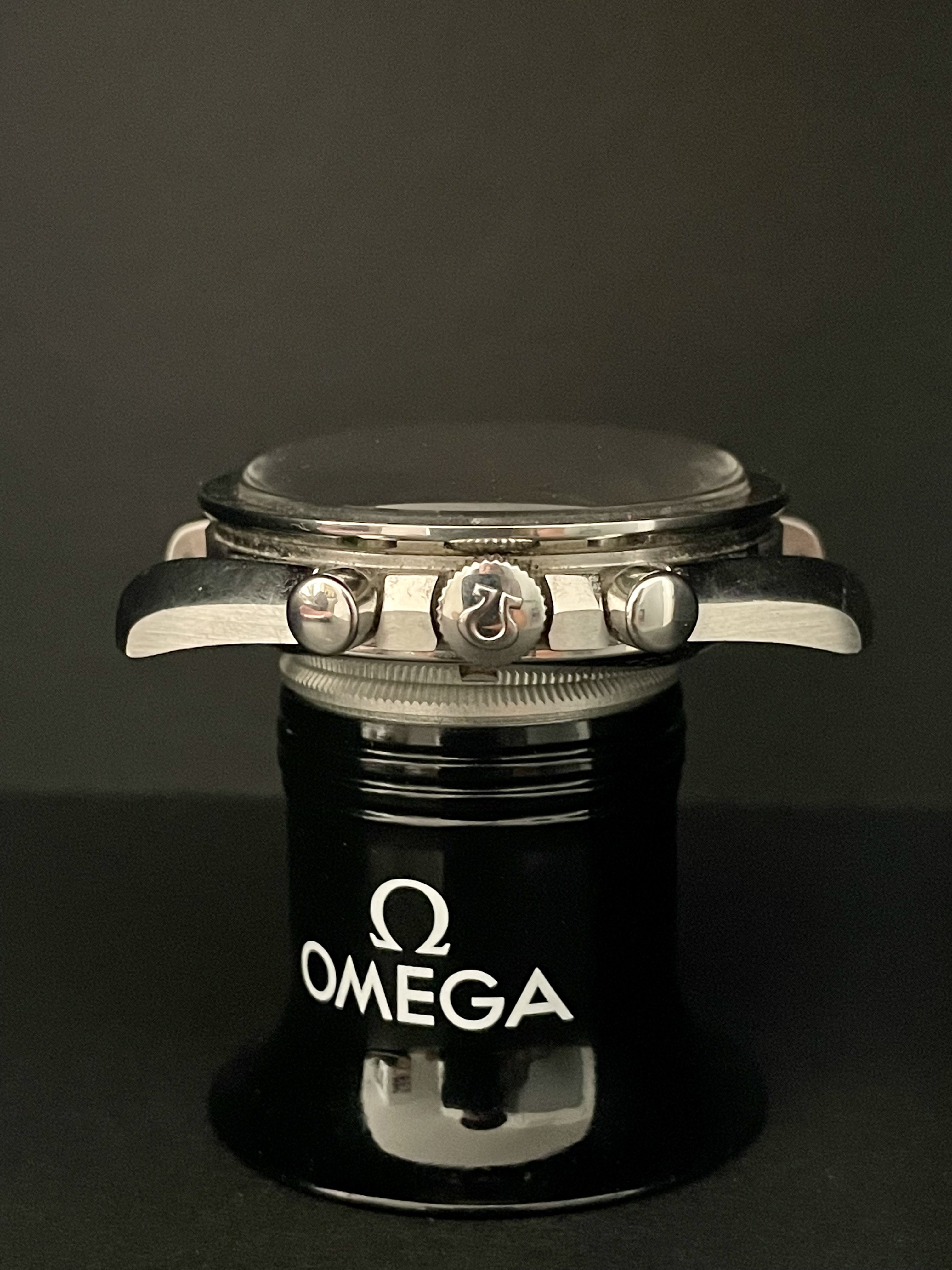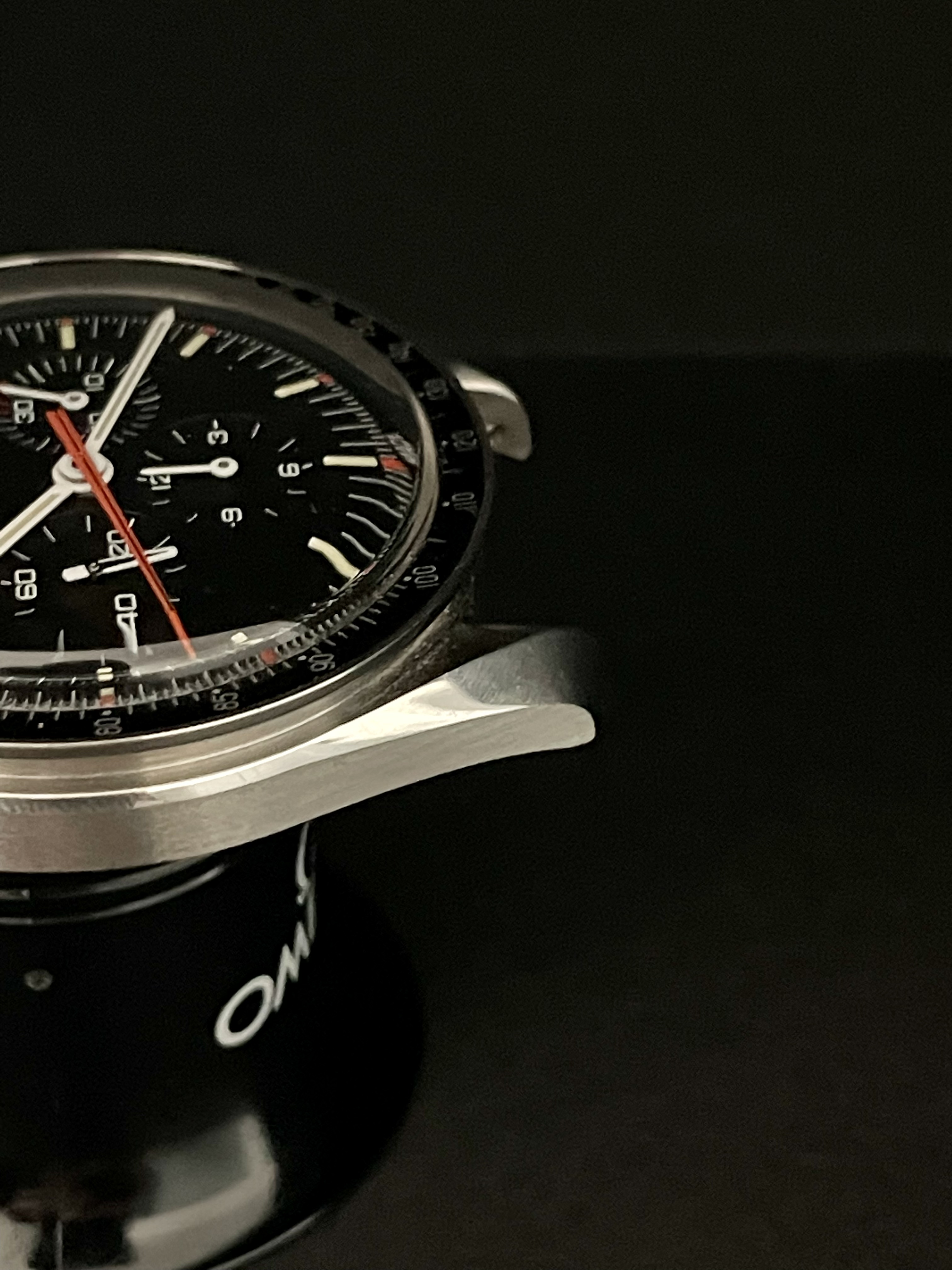 As a huge bonus, this watch comes with the later released Omega Speedmaster Moonwatch Apollo 11 50th Anniversary bracelet. This flatlink bracelet overcomes the fact that this watch was not originally released with steel bracelet option. The uber-comfy bracelet included here is in gently used condition with the usual signs of desktop diving. One thing to be aware of is the endlinks were not manufactured to accompany the ST2, so there is a bit of offset on the underside. The bracelet holds well and does not appear to pose a safety issue. An article was written on fitment of this bracelet to the watch, which includes detailed pictures of the fitment.