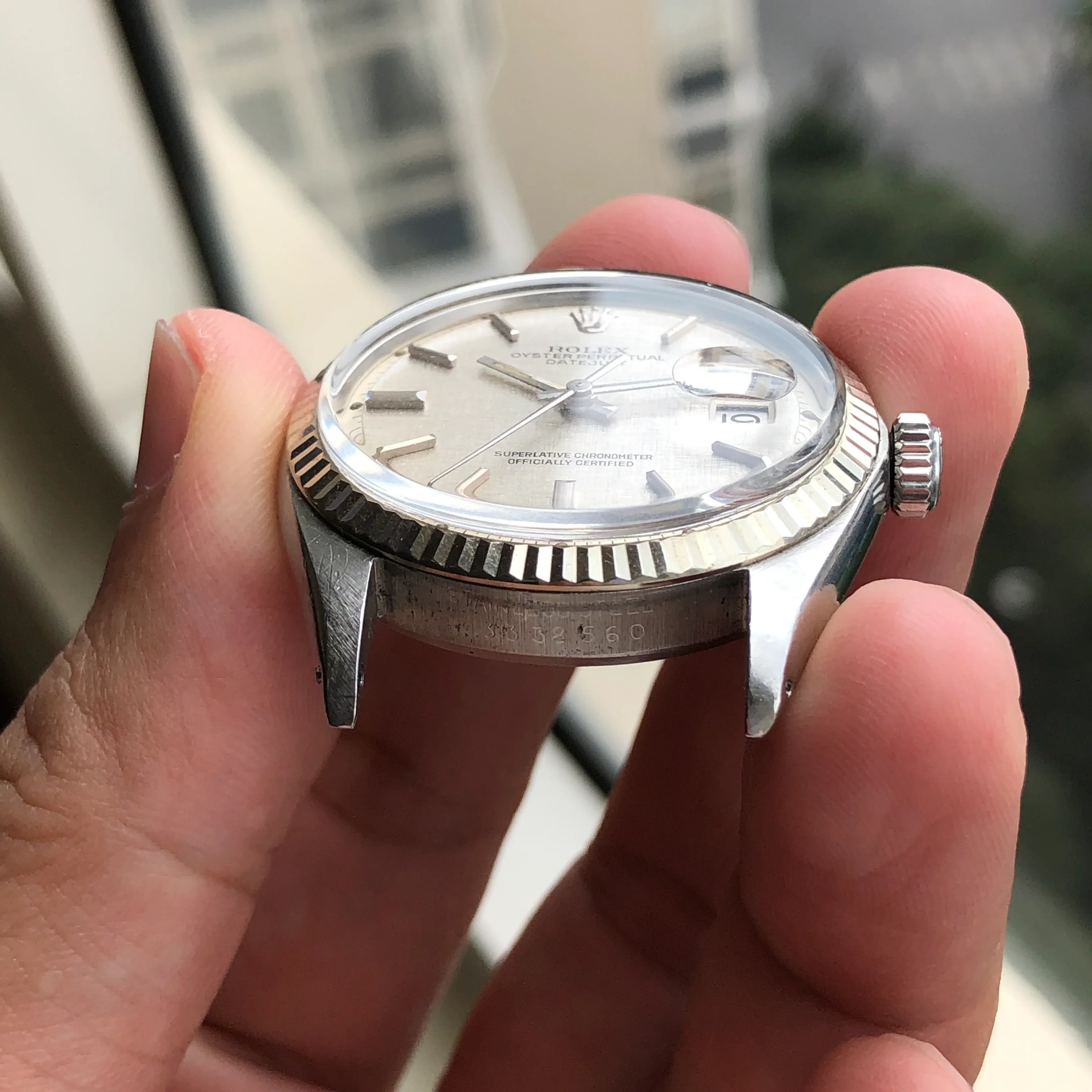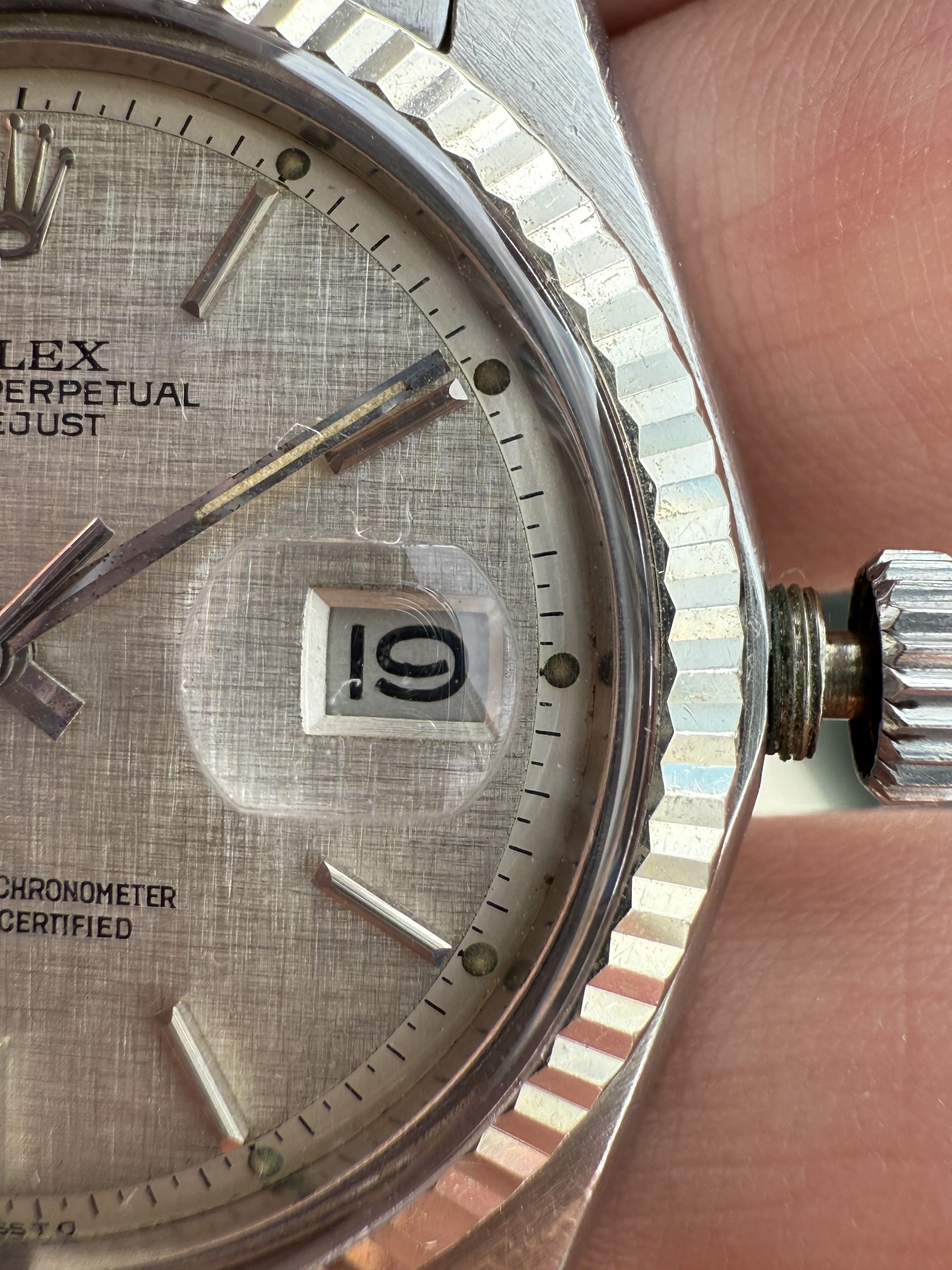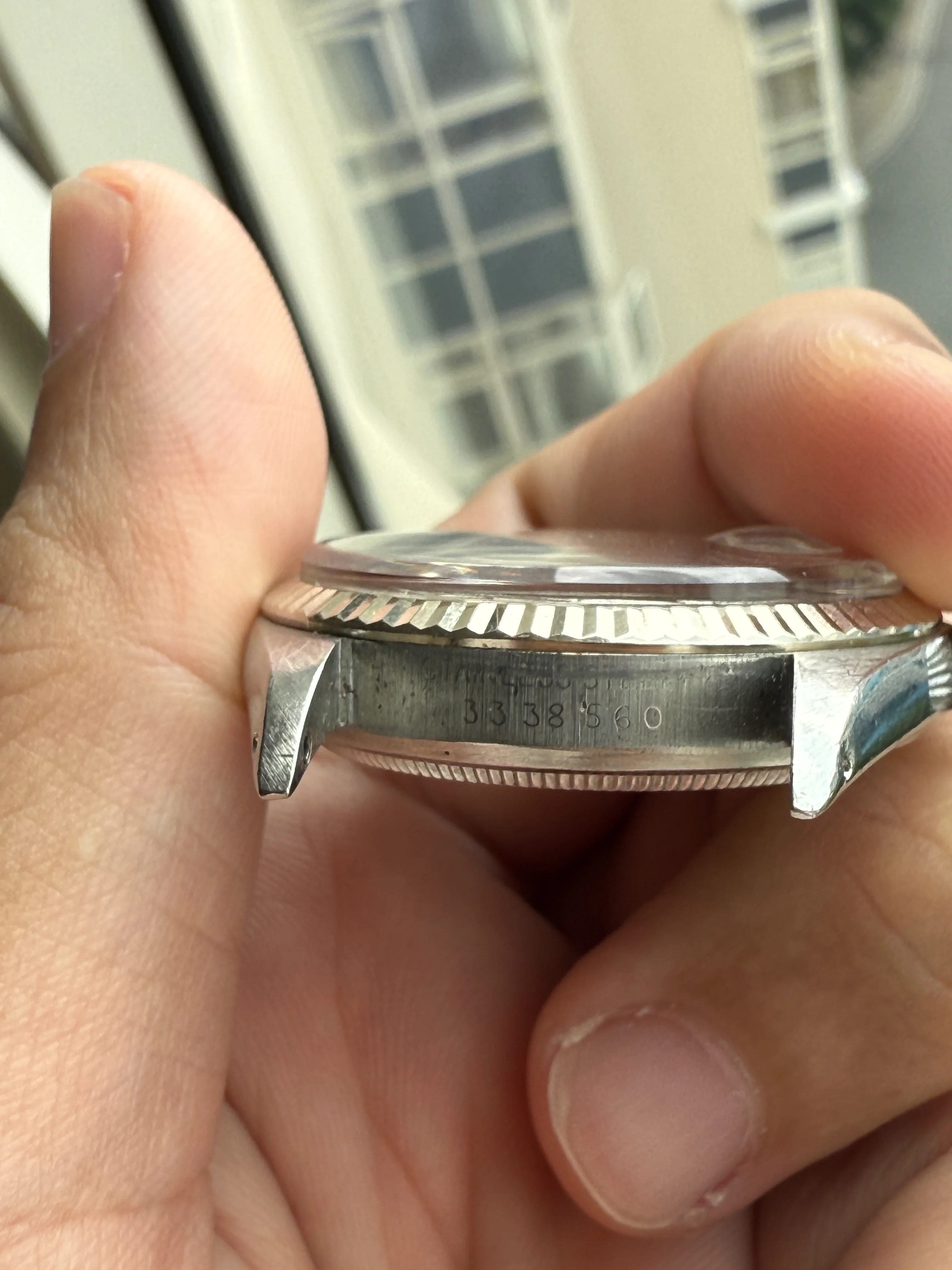 - Case: The diameter is 36mm without the crown. Original case in good condition, white gold fluted bezel. Original screw-down crown. Serial number is 3338560, dated to 1973-1974.