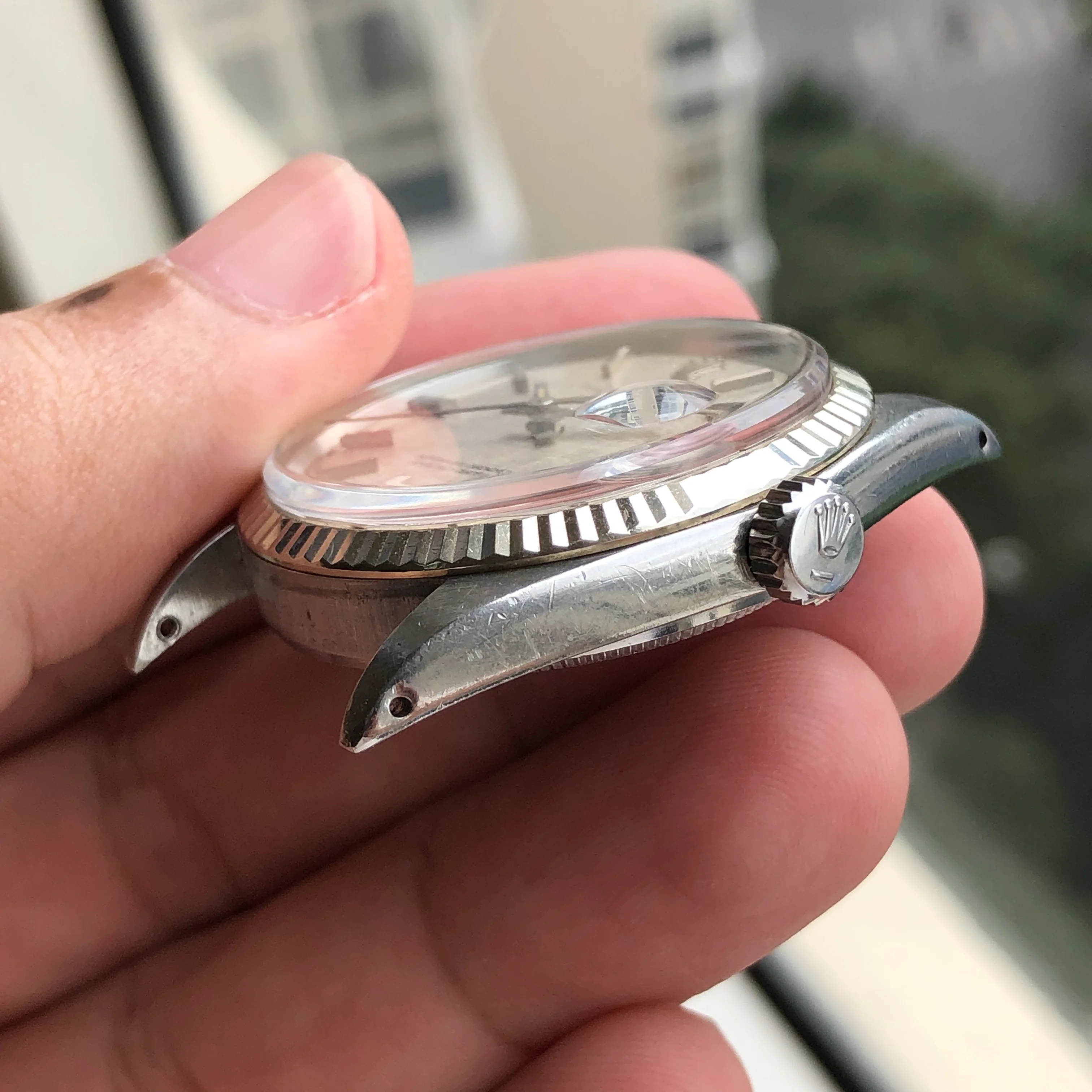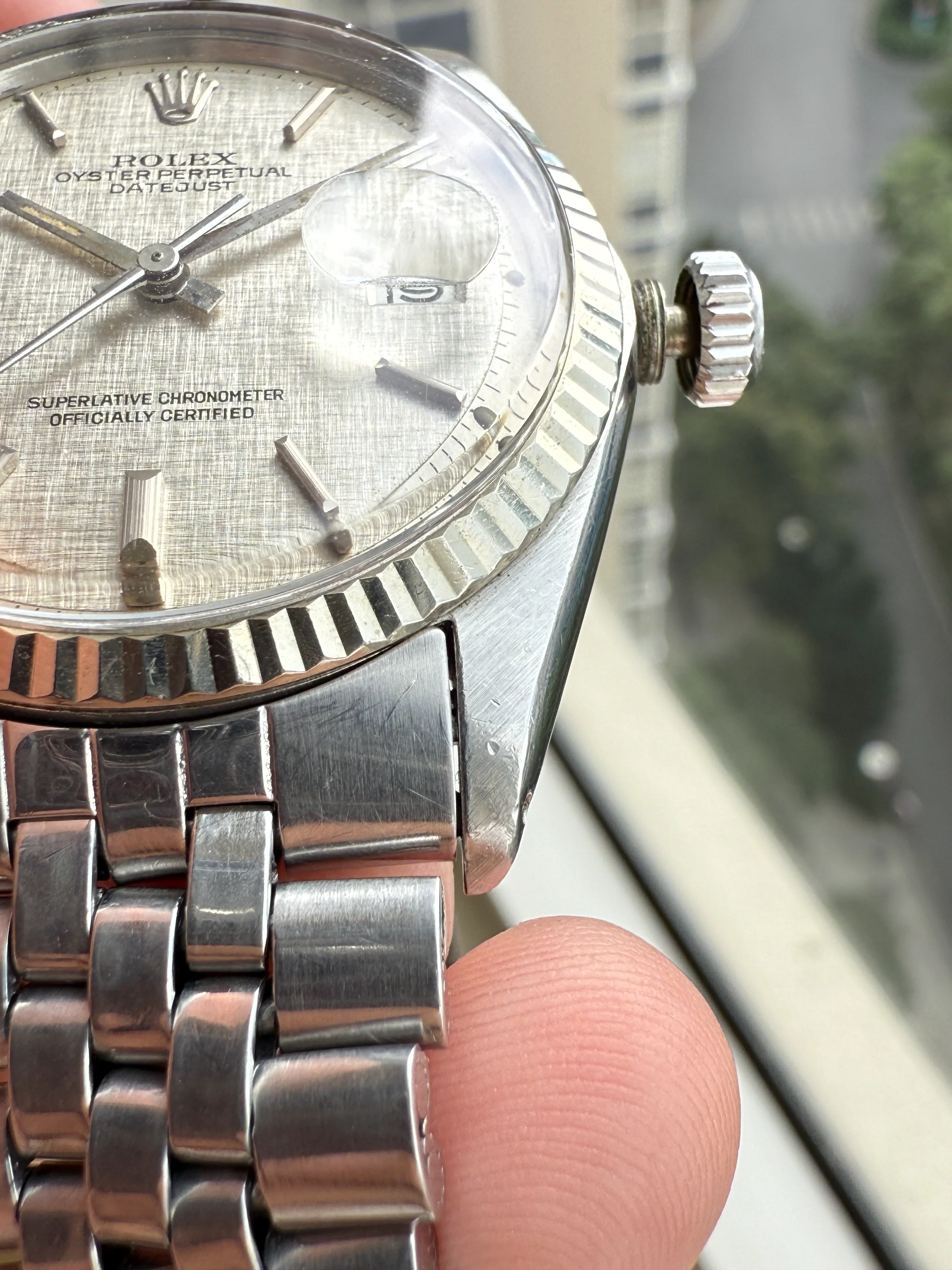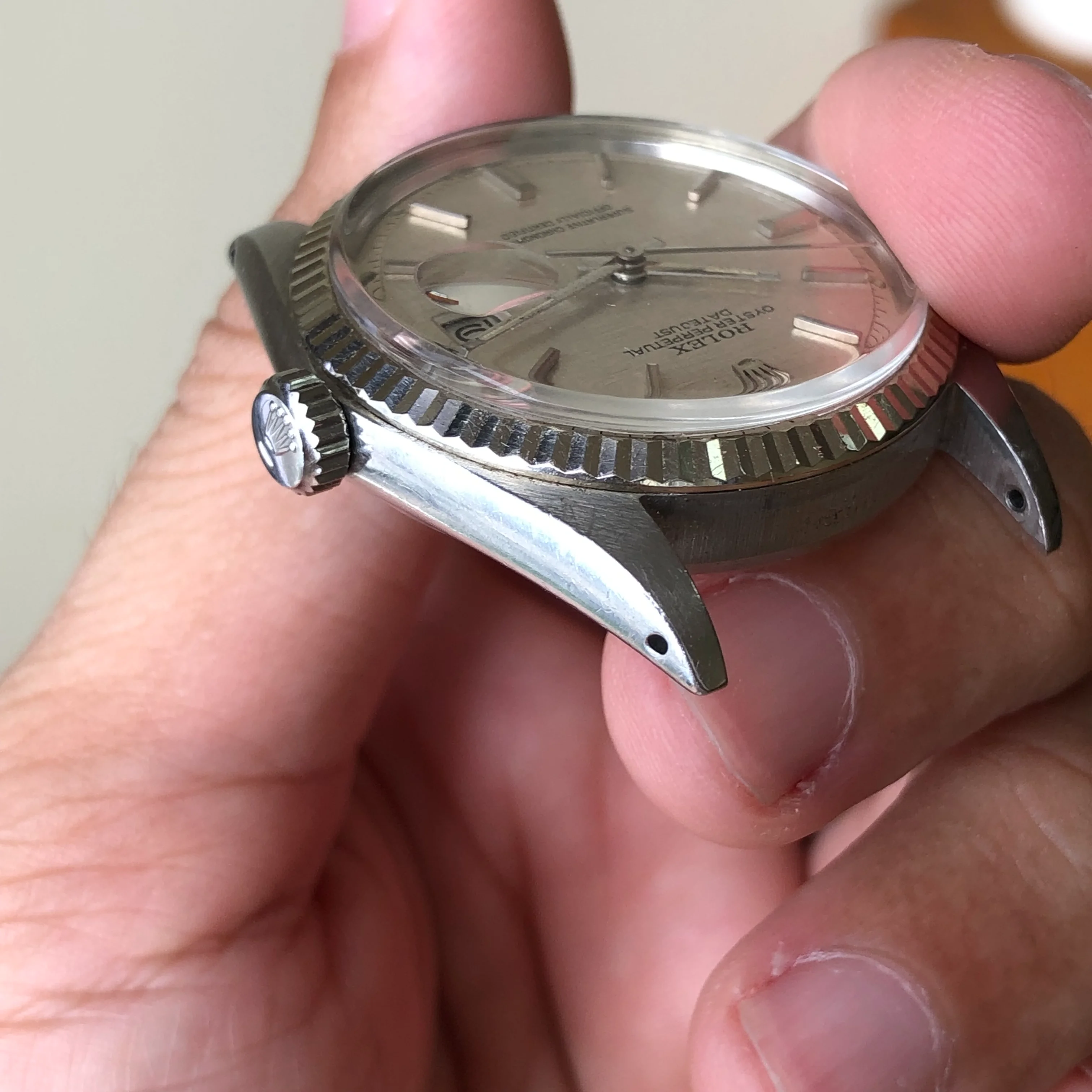 - Case: The diameter is 36mm without the crown. Original case in good condition, white gold fluted bezel. Original screw-down crown. Serial number is 3338560, dated to 1973-1974.