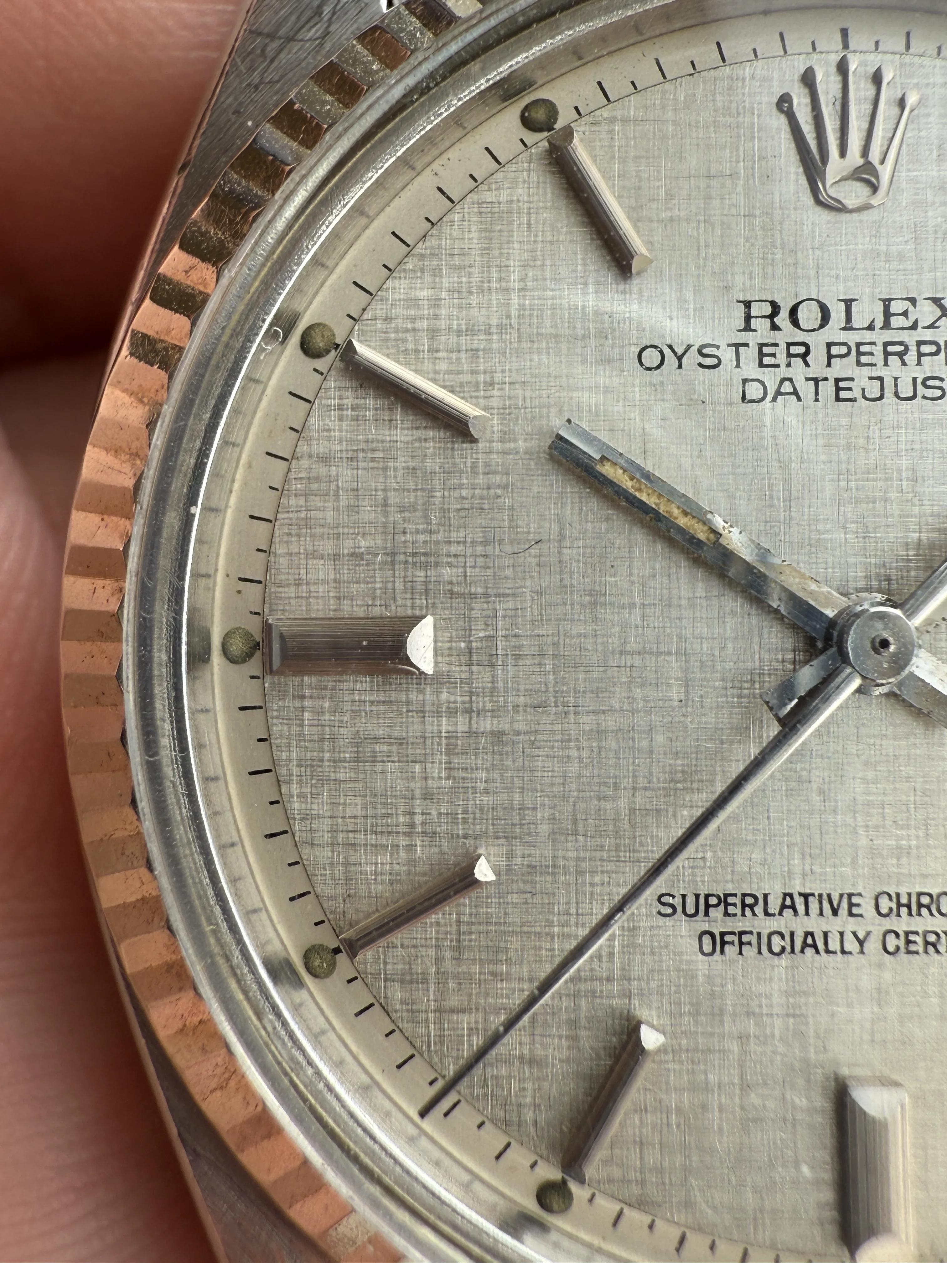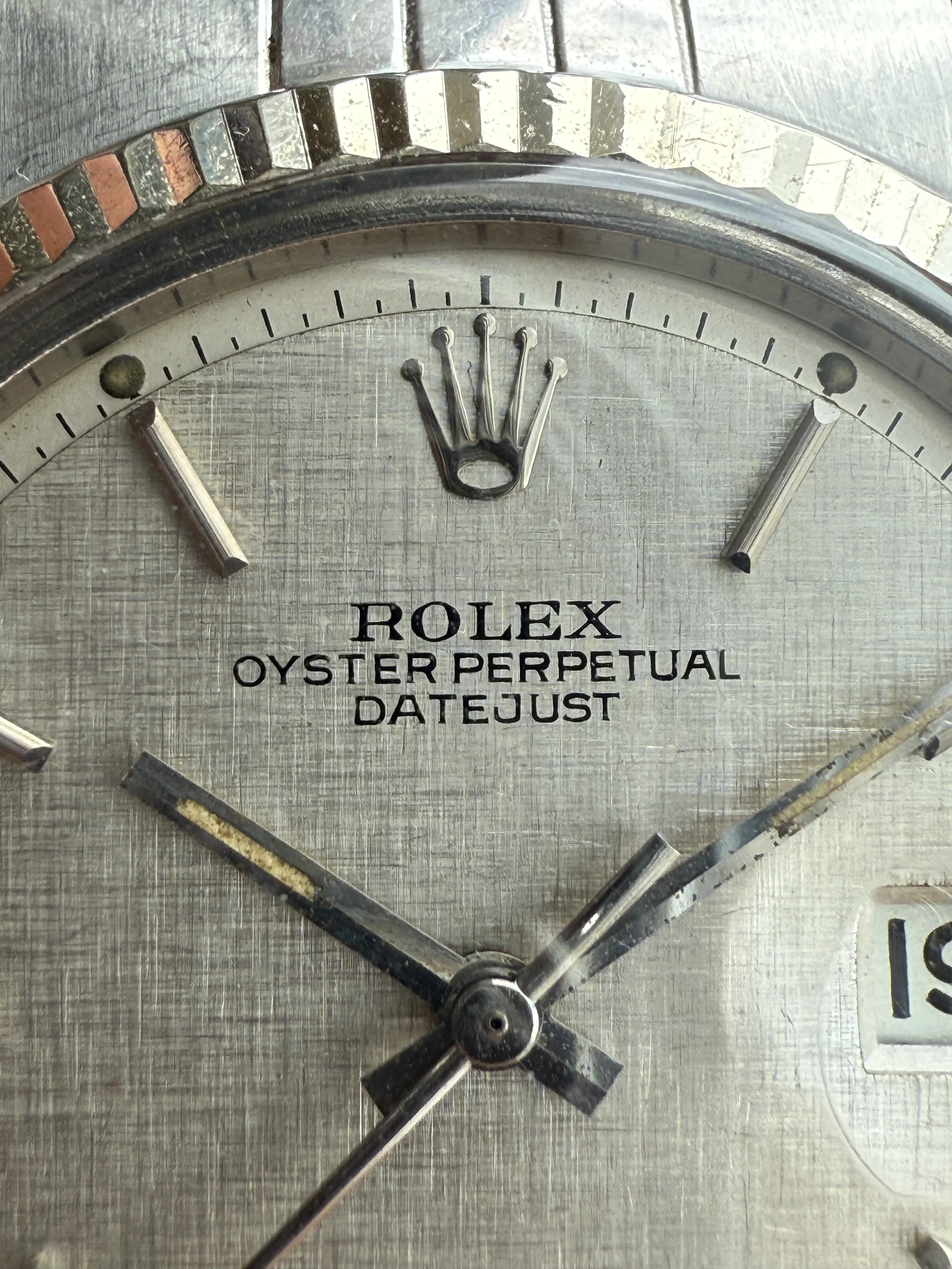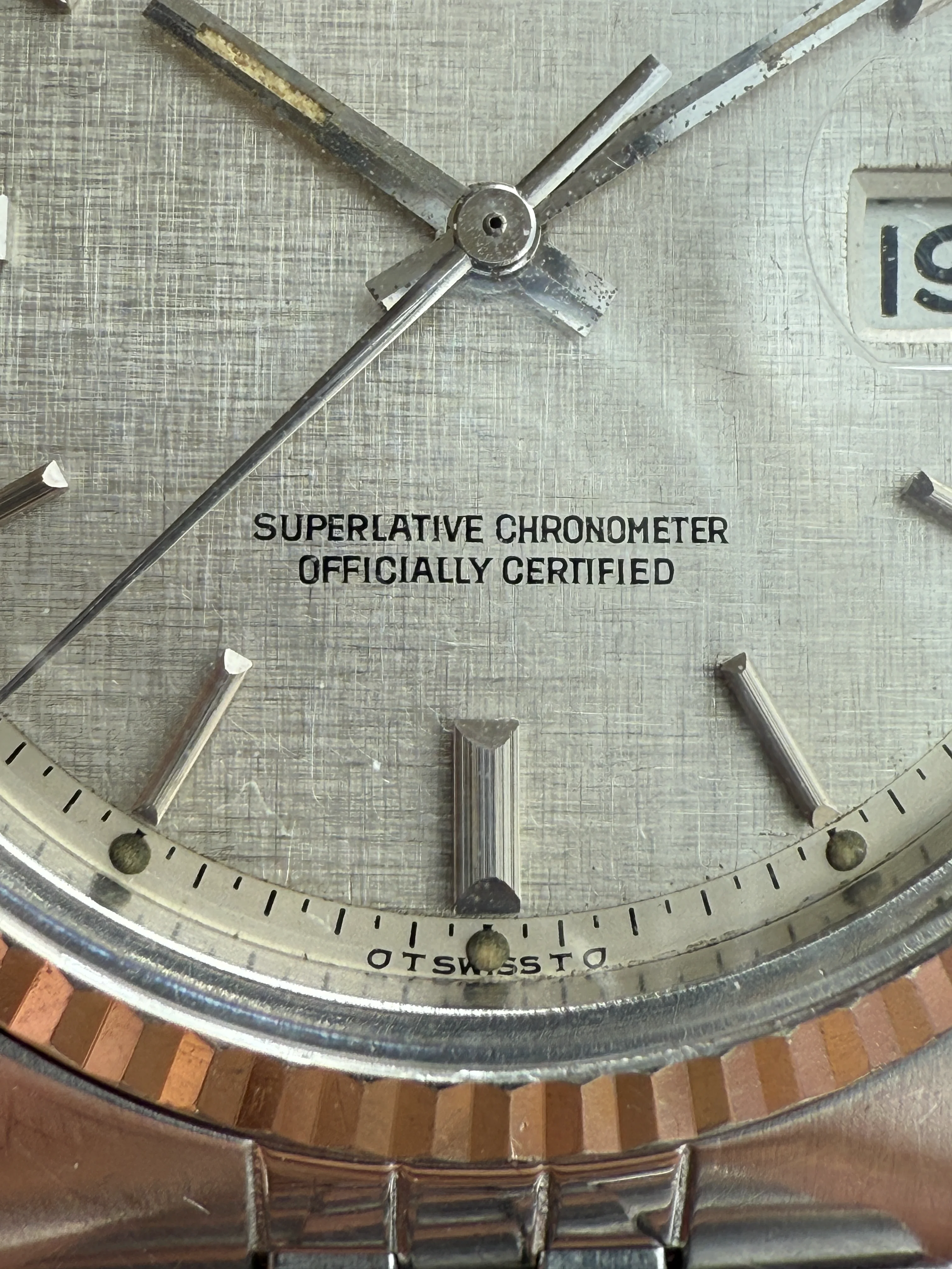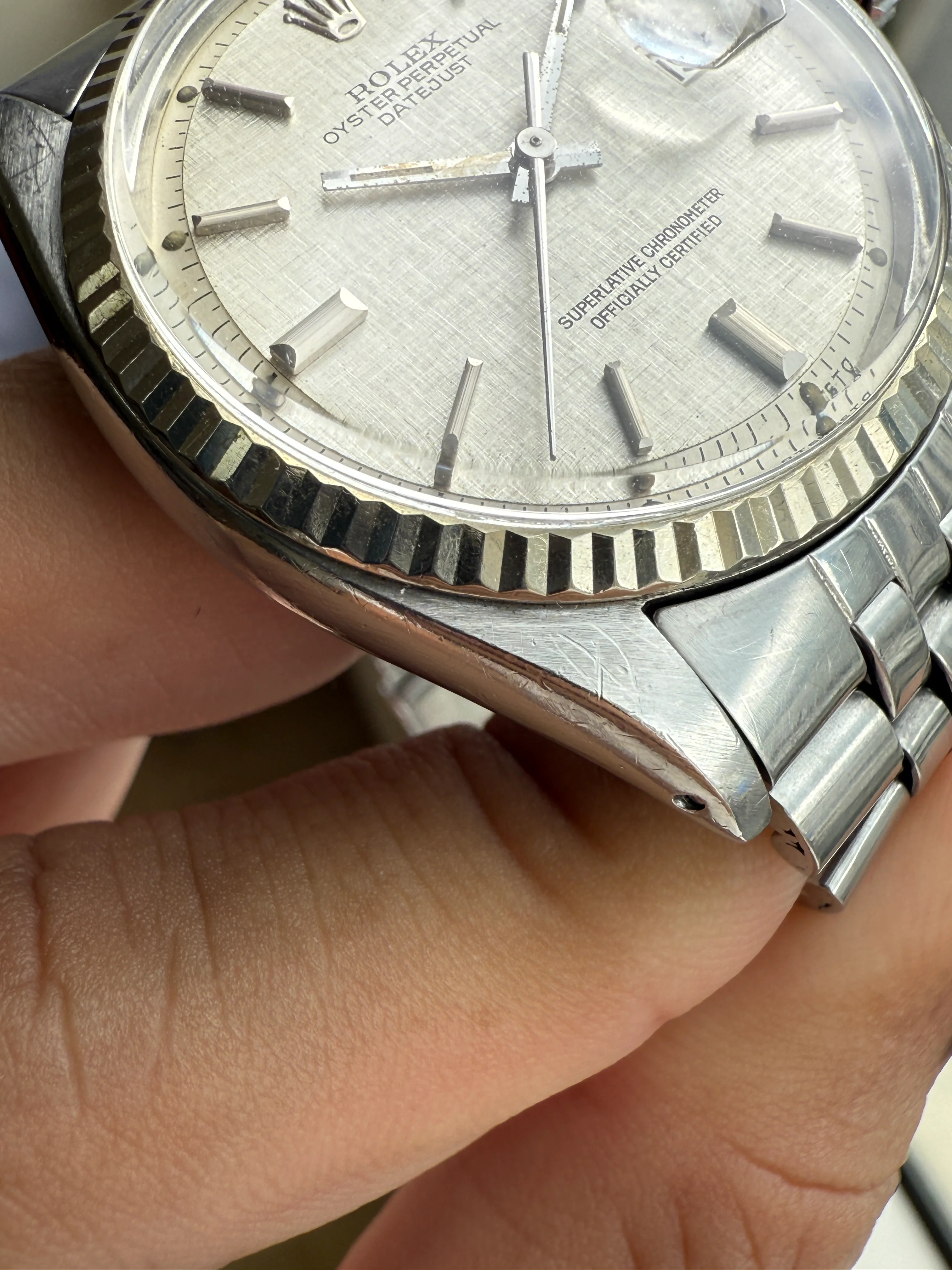 - Dial: Original sigma silver linen dial in very good condition, white gold hour markers and baton hands with lume, date window at 3; prints, hands and hour markers are all good.