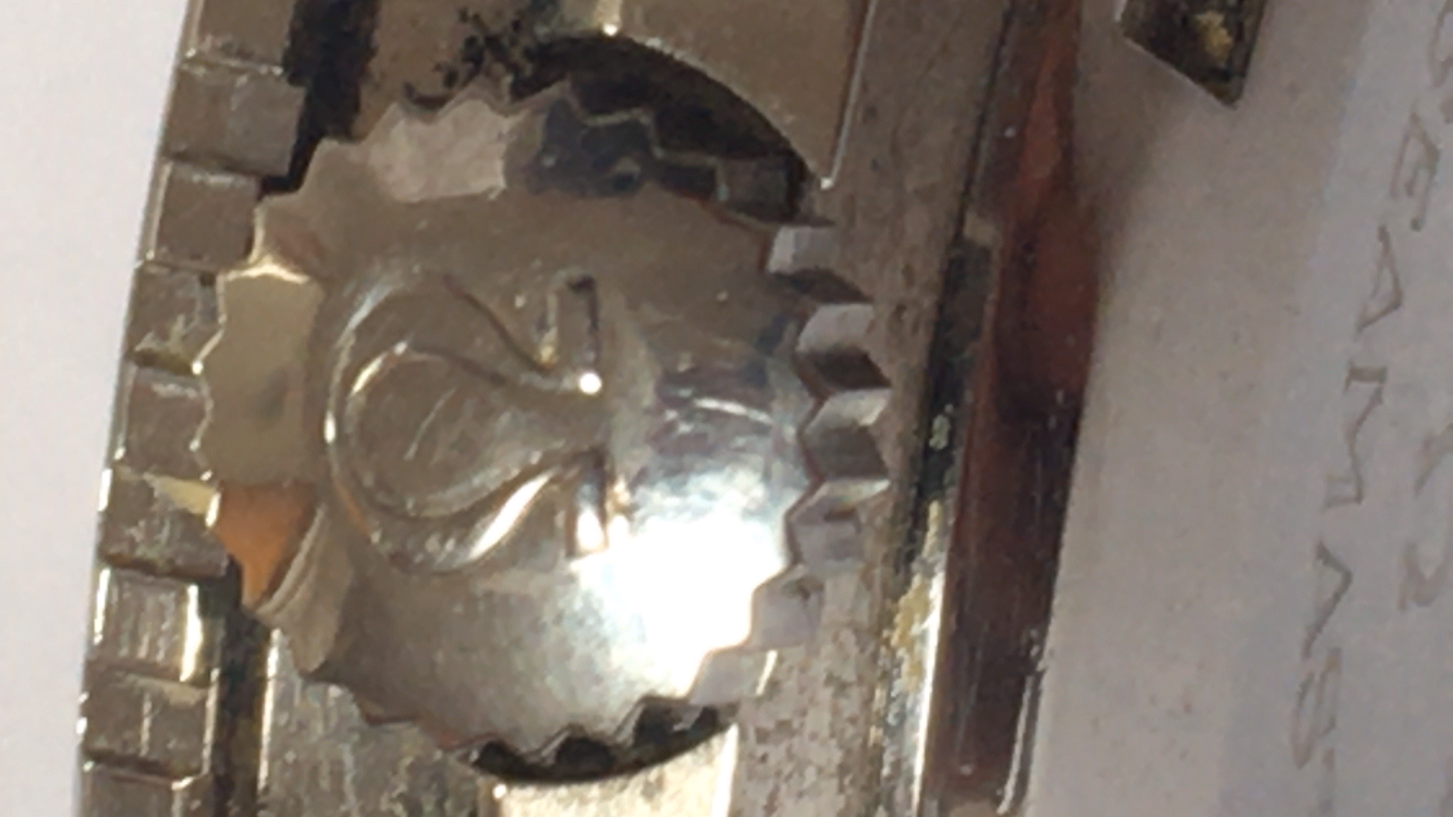 The crystal has the Omega logo in the middle and the crown is the flat-foot version.
