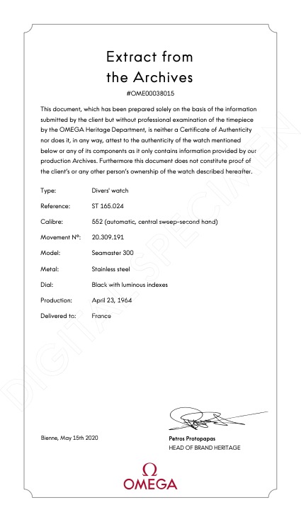 The extract of archives confirms that the watch was delivered to France in April 1964,