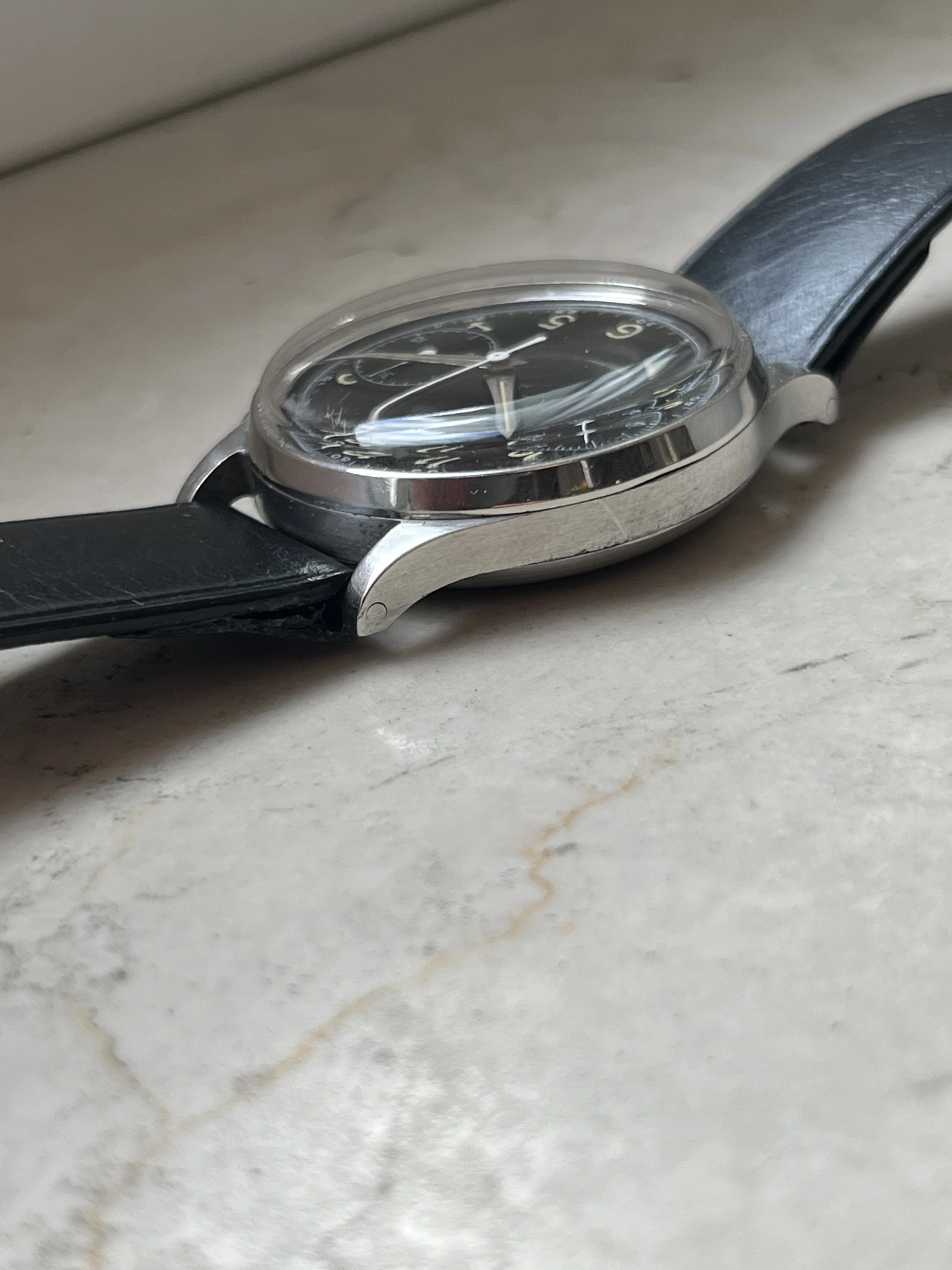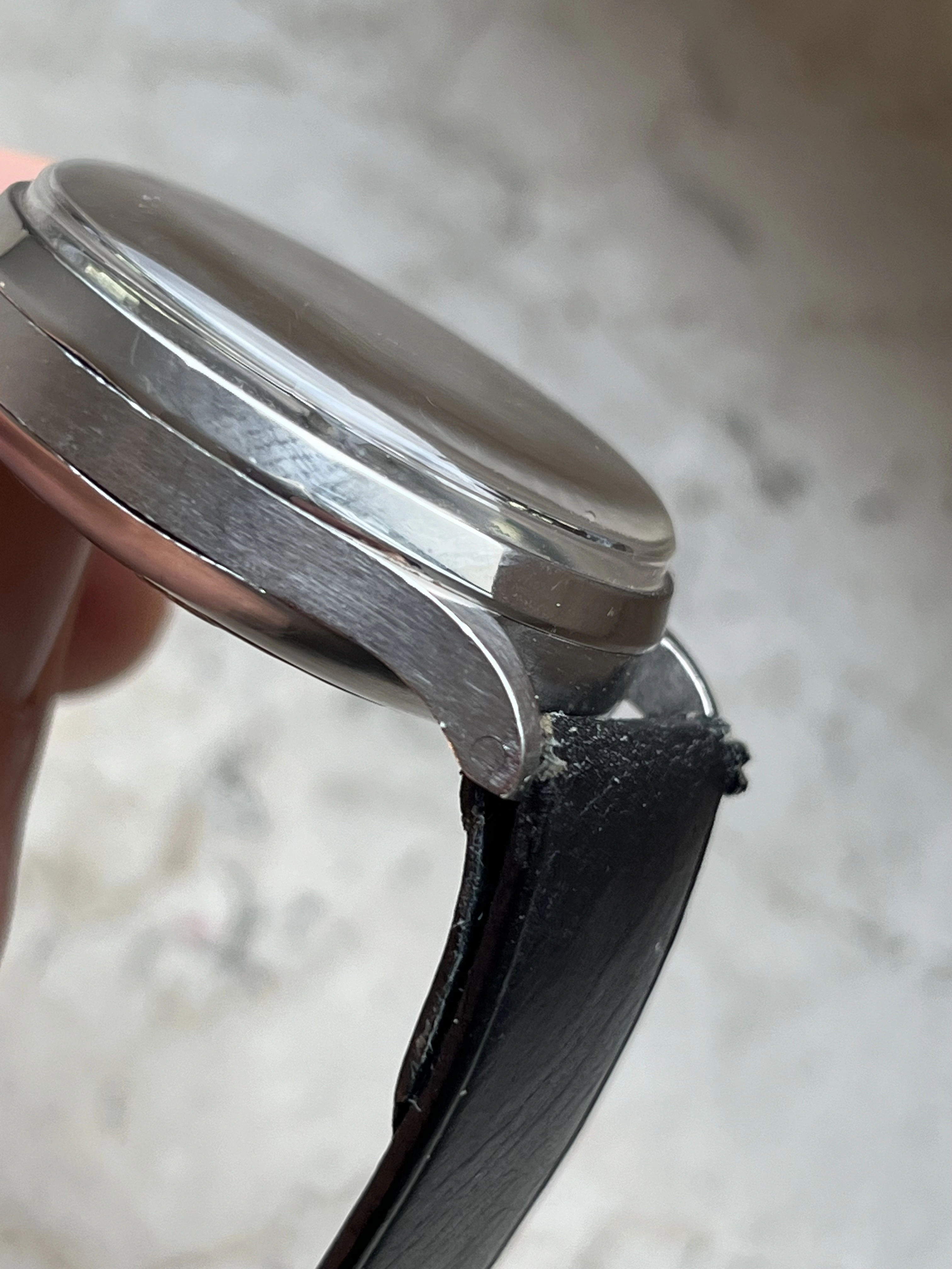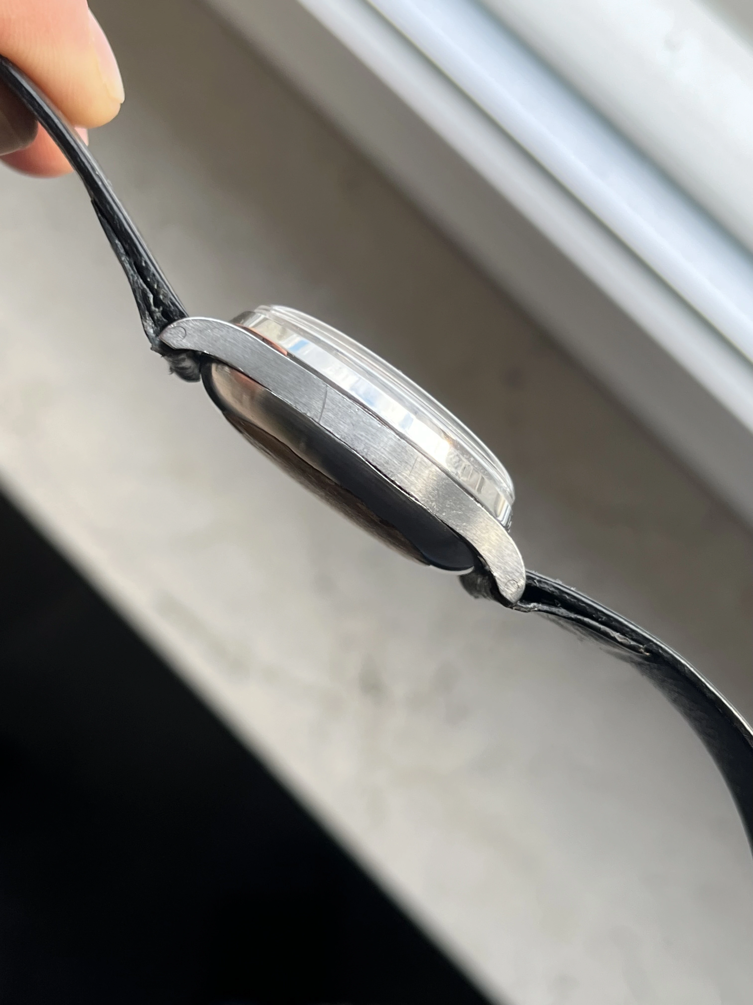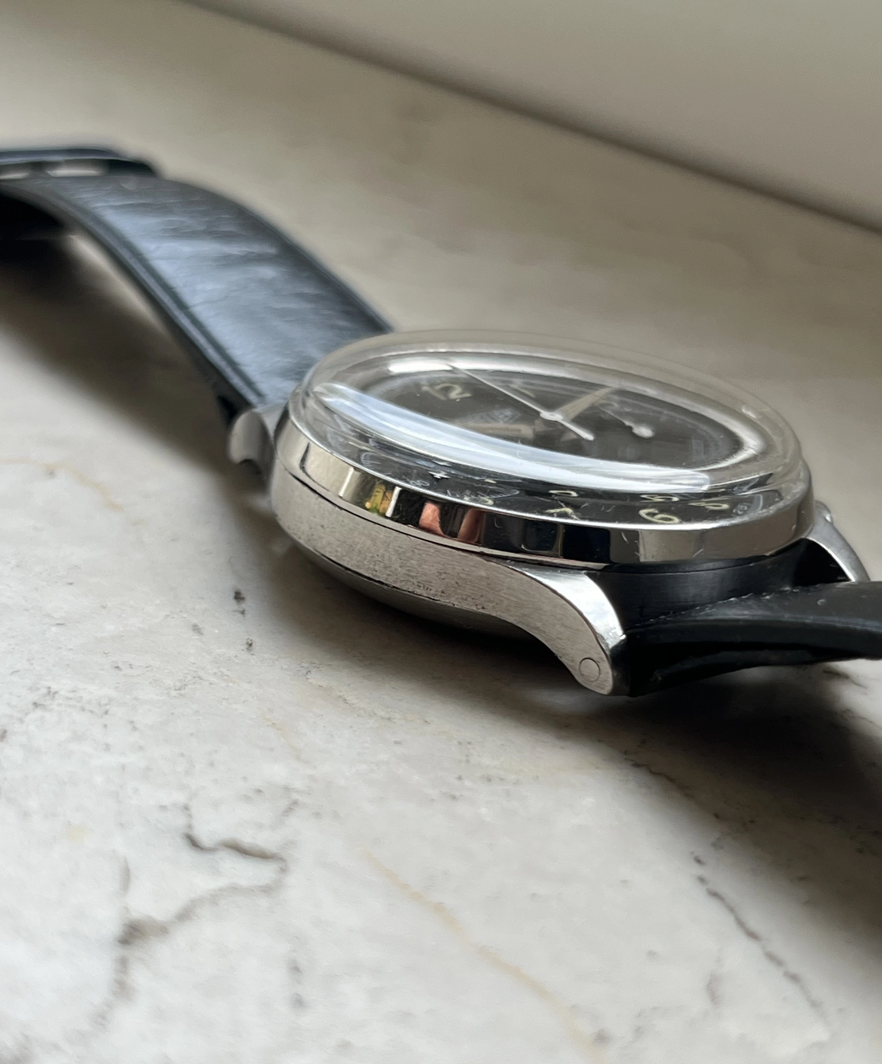 CASE: The three-body, stainless steel case measures 36mm in diameter and stands 13.5mm tall. It appears to be unmolested as it retains, thick downturned lugs and a strong profile with light signs of wear consistent with its age.