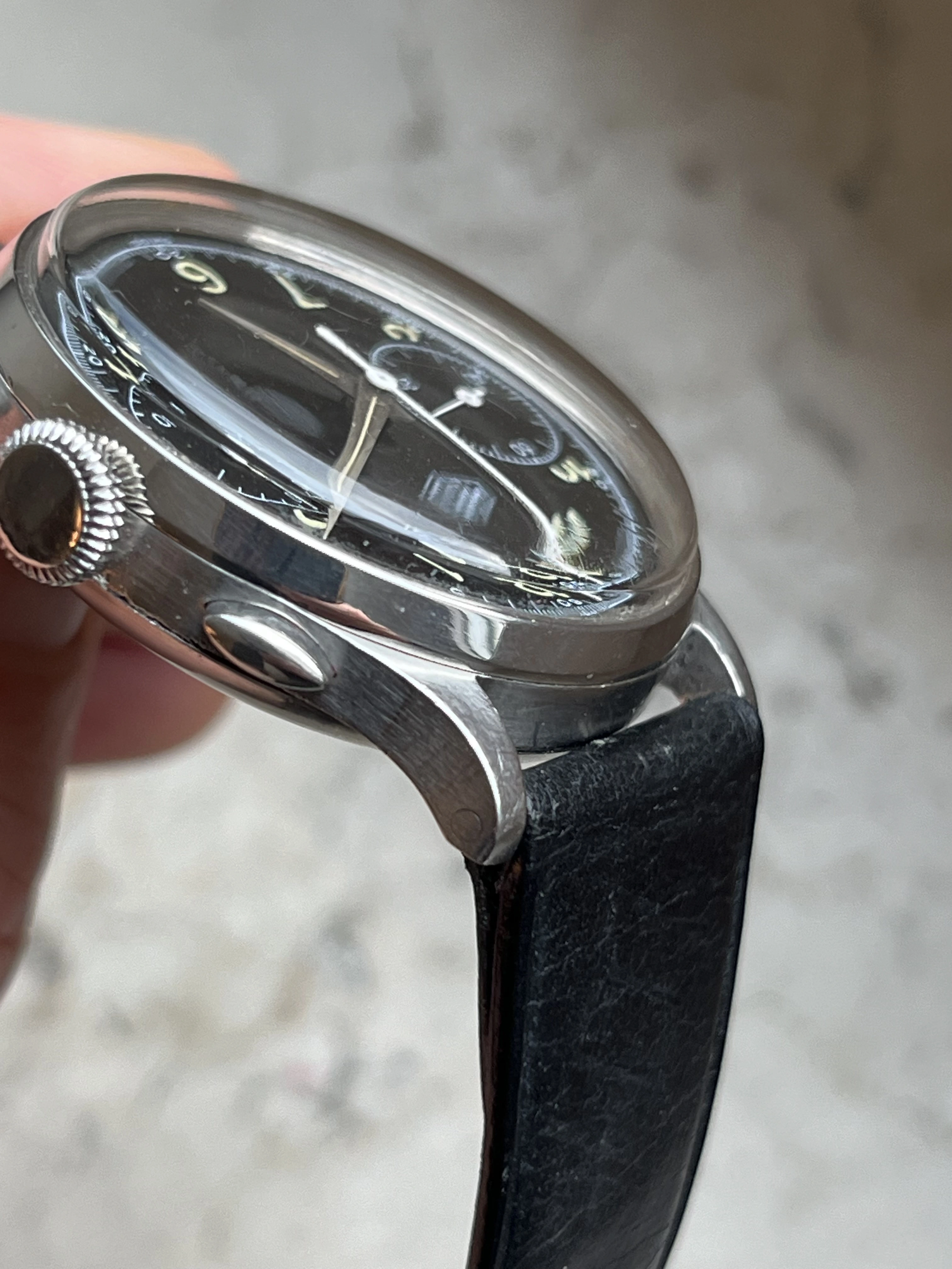 CROWN+PUSHERS: The unsigned crown is likely period correct and original, just like the dual olive pushers. The whole ensemble operates crisply.