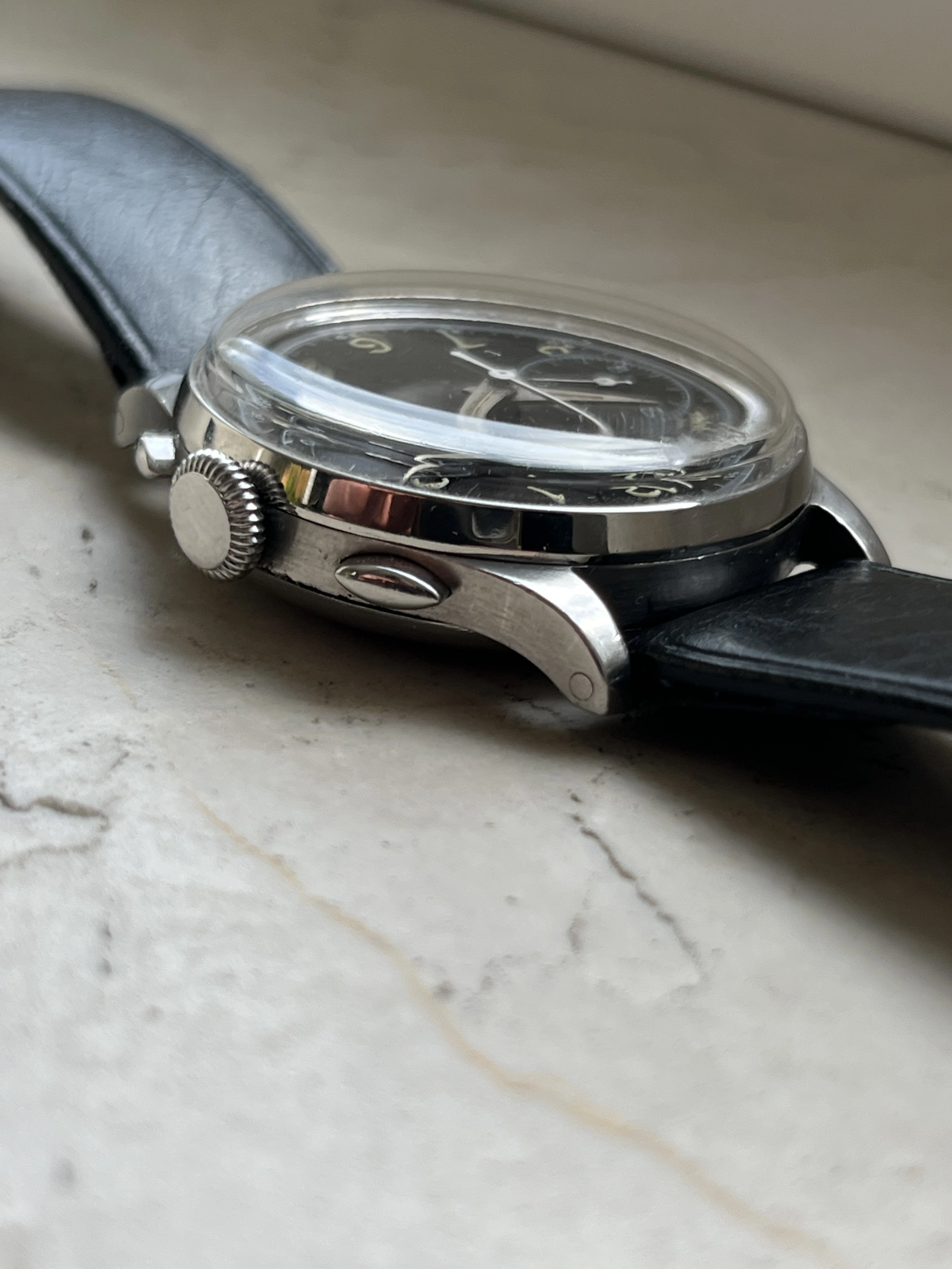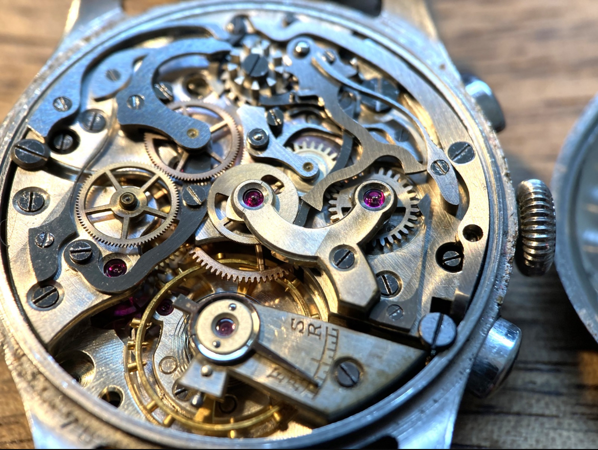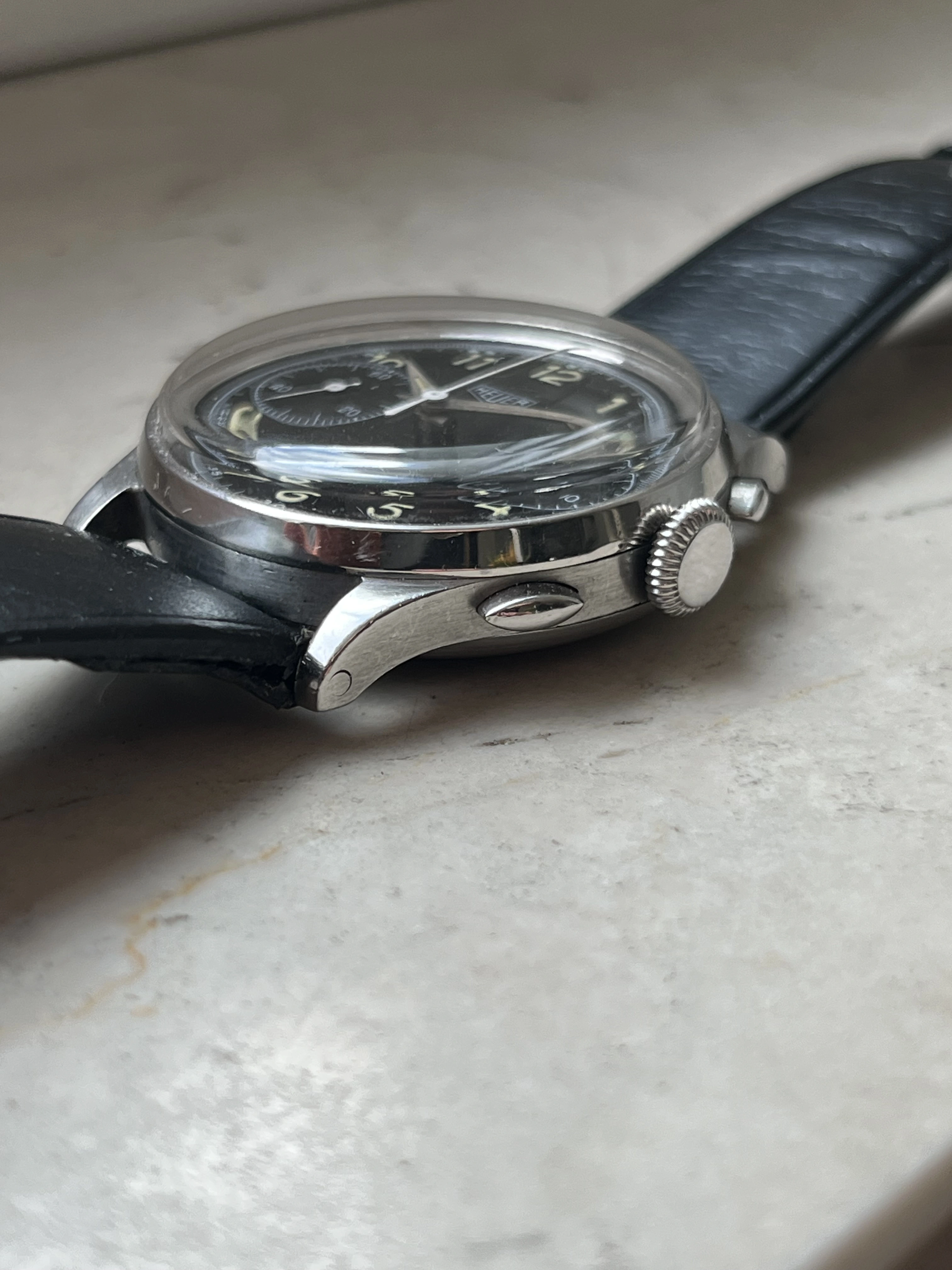 MOVEMENT: The manually-wound Valjoux 22 is a workhorse two-button chronograph movement with a bicomapax display and column wheel. The movement is clean and in full working condition.