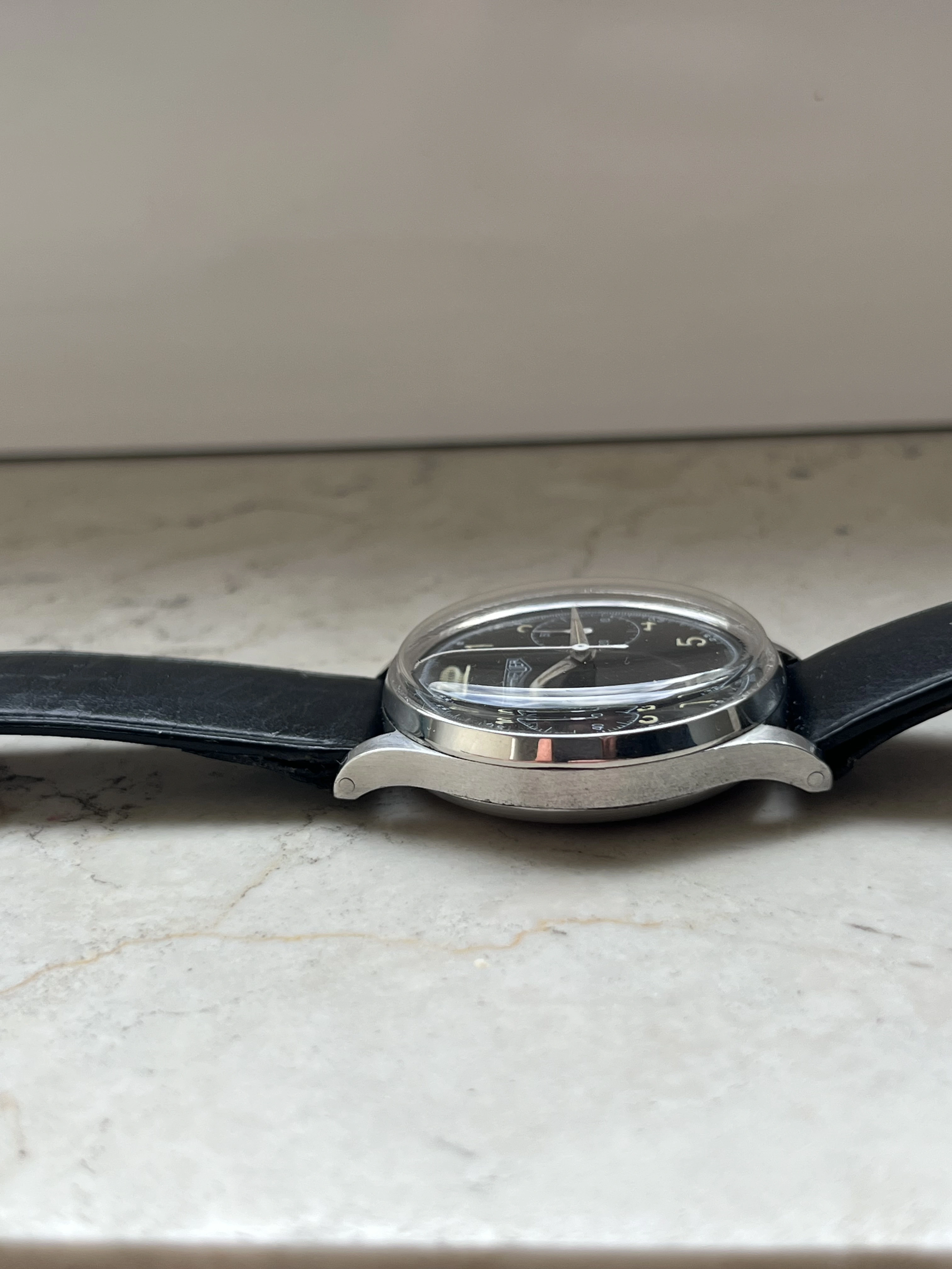 DIAL+HANDS: The black dial is in near mint condition, with a crisp white imprint throughout and a light speckling patina. It also features a bicompax chronograph layout with two recessed subdials. The dauphine hands show intact lume inlays and a layer of oxidation due to age.