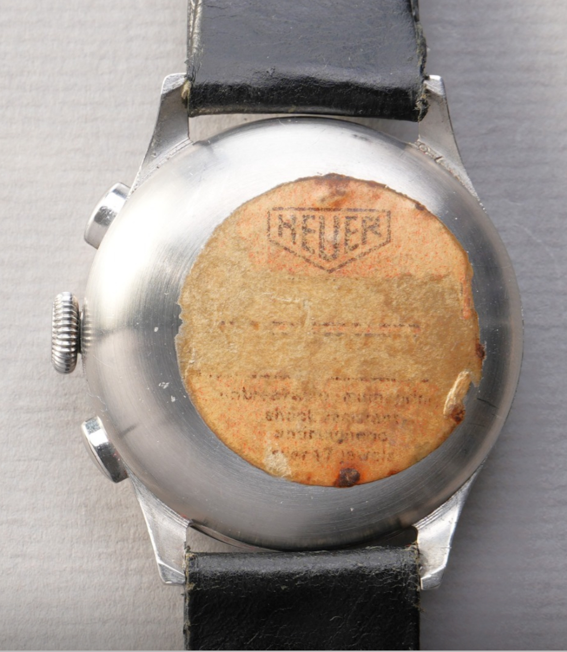 CASE BACK: The case back still retains its circular grained finish under the original Heuer sticker. The inside is perlage decorated and stamped.