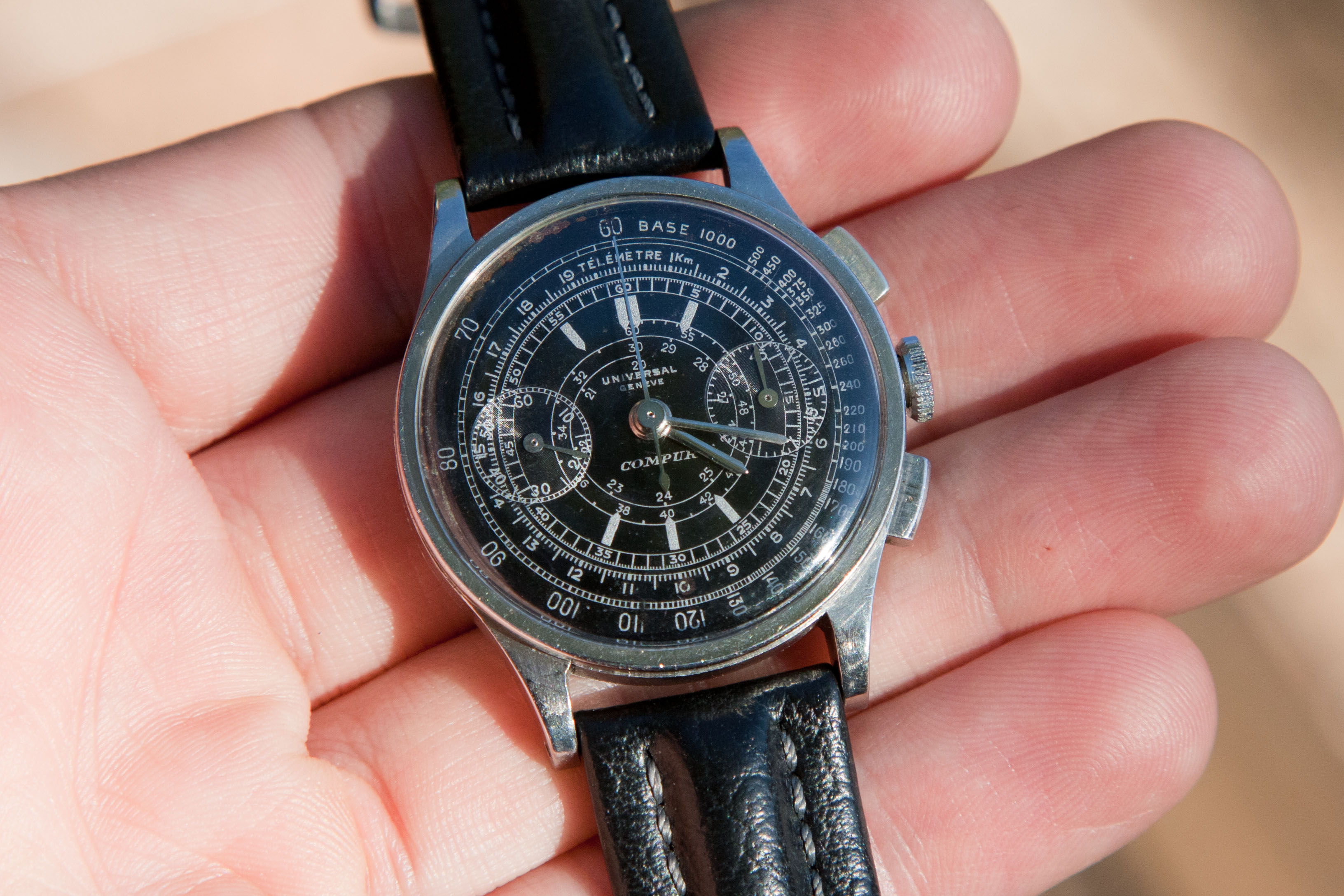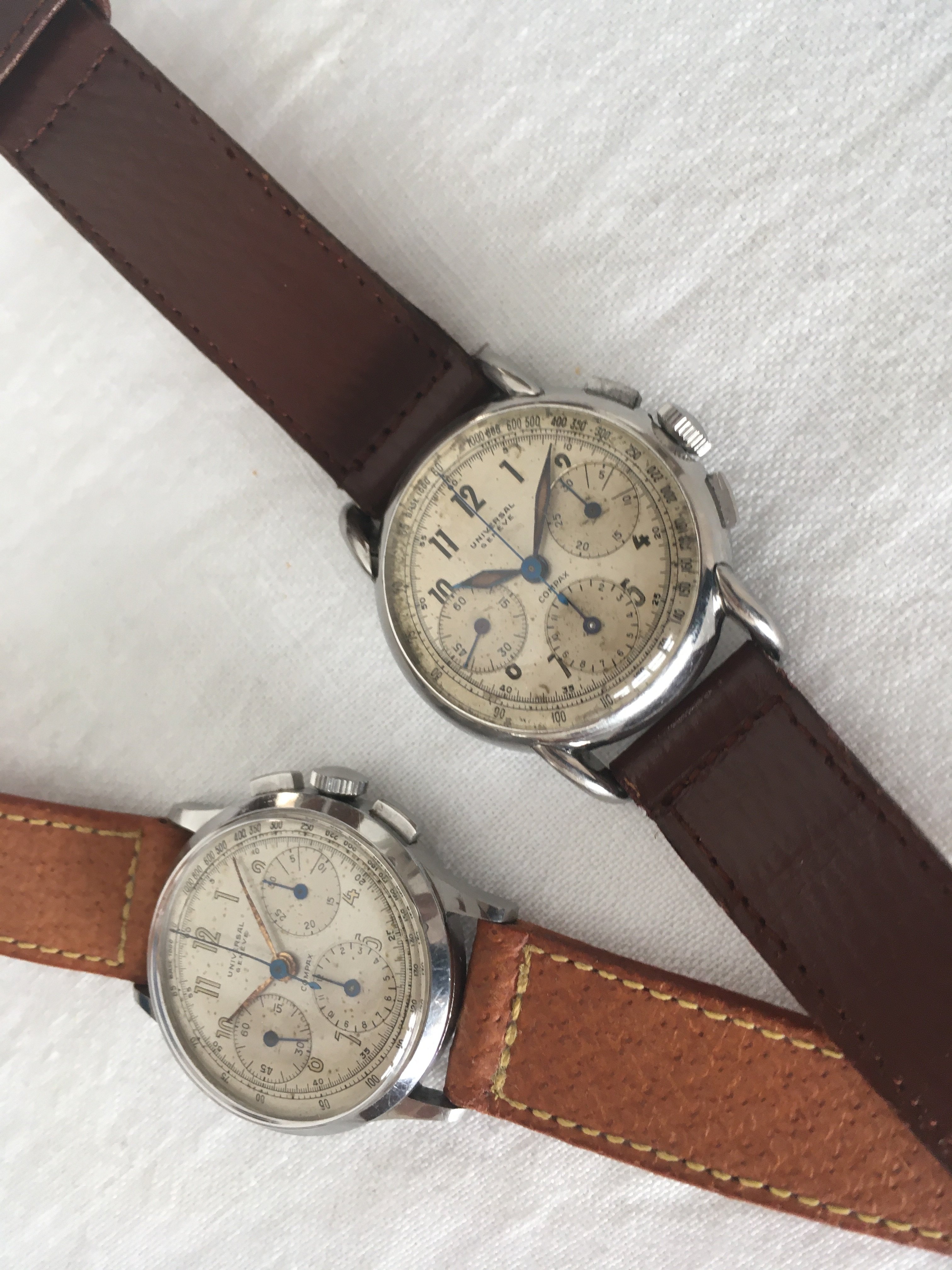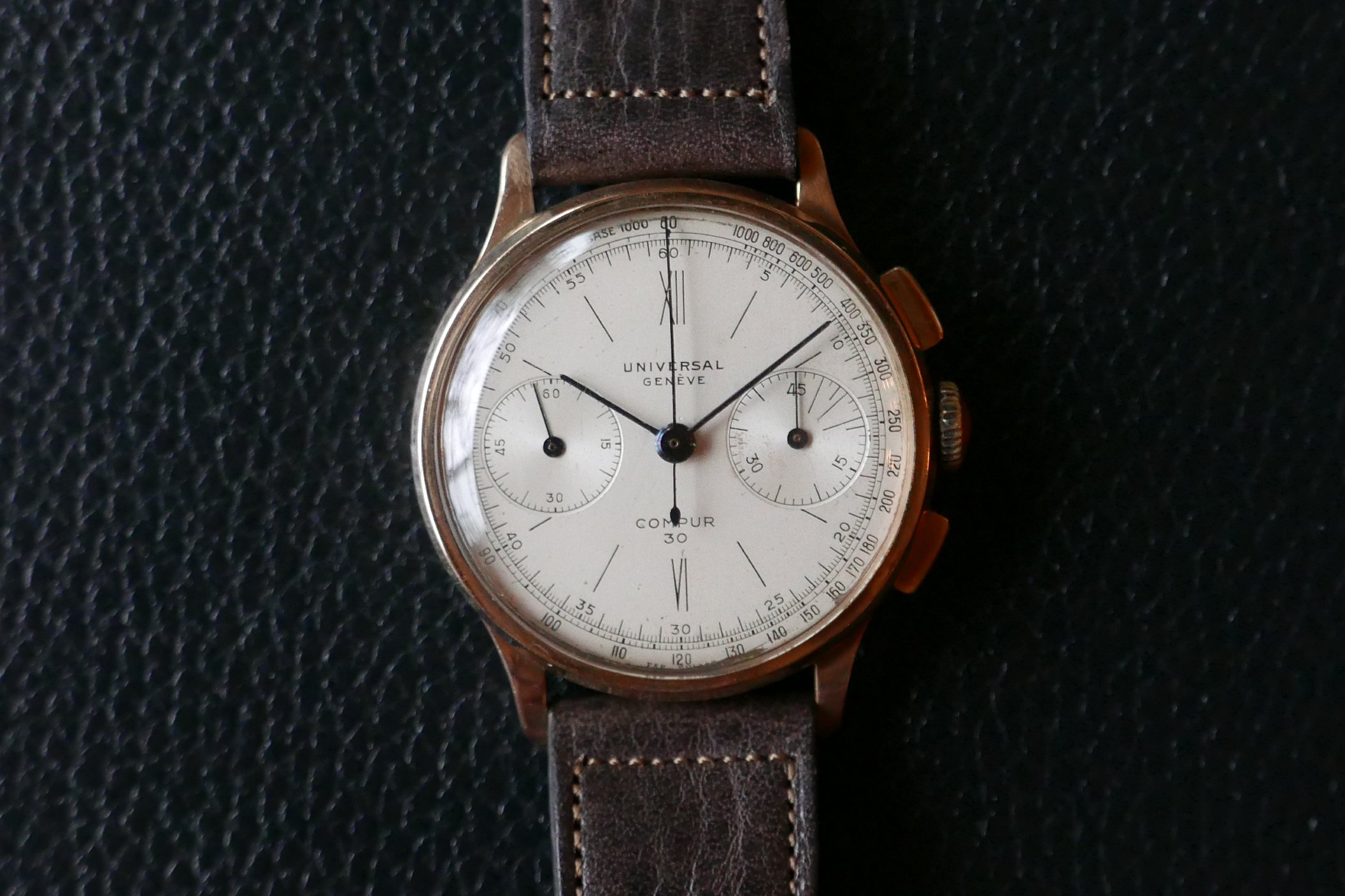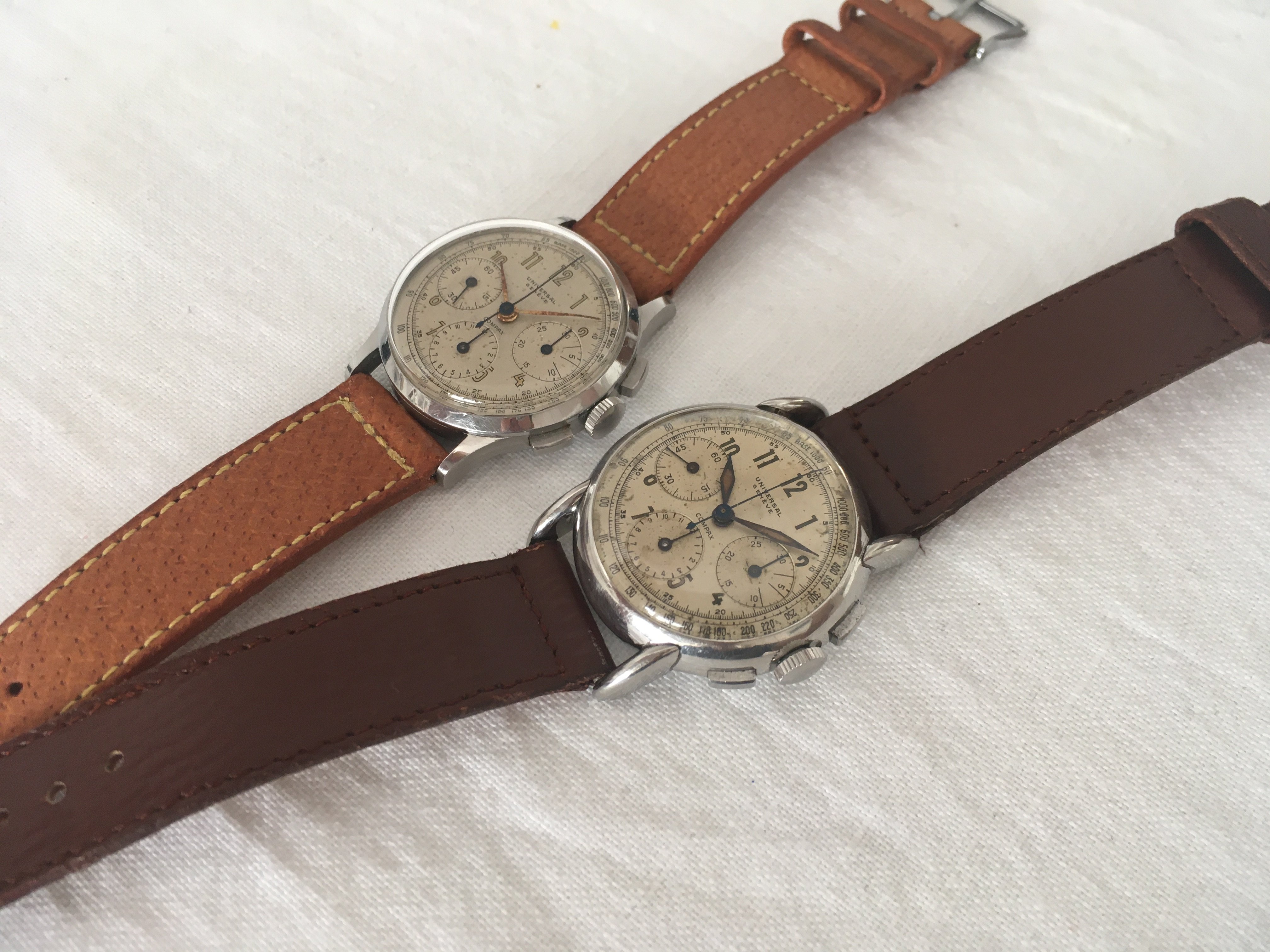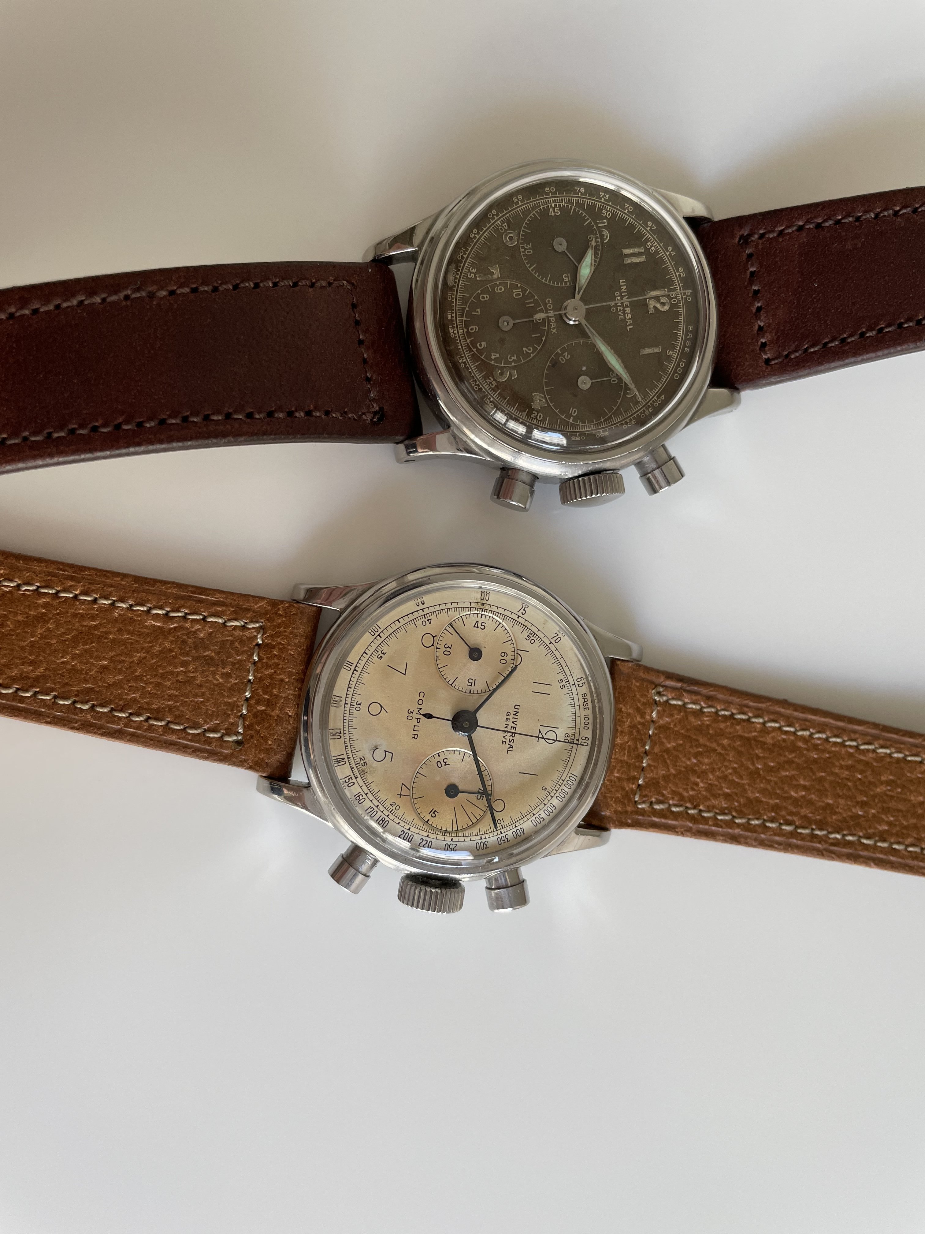 I believe that was the case last week with a compax dial. When looking at that dial it occurred to me that while I have looked at more than my fair share of UG chronograph dials I have never found an original vintage (40's to 50's) chronograph dial with a circular outline (ring-not railroad track) printed inside the perimeter of the sub registers and oftentimes use that as a criteria for myself.