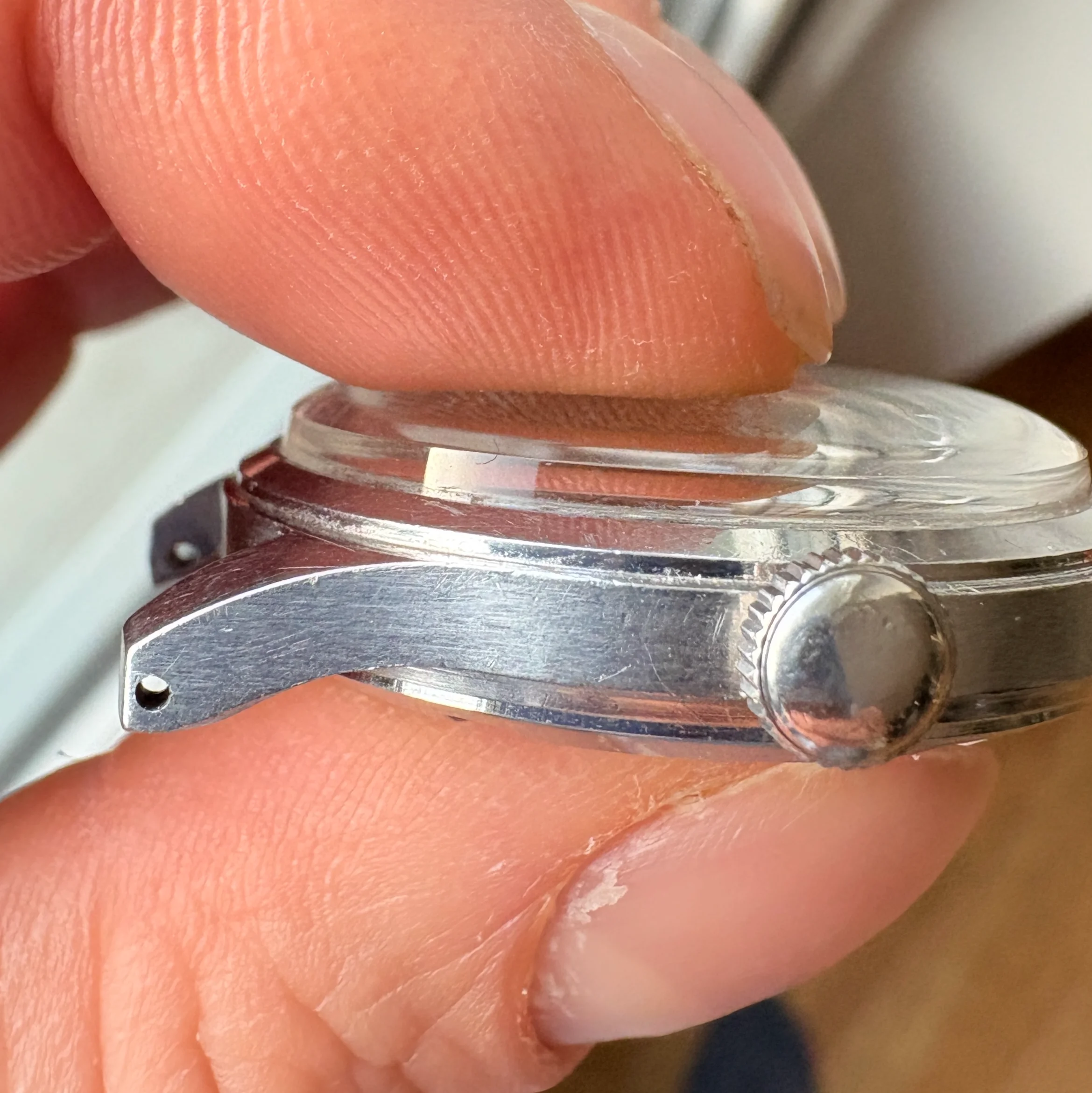 Its a well built and large watch for its age measuring at 35,5mm excluding the crown and takes 18mm straps.