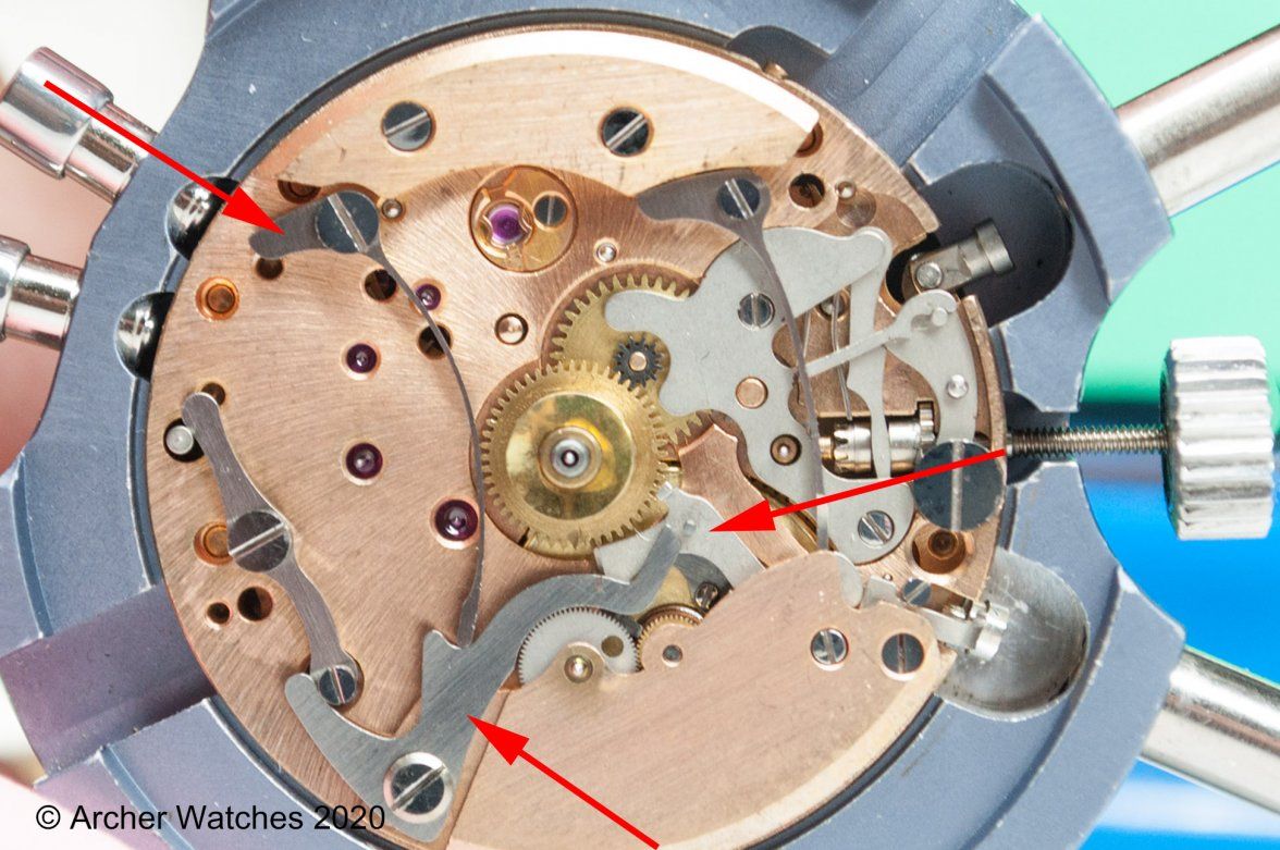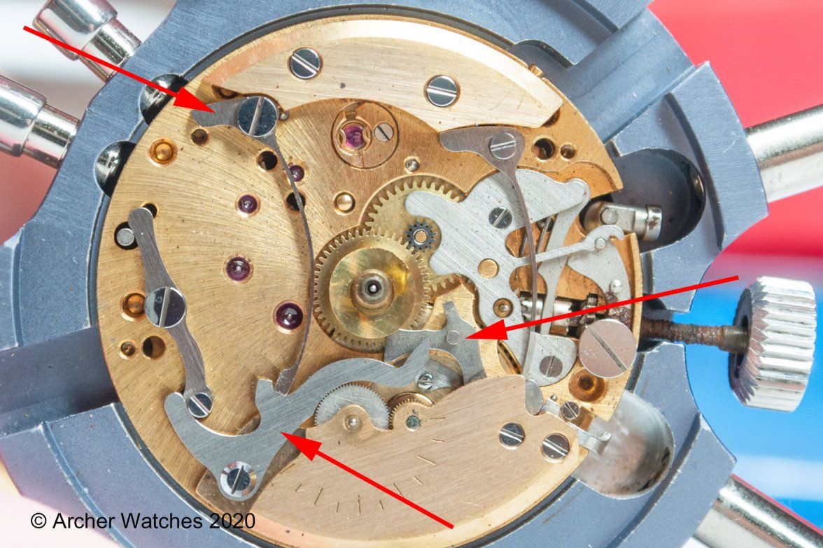 The lever (which is visible in the pictures) looks very strange. It’s as if someone has filed the corner of. The pivot gets stuck on the filed surface and is unable to make full contact with the heart-shaped component of the hour counter wheel.