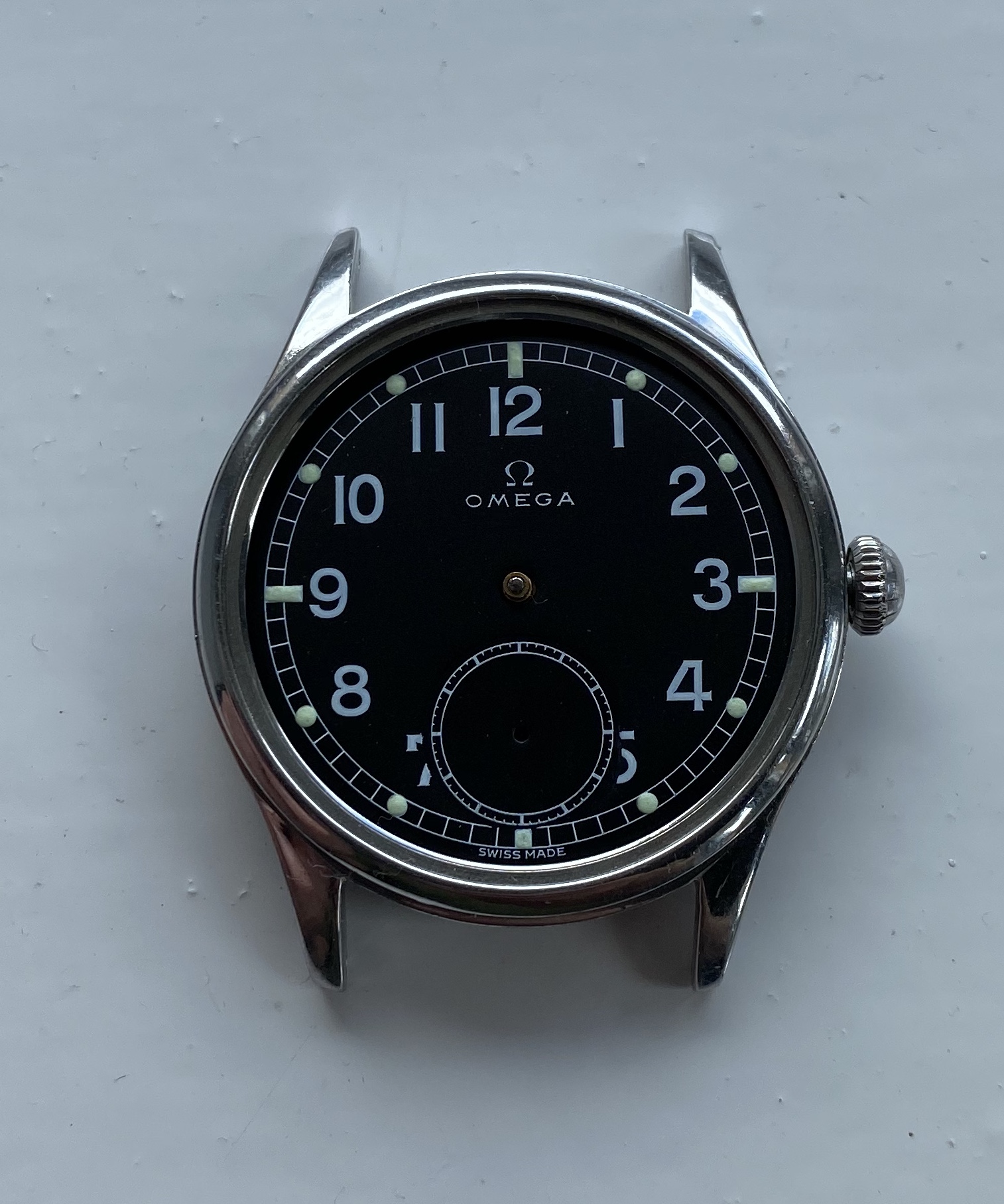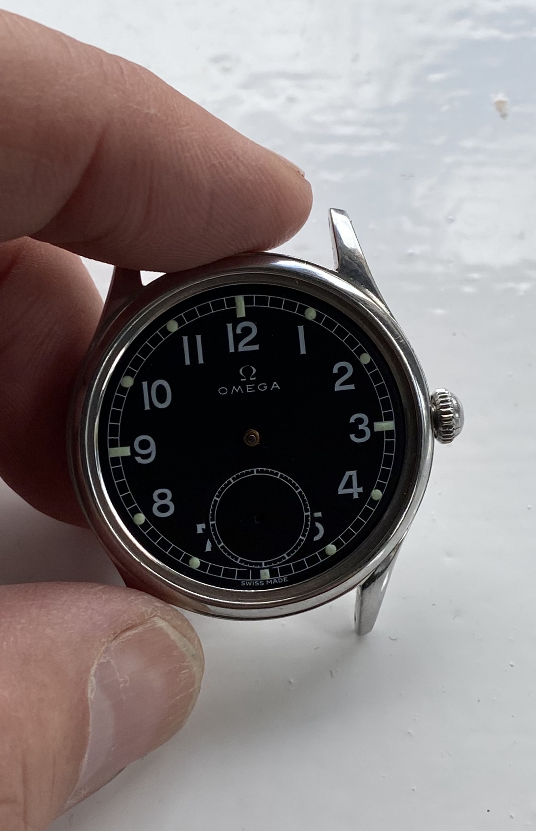 The dial was knackered when i got it, remains of original black paint led me to get it redone as you see by David Bill in London, the lume you see is luminova.