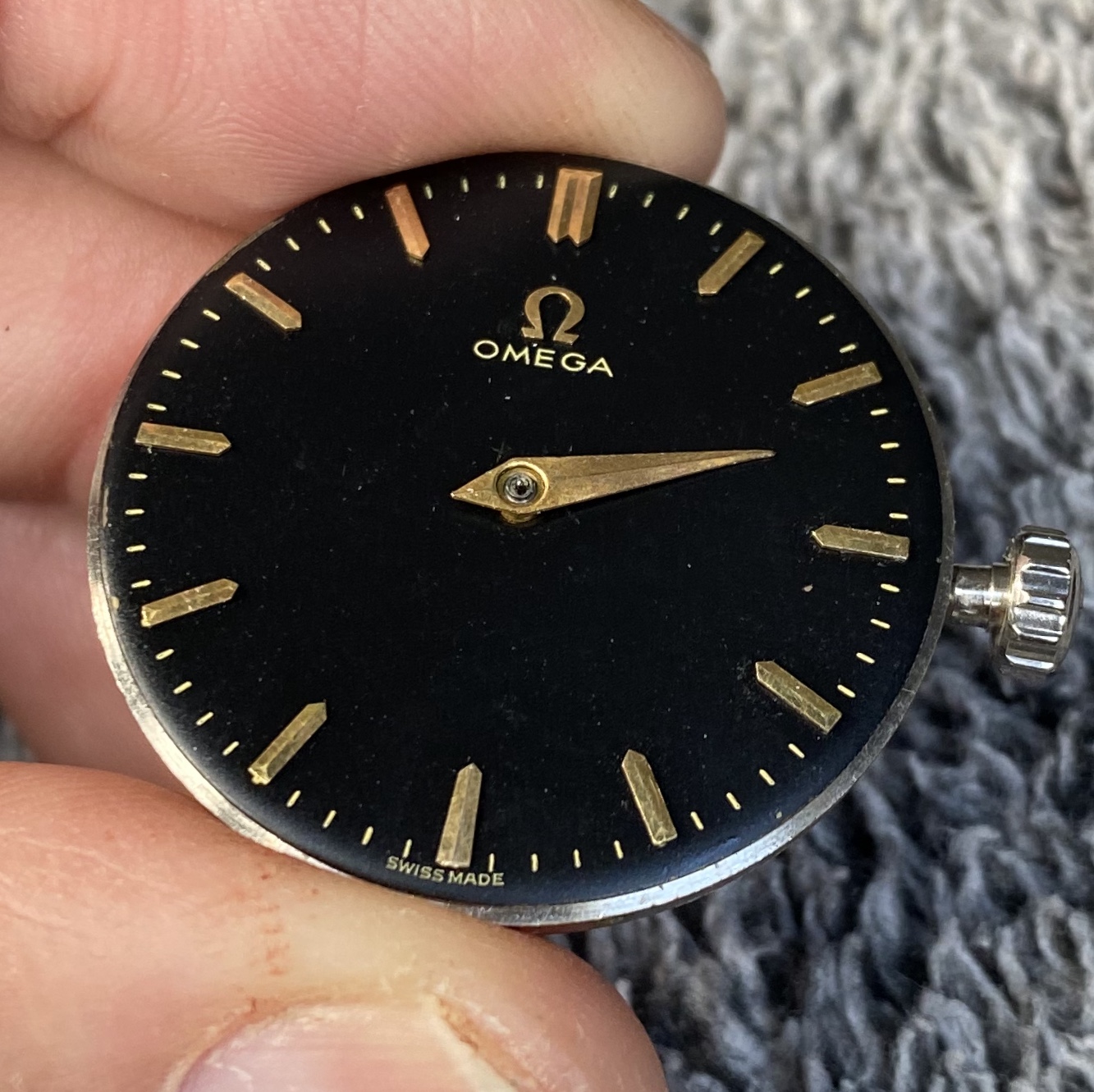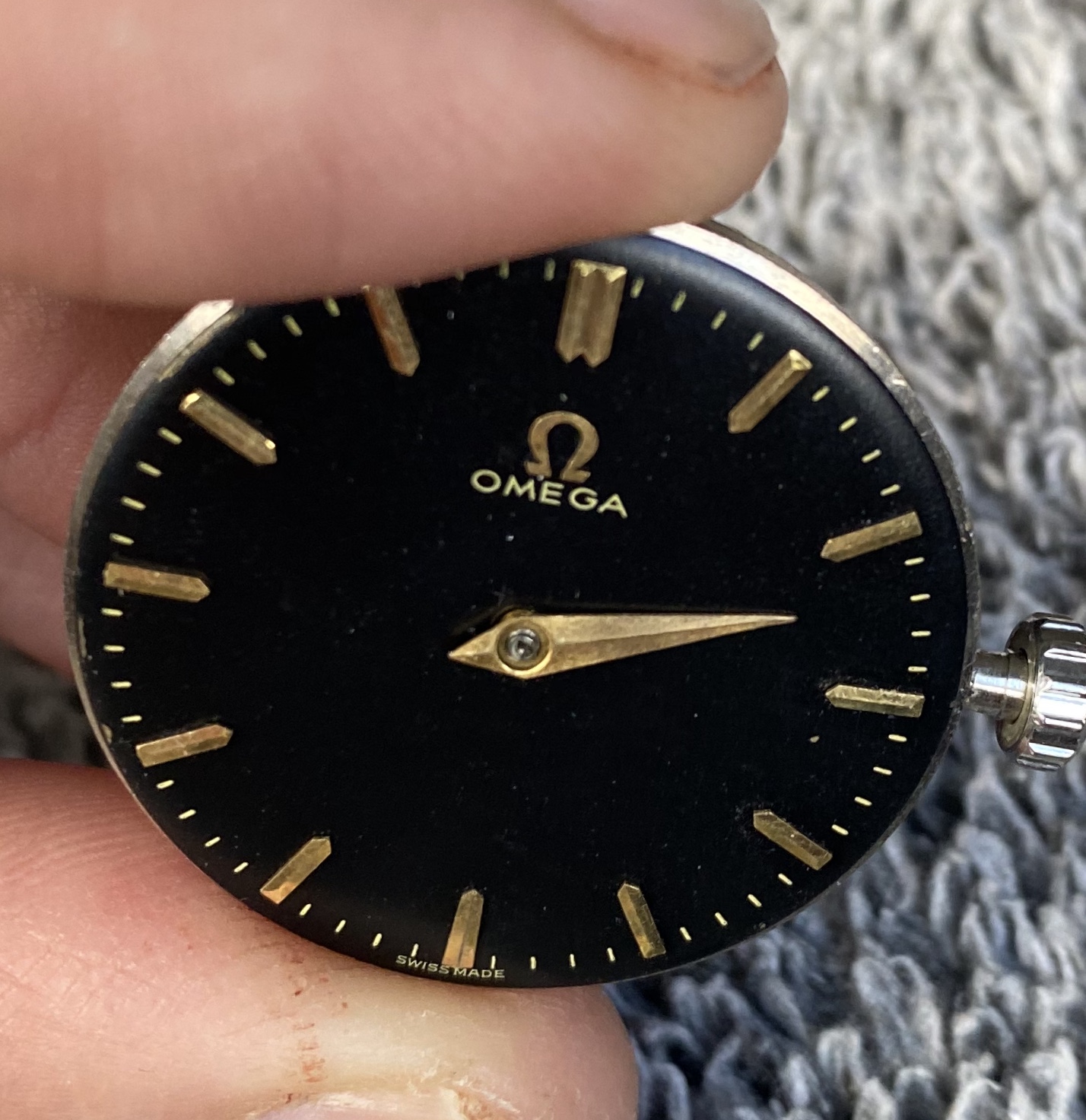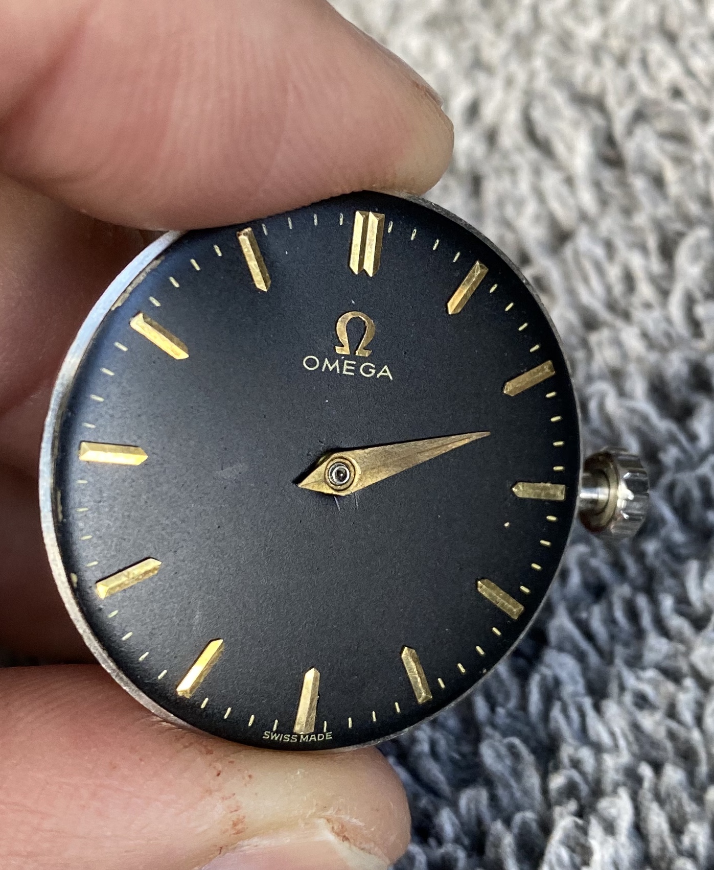 Black dial with hour hand attached, Looks original to me, Omega script, swiss made and second ticks are gold/gilt. Dial feet are present and attached to movement.