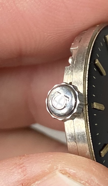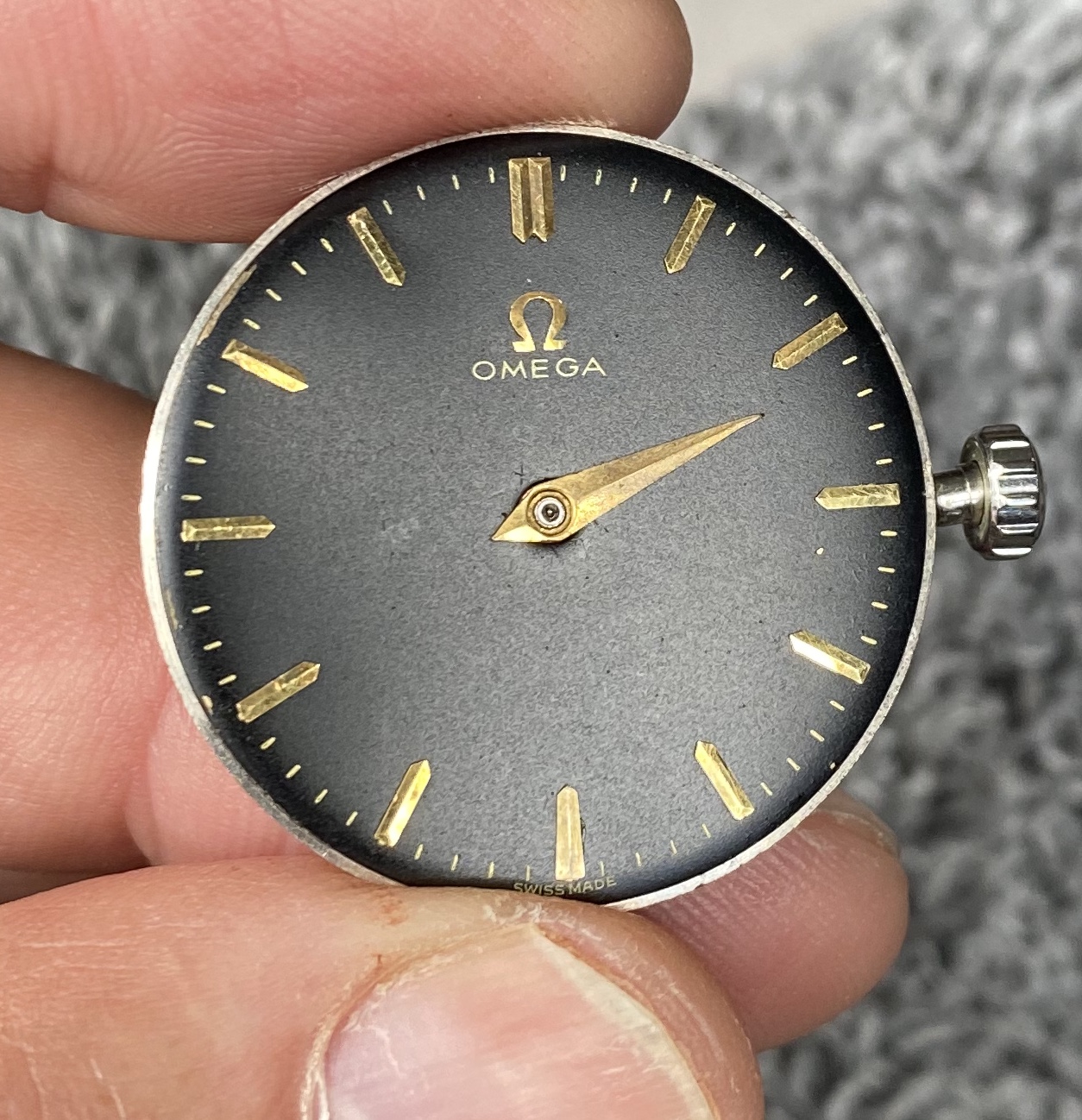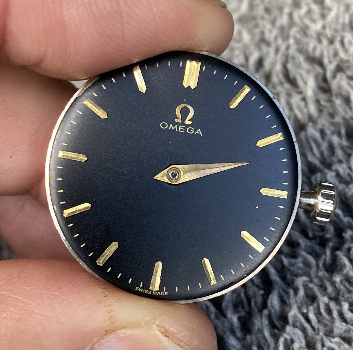 Black dial with hour hand attached, Looks original to me, Omega script, swiss made and second ticks are gold/gilt. Dial feet are present and attached to movement.