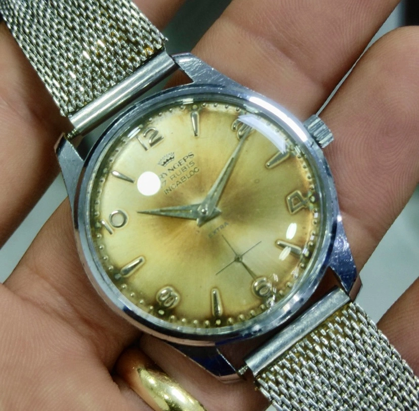I love the radium burn around the centre hand area as well as from the numeral dots which seem to have created a caramel halo effect. The bracelet needs a good clean but apart from that I absolutely love it.