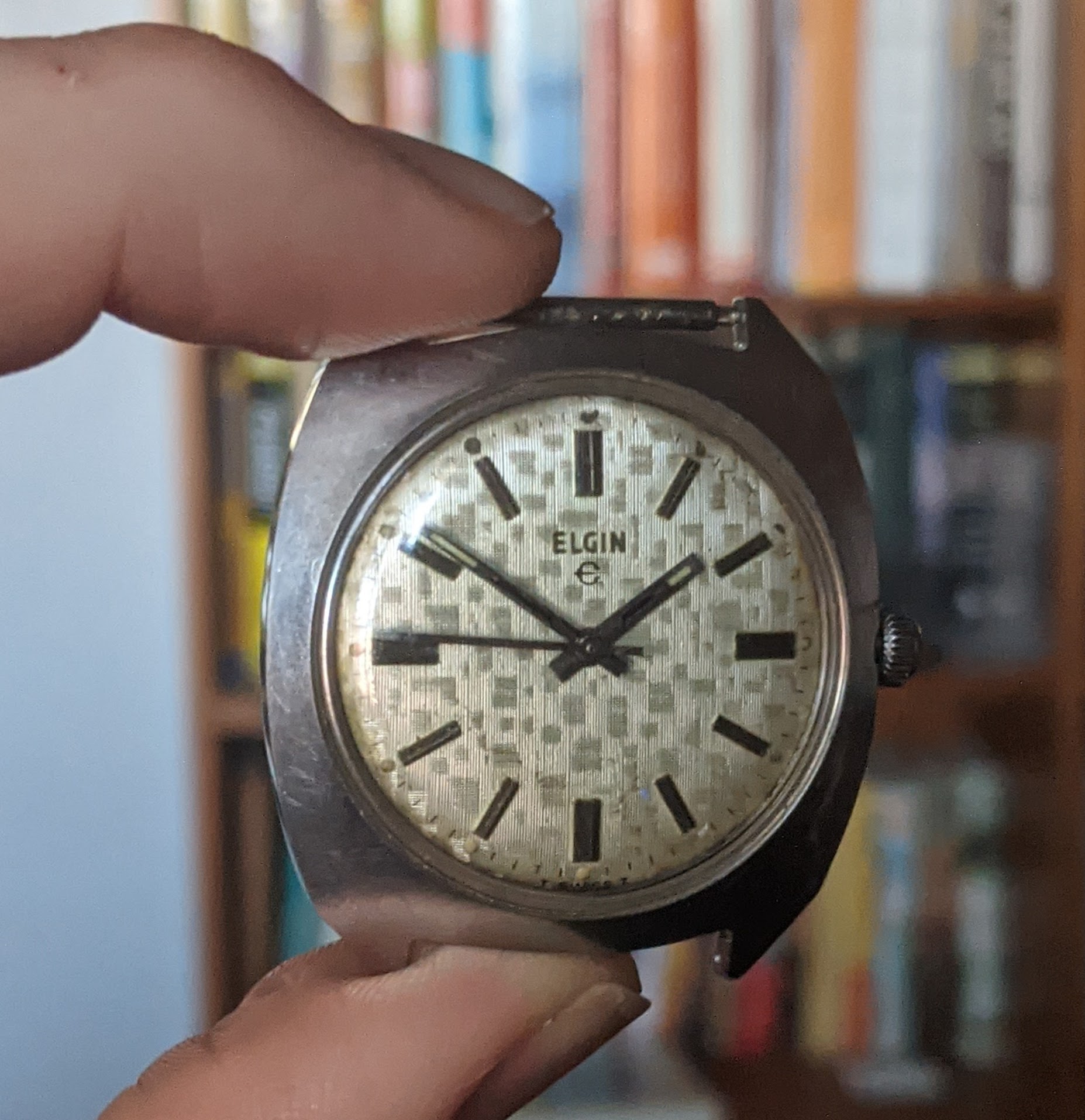 The watch - an automatic Elgin with a very interesting dial and no lugs basically: