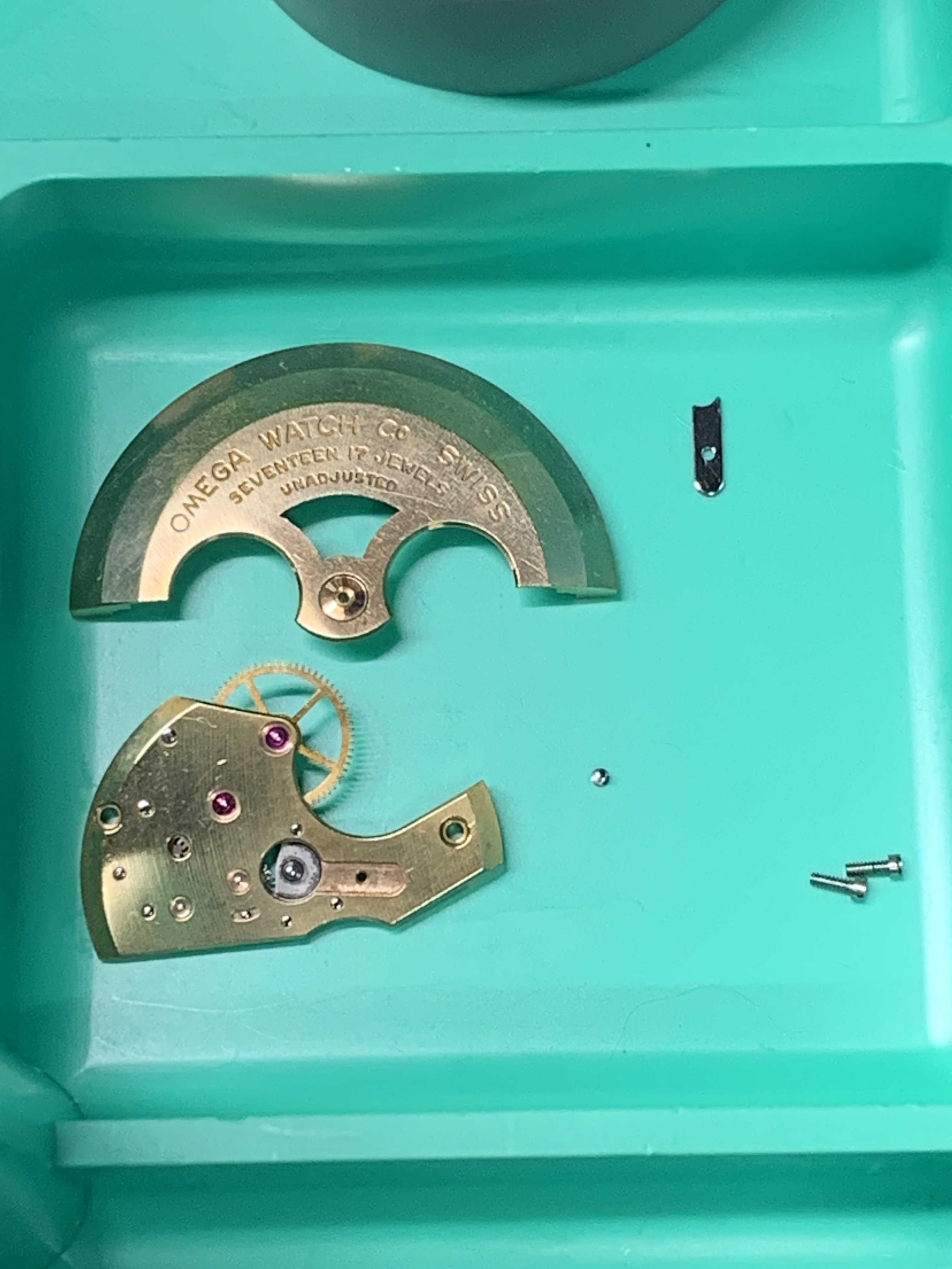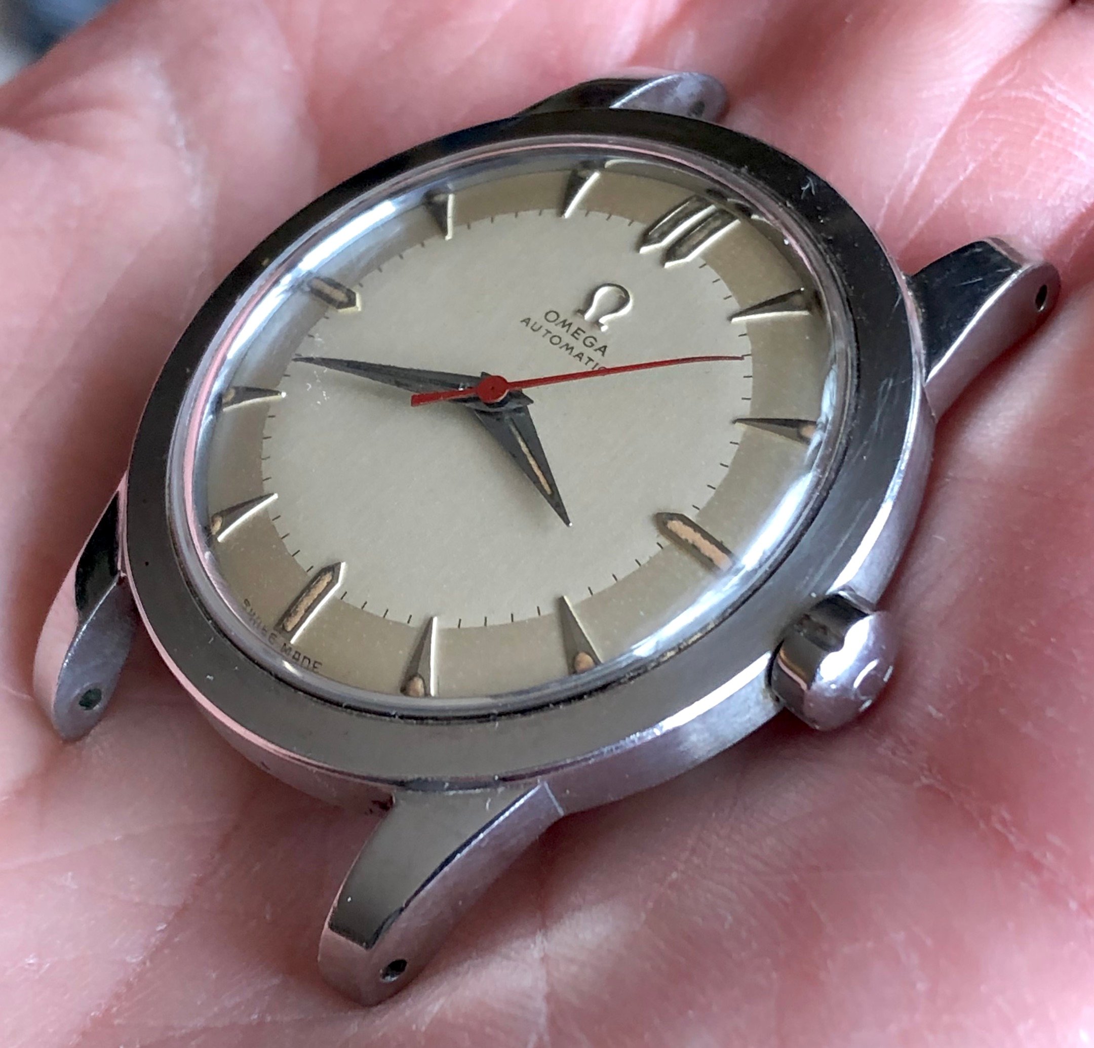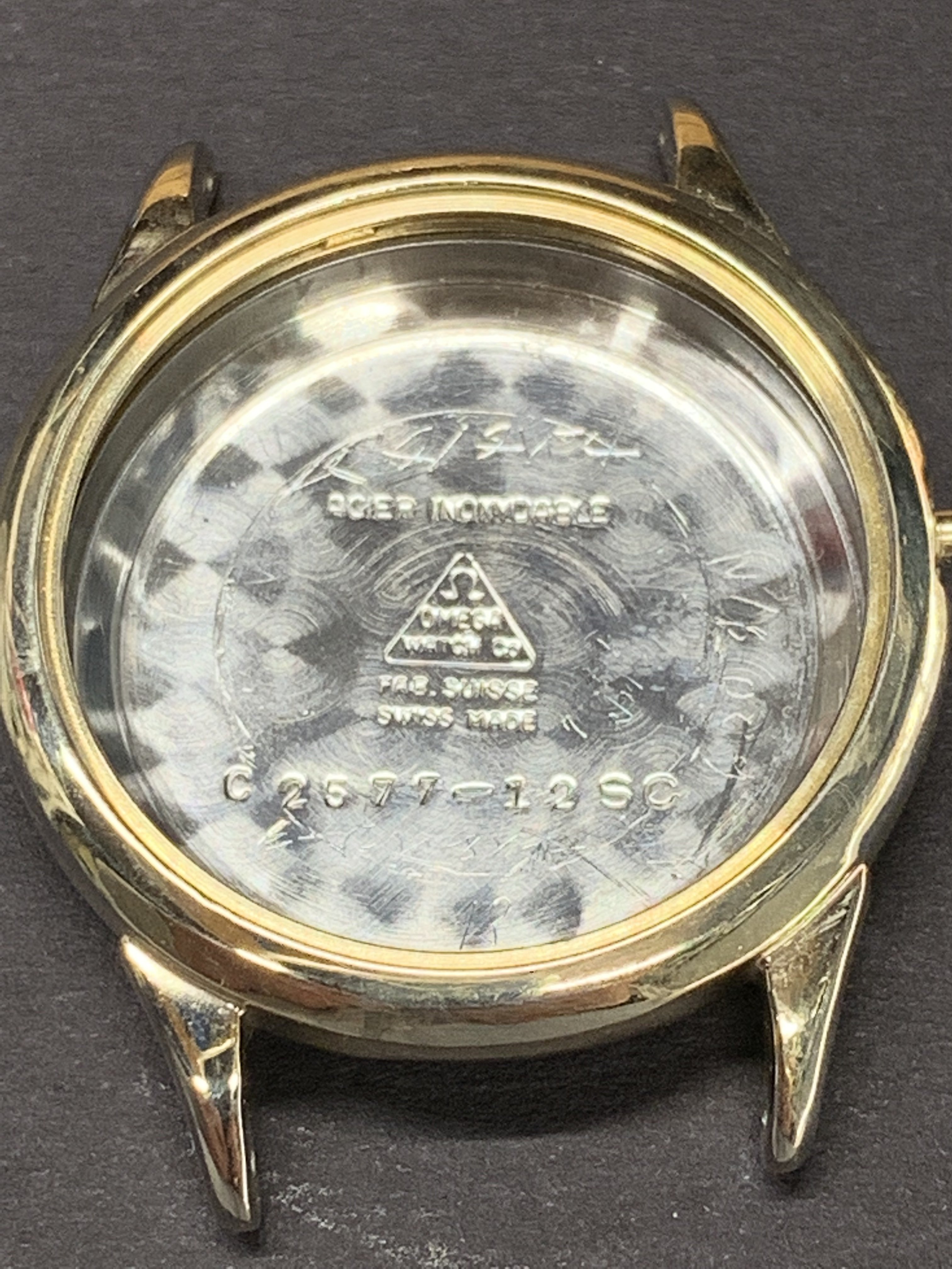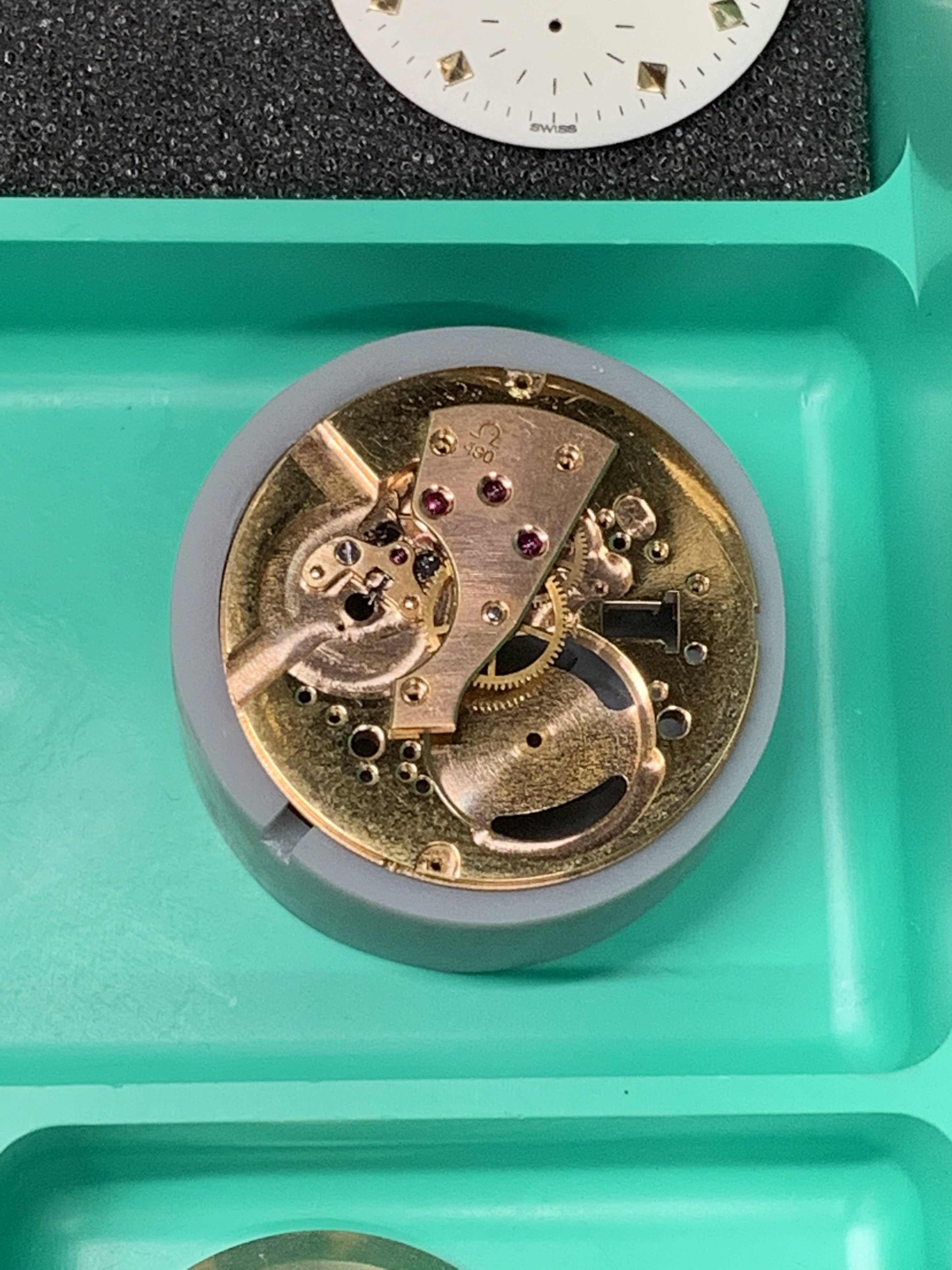The lady showing me the watches, which I have known for years, had two watches; a movado (quartz) that was ok looking (except for a big chip past 12 o’clock) and I said to her that I was not interested in the movado, but I was interested in the “other one” She replied to me; “they are both not working but if I pay to put a new battery in them they will be a lot more”I did not have the heart to tell her that the omega did not take a battery. Instead, I asked her how much for this one? And she confidently replied, ten bucks. I (in a world record setting time) immediately got my wallet out and paid her. As I have mentioned earlier, the first thing I noticed was the hands while she is ringing me up I grab the “soon to be mine” watch and see that it is a screw case, I noticed the dial is in ok condition, bad scratches to the crystal and very poor lighting in the shop made it hard to see it clearly. The crown does not look correct and will not turn, the crystal is very scratched but no big gauges on it. The strap was in terrible shape and one side seemed to be a little bit smalller than the other strap side. No original buckle. And I’m thinking to my self as I get my receipt, gold filled? As I get home, I immediately start prepping my ultrasonic cleaner and getting my shop lights turn on. As I remove the case back and confirm (maybe) that it is indeed a possible seamaster; (maybe)… I run the case and case back in the cleaner. The dial is astonishingly, in near perfect condition (too good to be true?) and the movement is a 490 cal. I see the oxg and determined it is a US market watch and run the serial number that tells me is a mid 1950’s made watch. ‘54-‘60.