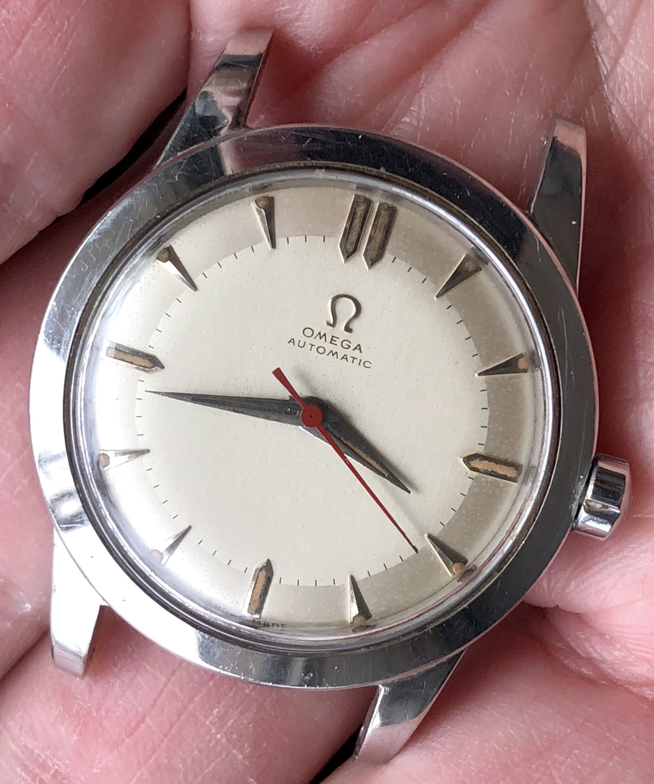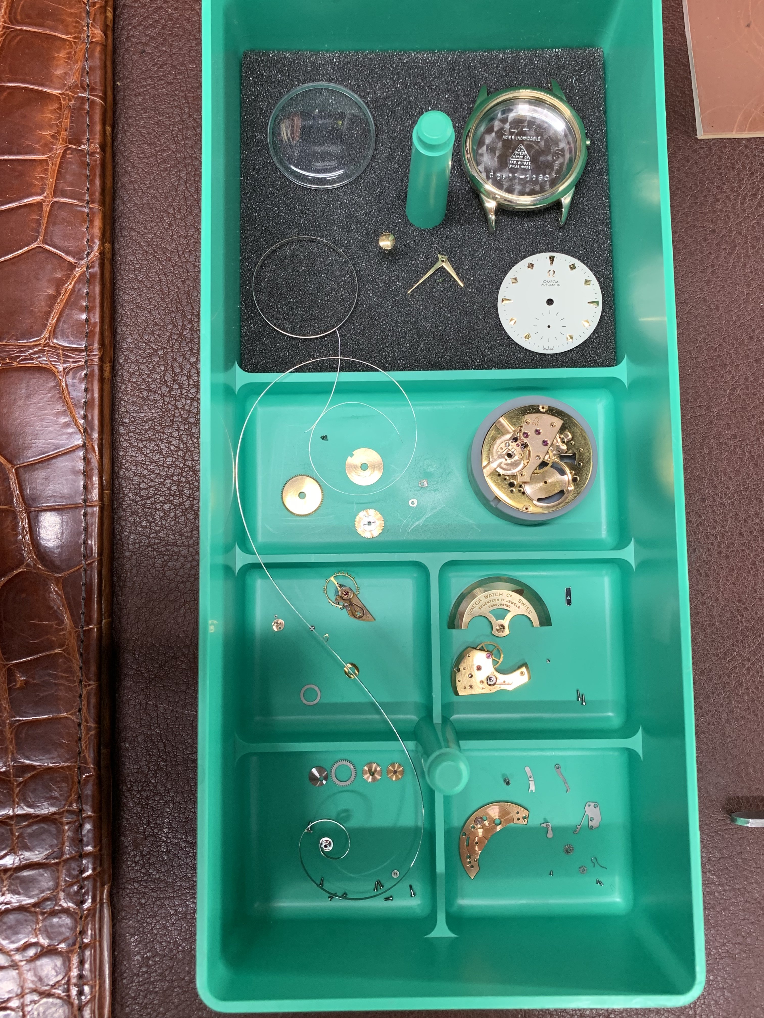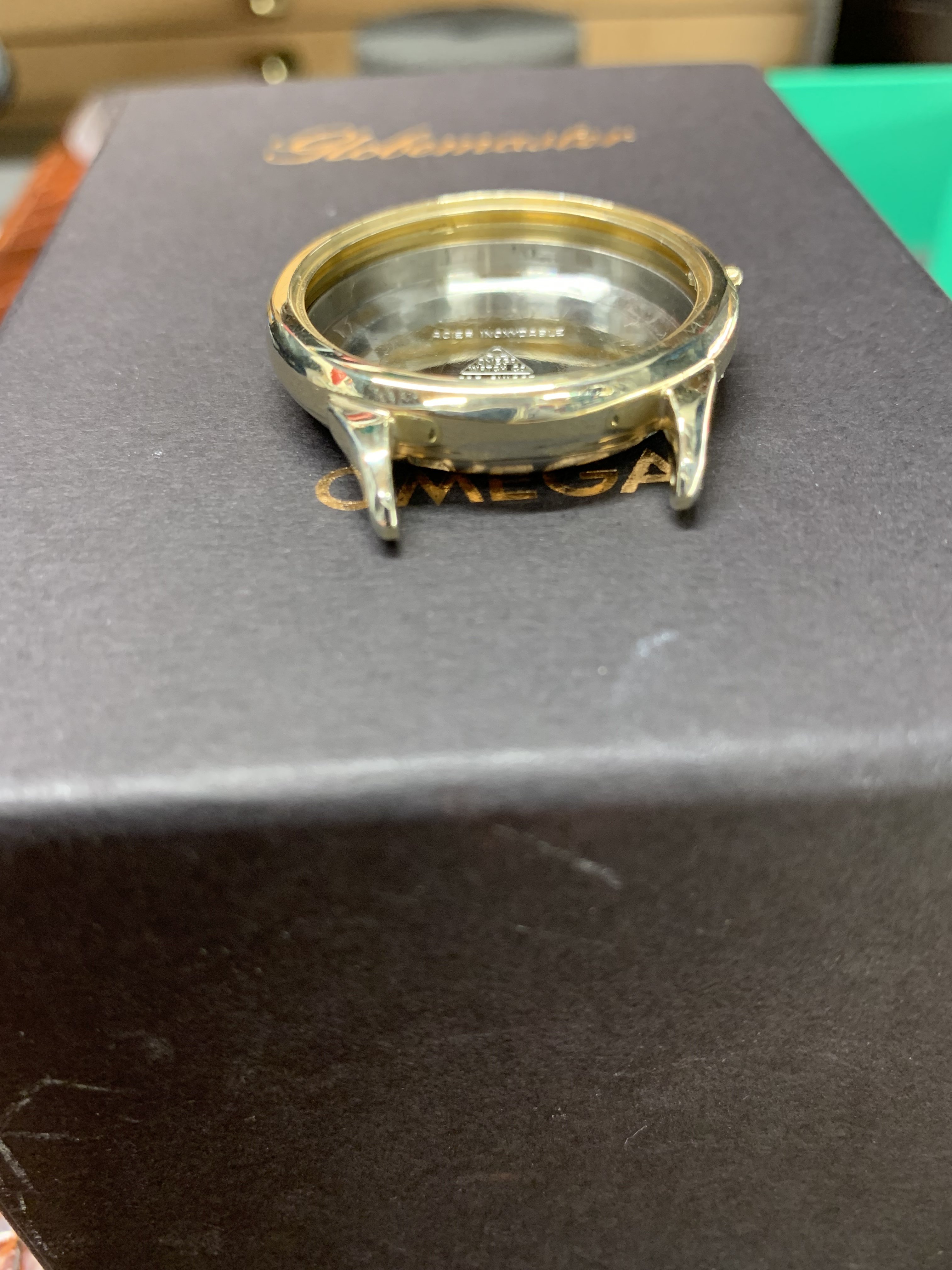 The lady showing me the watches, which I have known for years, had two watches; a movado (quartz) that was ok looking (except for a big chip past 12 o’clock) and I said to her that I was not interested in the movado, but I was interested in the “other one” She replied to me; “they are both not working but if I pay to put a new battery in them they will be a lot more”I did not have the heart to tell her that the omega did not take a battery. Instead, I asked her how much for this one? And she confidently replied, ten bucks. I (in a world record setting time) immediately got my wallet out and paid her. As I have mentioned earlier, the first thing I noticed was the hands while she is ringing me up I grab the “soon to be mine” watch and see that it is a screw case, I noticed the dial is in ok condition, bad scratches to the crystal and very poor lighting in the shop made it hard to see it clearly. The crown does not look correct and will not turn, the crystal is very scratched but no big gauges on it. The strap was in terrible shape and one side seemed to be a little bit smalller than the other strap side. No original buckle. And I’m thinking to my self as I get my receipt, gold filled? As I get home, I immediately start prepping my ultrasonic cleaner and getting my shop lights turn on. As I remove the case back and confirm (maybe) that it is indeed a possible seamaster; (maybe)… I run the case and case back in the cleaner. The dial is astonishingly, in near perfect condition (too good to be true?) and the movement is a 490 cal. I see the oxg and determined it is a US market watch and run the serial number that tells me is a mid 1950’s made watch. ‘54-‘60.