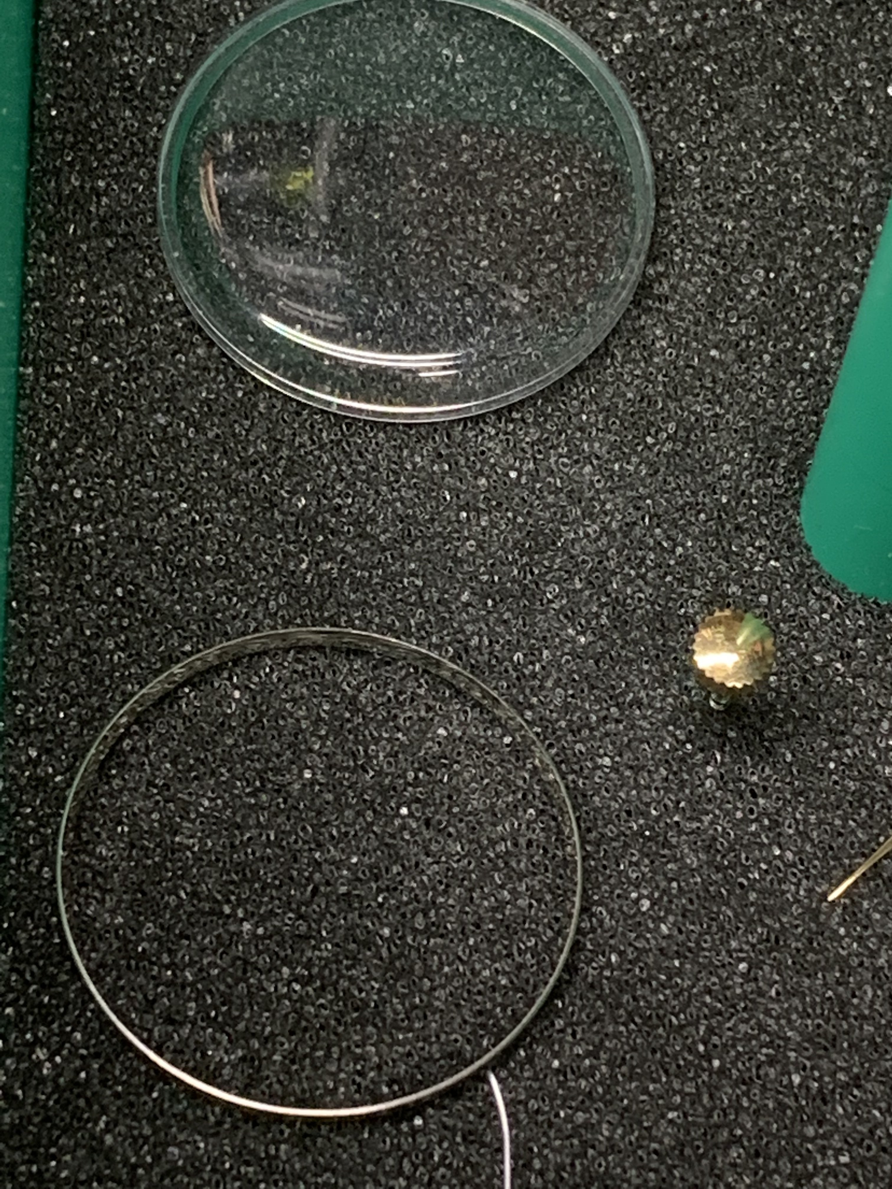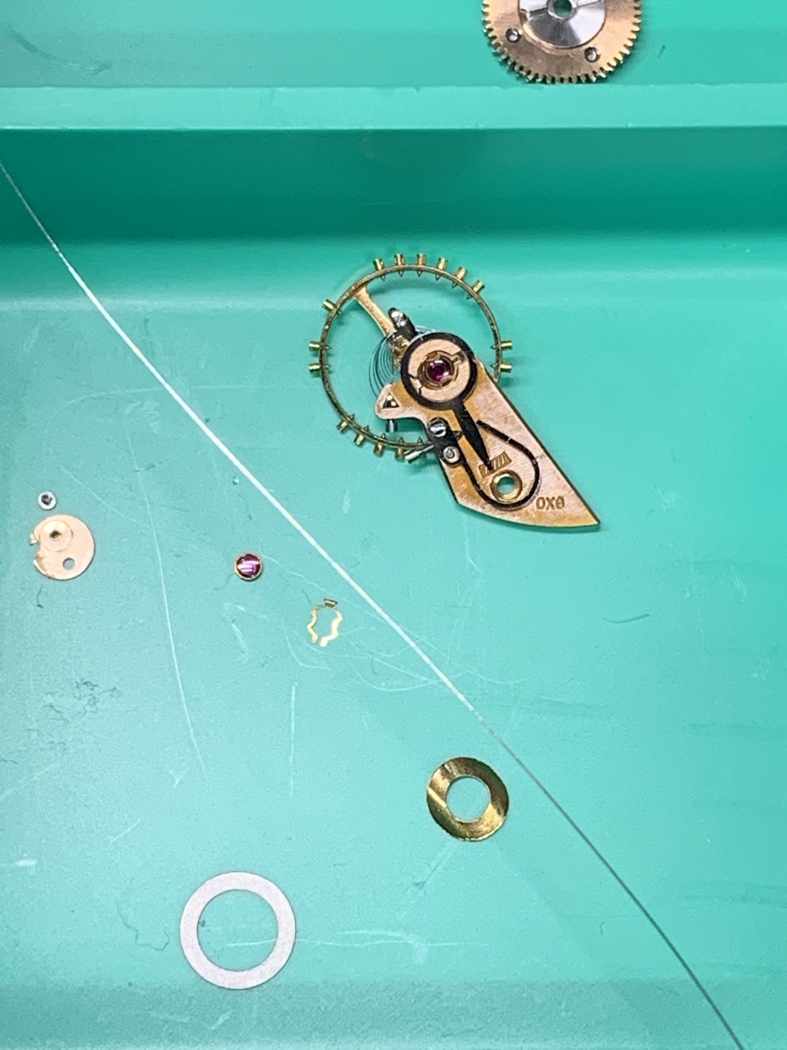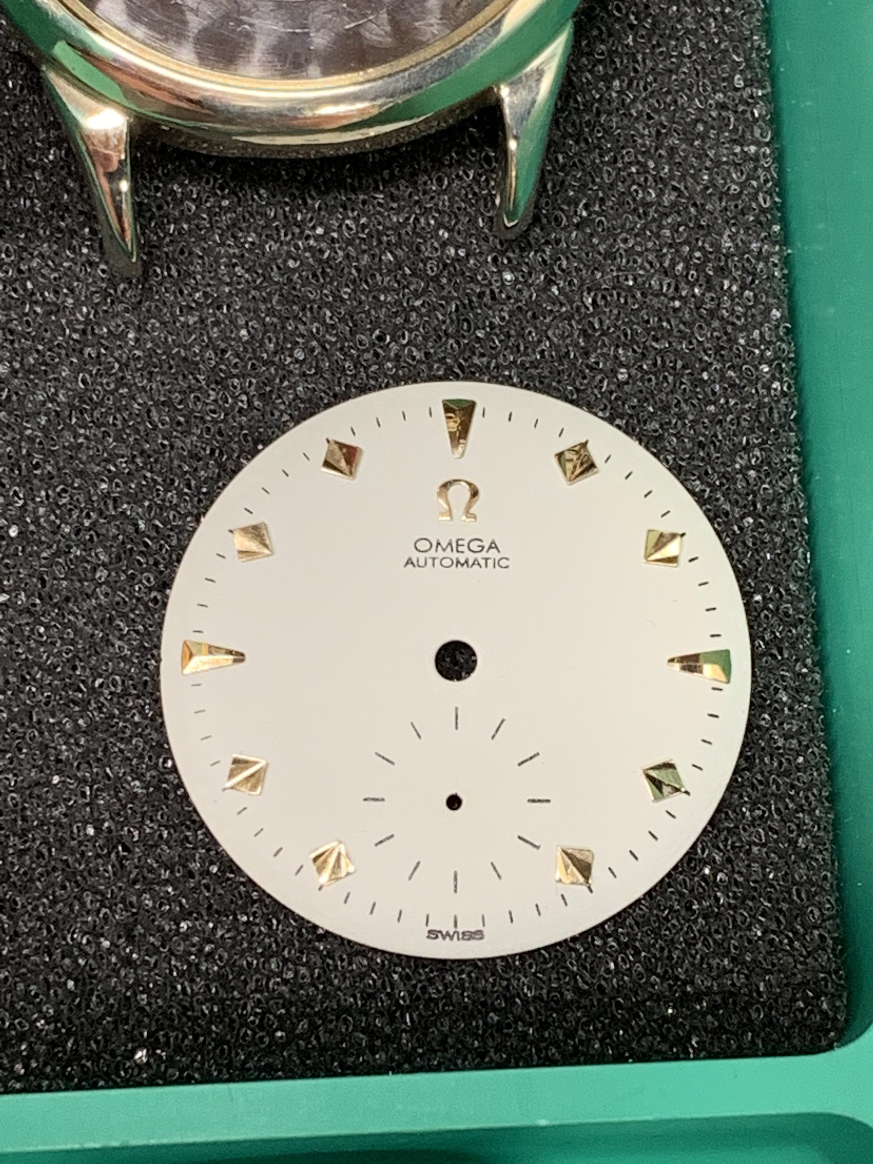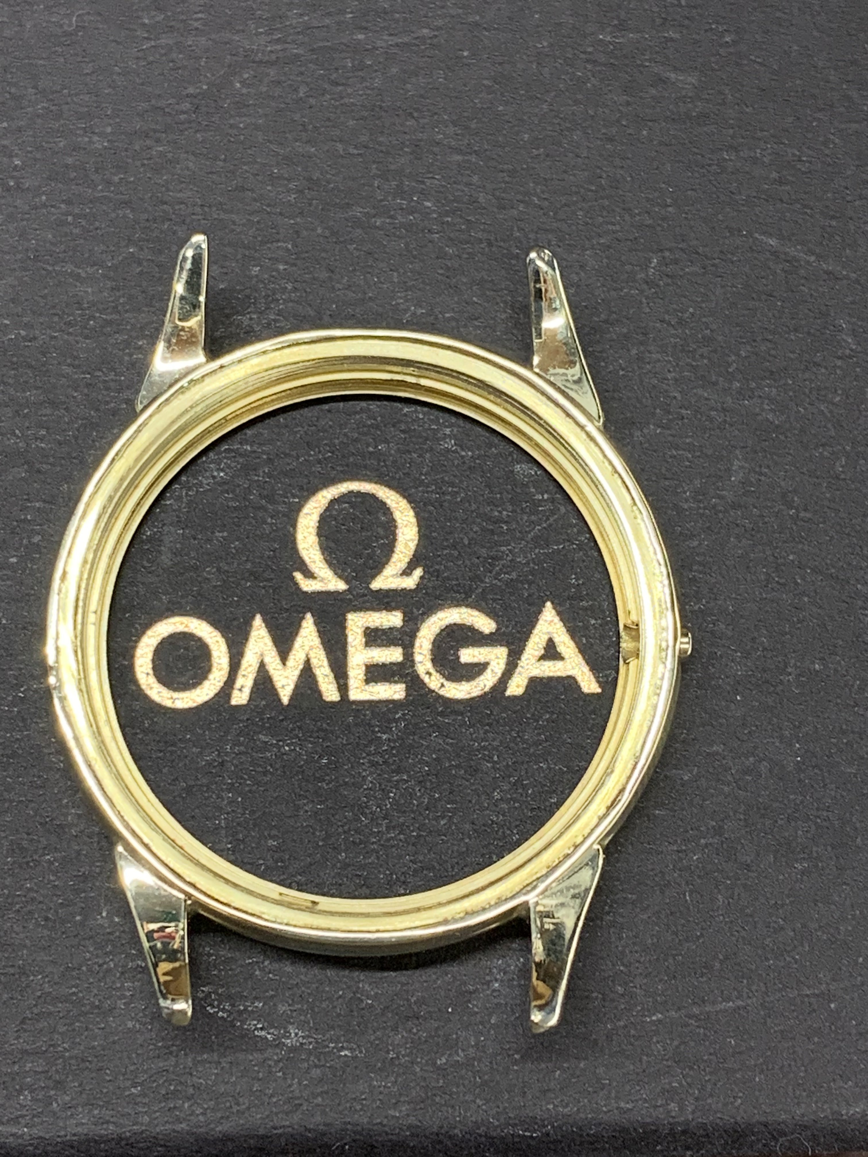 The lady showing me the watches, which I have known for years, had two watches; a movado (quartz) that was ok looking (except for a big chip past 12 o’clock) and I said to her that I was not interested in the movado, but I was interested in the “other one” She replied to me; “they are both not working but if I pay to put a new battery in them they will be a lot more”I did not have the heart to tell her that the omega did not take a battery. Instead, I asked her how much for this one? And she confidently replied, ten bucks. I (in a world record setting time) immediately got my wallet out and paid her. As I have mentioned earlier, the first thing I noticed was the hands while she is ringing me up I grab the “soon to be mine” watch and see that it is a screw case, I noticed the dial is in ok condition, bad scratches to the crystal and very poor lighting in the shop made it hard to see it clearly. The crown does not look correct and will not turn, the crystal is very scratched but no big gauges on it. The strap was in terrible shape and one side seemed to be a little bit smalller than the other strap side. No original buckle. And I’m thinking to my self as I get my receipt, gold filled? As I get home, I immediately start prepping my ultrasonic cleaner and getting my shop lights turn on. As I remove the case back and confirm (maybe) that it is indeed a possible seamaster; (maybe)… I run the case and case back in the cleaner. The dial is astonishingly, in near perfect condition (too good to be true?) and the movement is a 490 cal. I see the oxg and determined it is a US market watch and run the serial number that tells me is a mid 1950’s made watch. ‘54-‘60.
