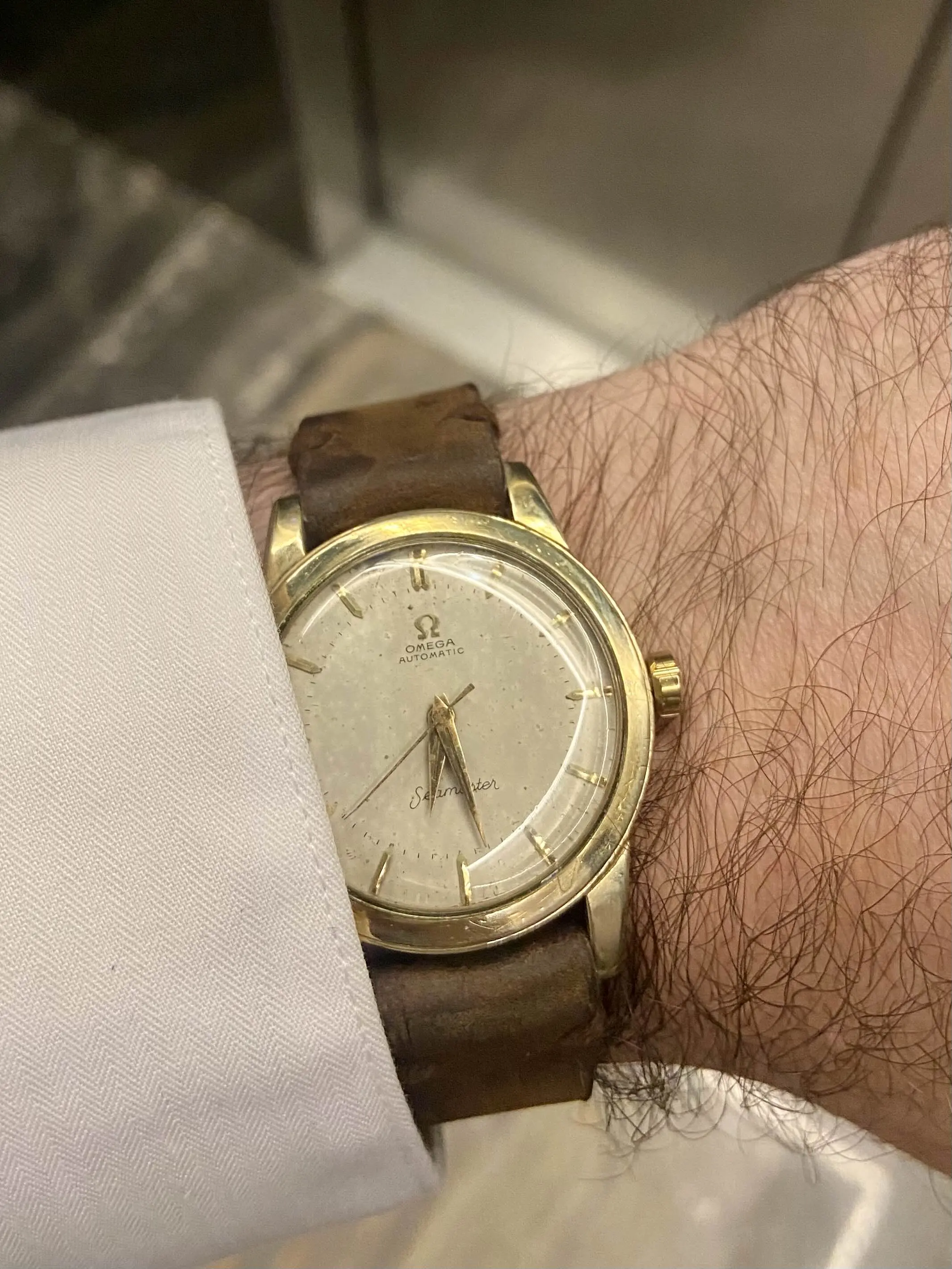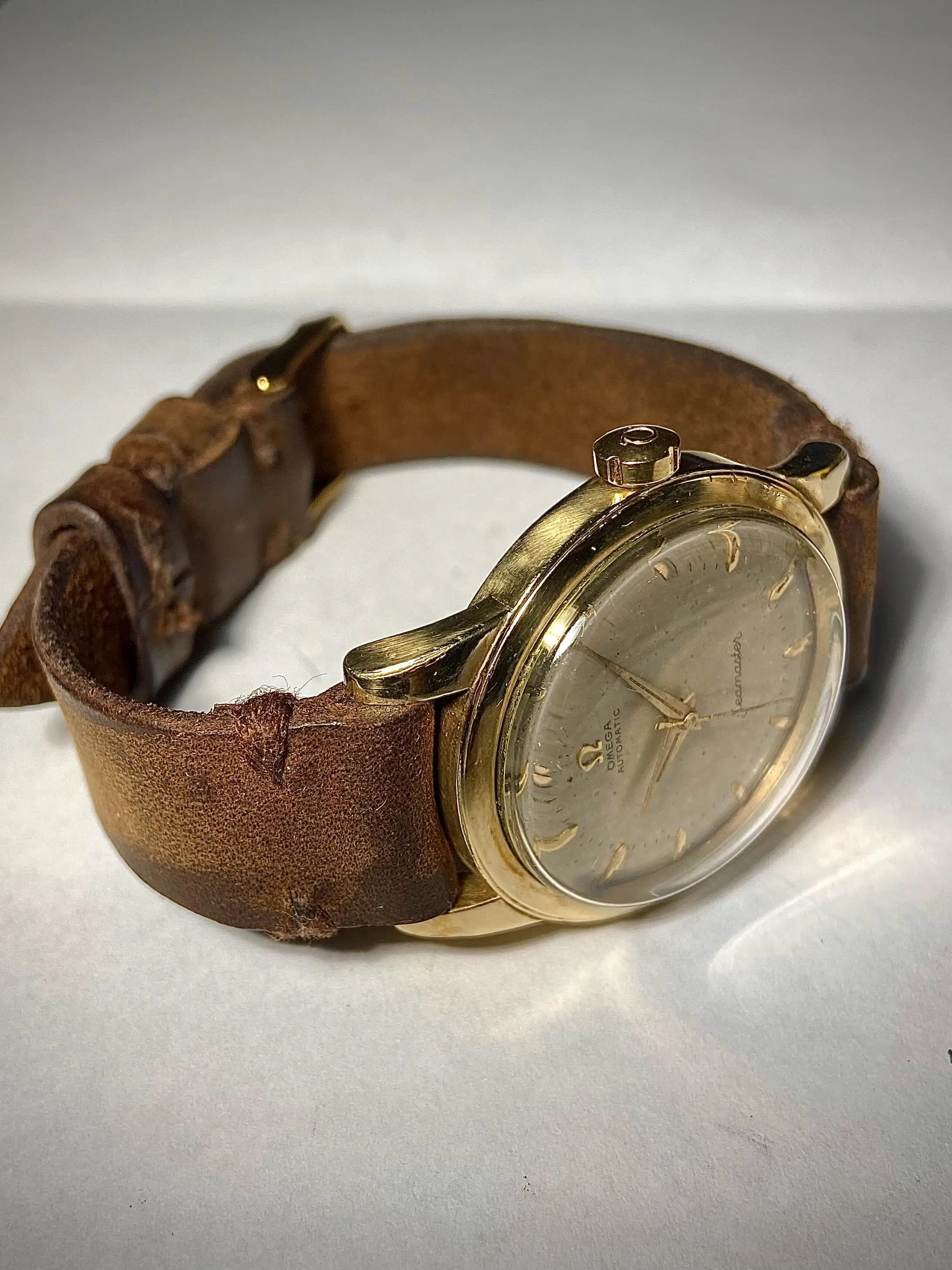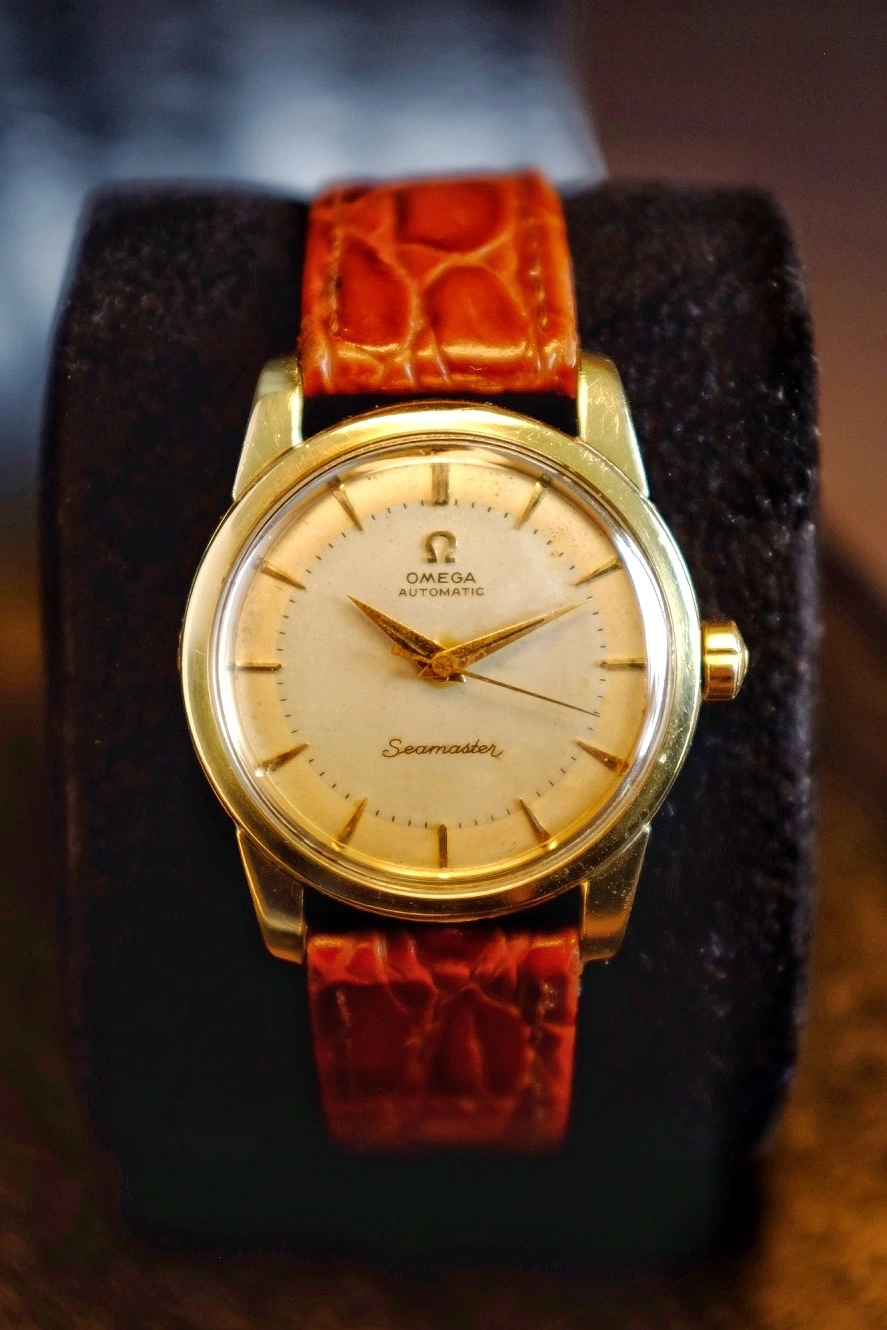 "Hey, so this is a 1958 (I think, according to the serial number) Omega Seamaster Caliber 500, ref GX6250. I serviced it myself last year, and I can take a timegrapher reading tomorrow or this weekend if you want. The case is 14k gold filled. Theres that little nick in the bezel I'm sure you can see. The strap is homemade, as I mentioned. I do like it a lot, but would be willing to let it go for a flat $600."