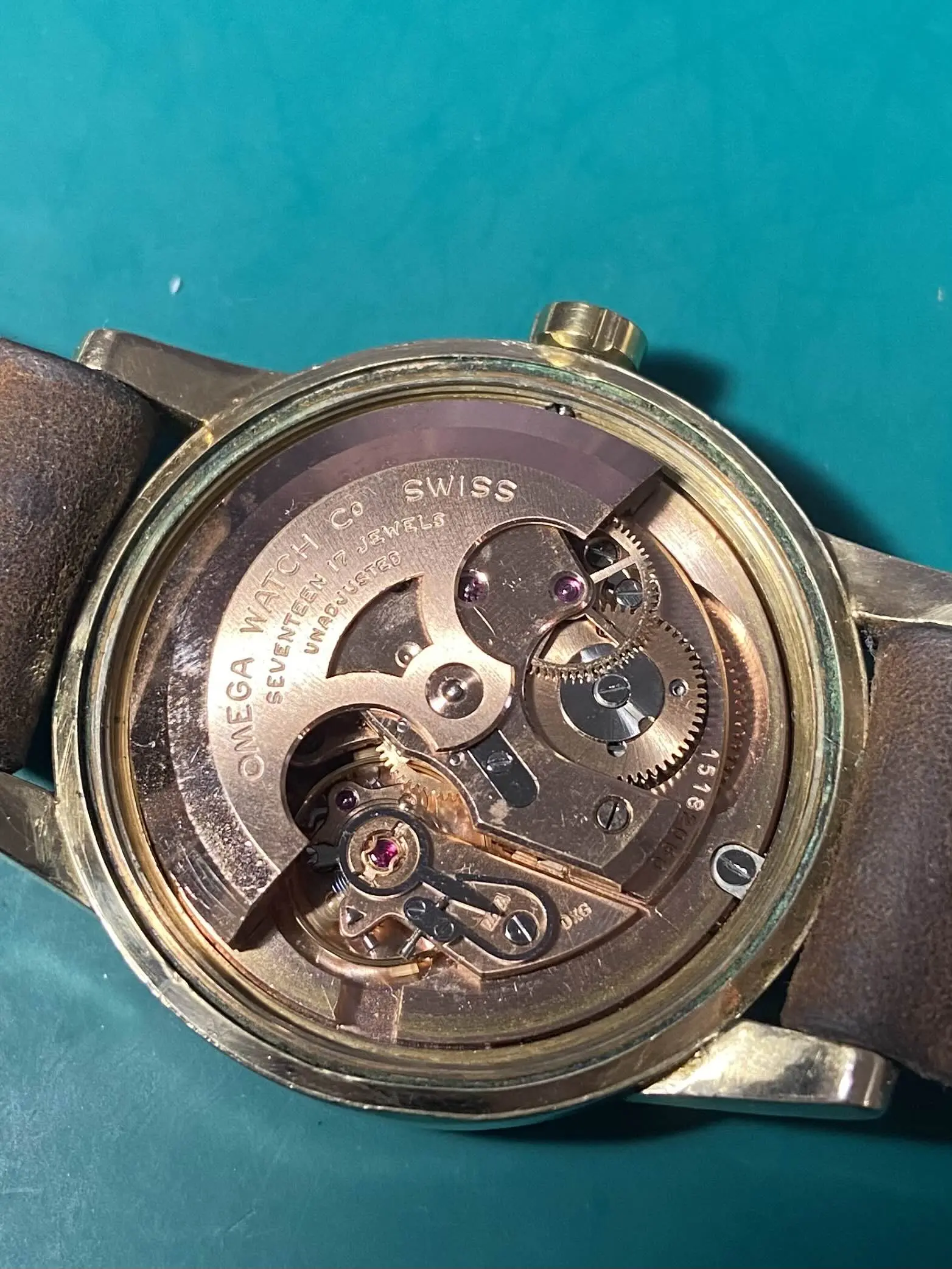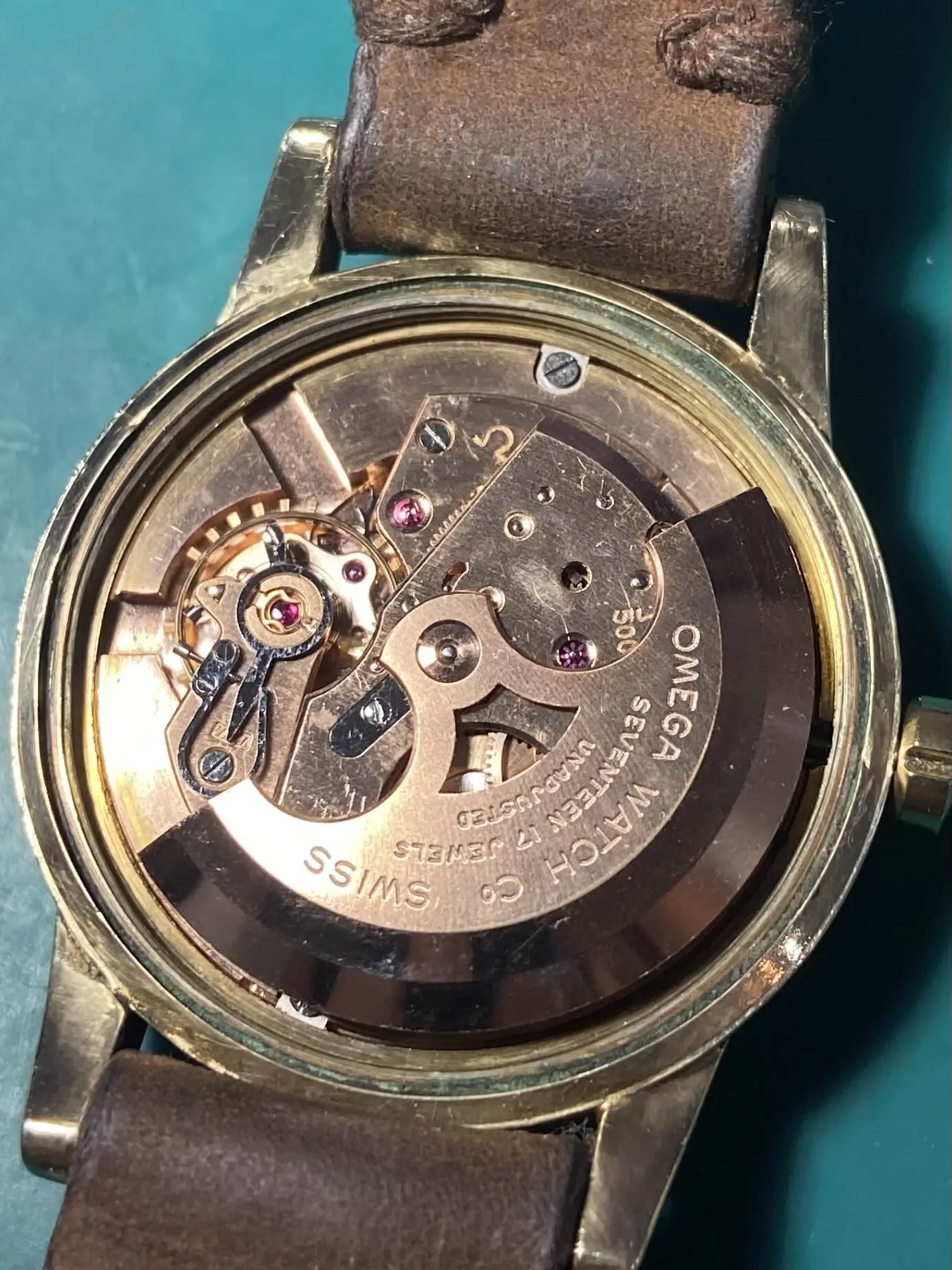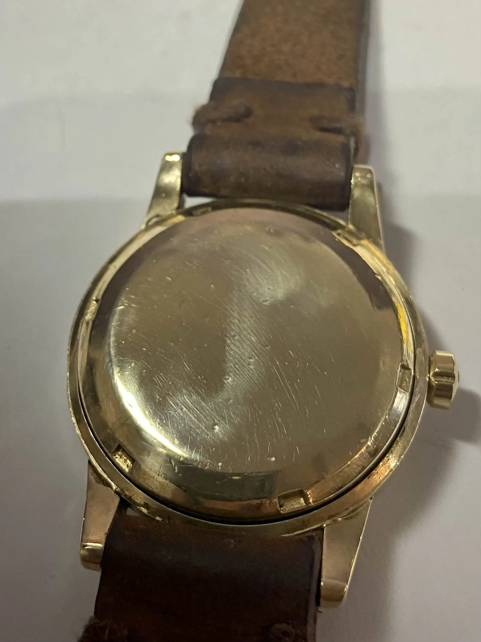 "Hey, so this is a 1958 (I think, according to the serial number) Omega Seamaster Caliber 500, ref GX6250. I serviced it myself last year, and I can take a timegrapher reading tomorrow or this weekend if you want. The case is 14k gold filled. Theres that little nick in the bezel I'm sure you can see. The strap is homemade, as I mentioned. I do like it a lot, but would be willing to let it go for a flat $600."