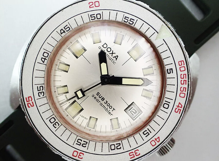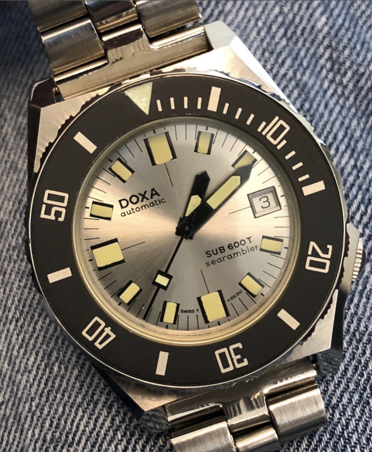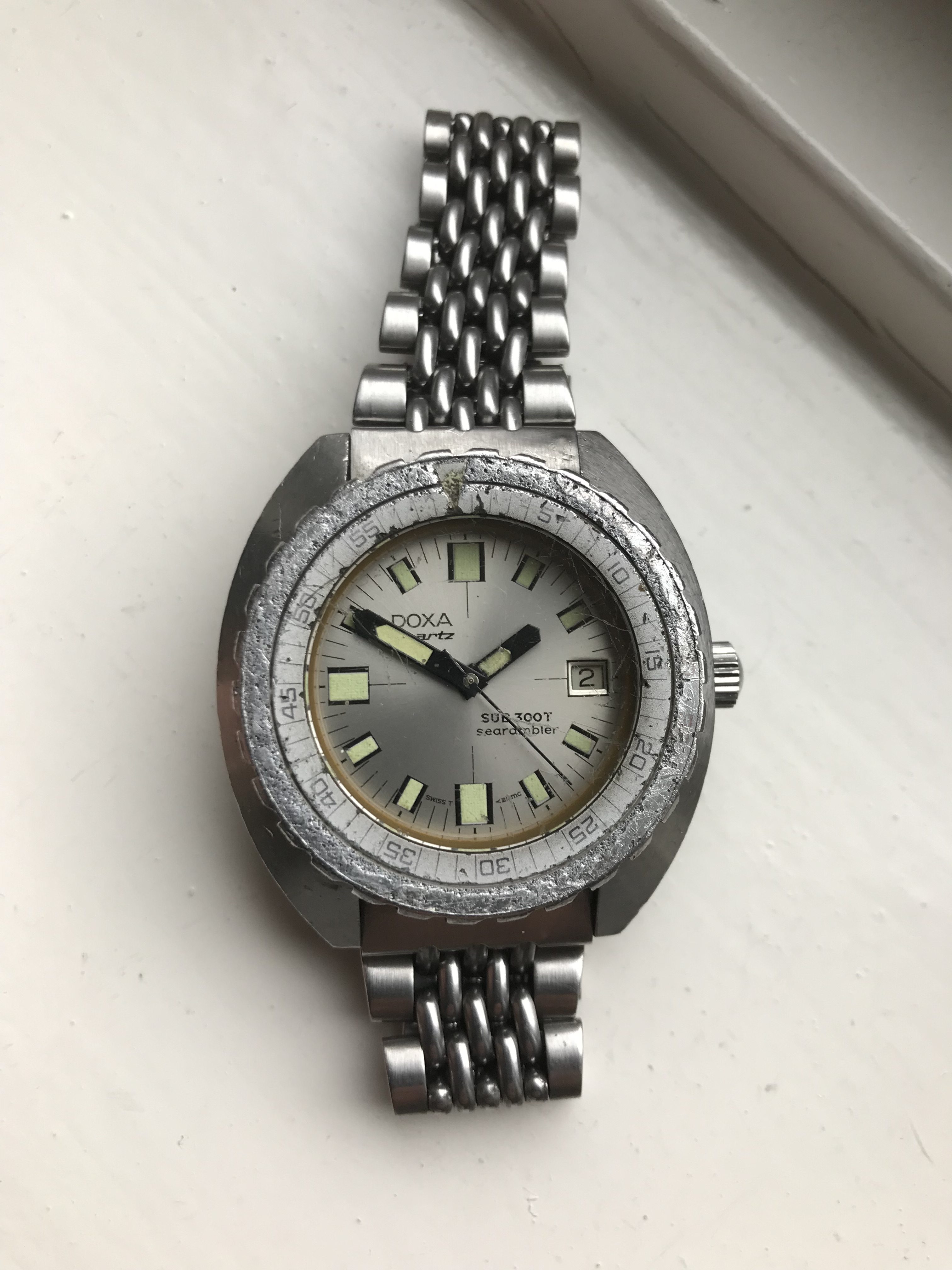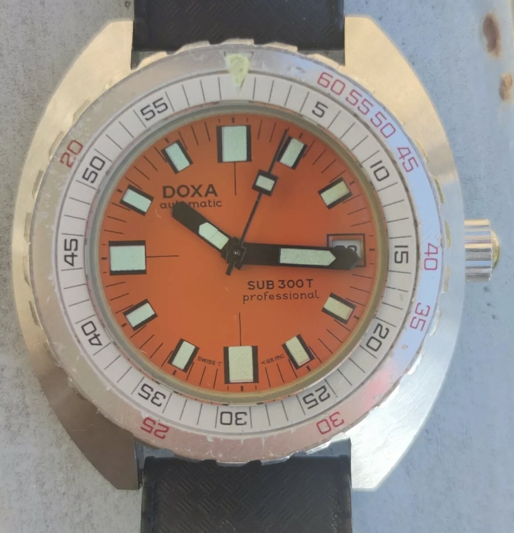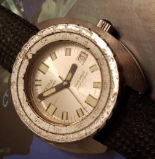 路I understand that the Aubry era started in the early 80s with transition to a different styled case with crown at 4 and with an aluminum insert featuring a triangular rather than the earlier circular lume pip. Here we have something that seems to borrow from the Synchron era and from the Aubry era. Is this an original example that happens to be transitional piece or do we have a franken?
