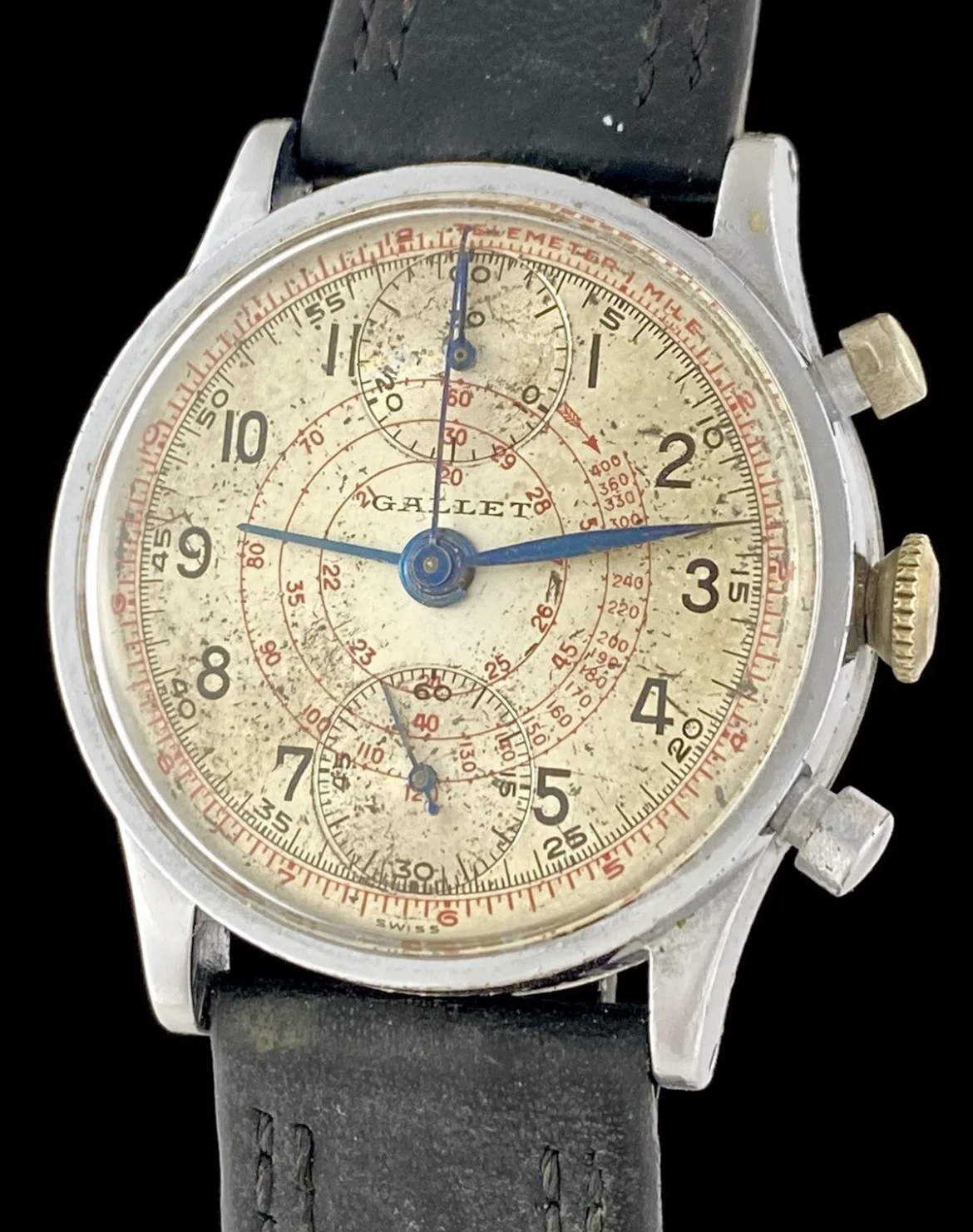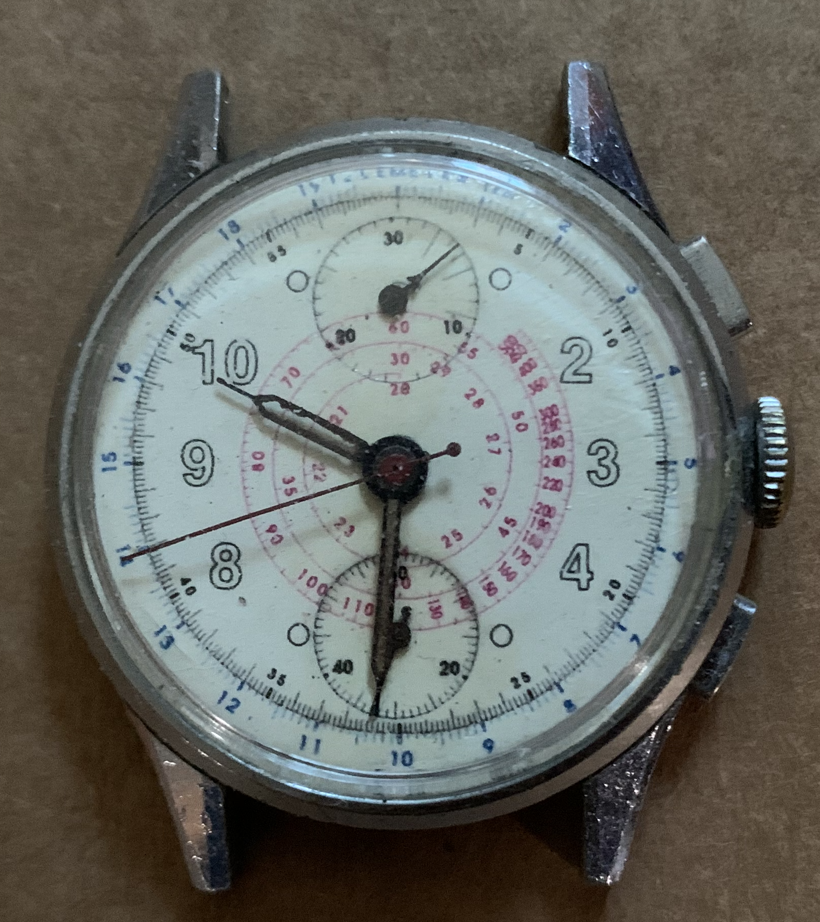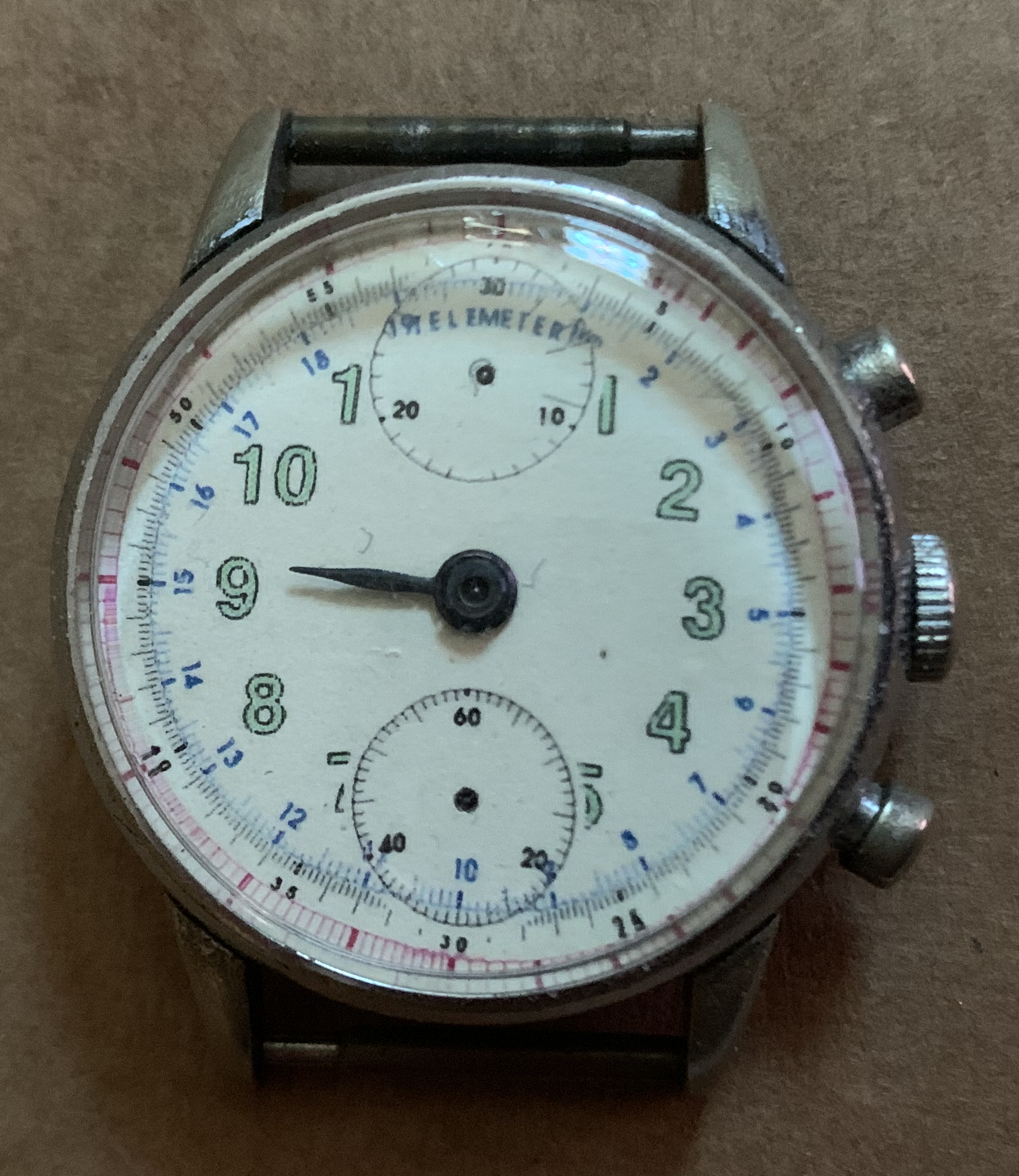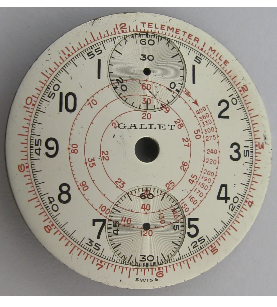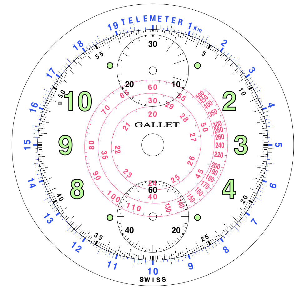 2. Variation in spacing between the 7 o’clock marker which contacts the periphery of the lower subdial while the 5 o’clock marker does not