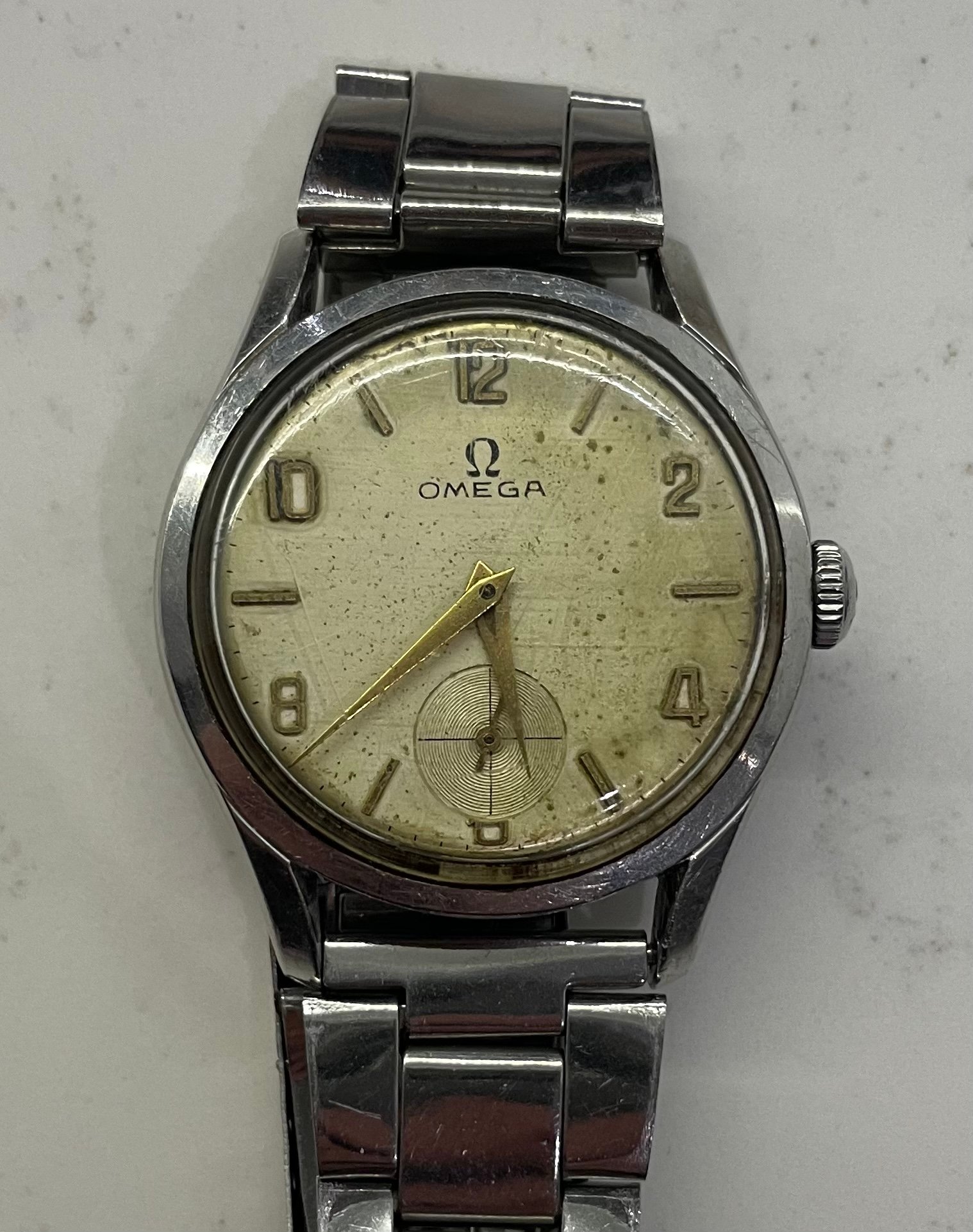 Looking up the serial number online the only thing I could find is that the watch was made in 1952. It still works to this day, which is really amazing (good manual movement?). The strap and the glass are NOT original Omega parts, my grandfather changed them because the old were too damaged back then. Dunno why he didn't keep those. The crown, case, dial and the movement are all as they were when he got it.