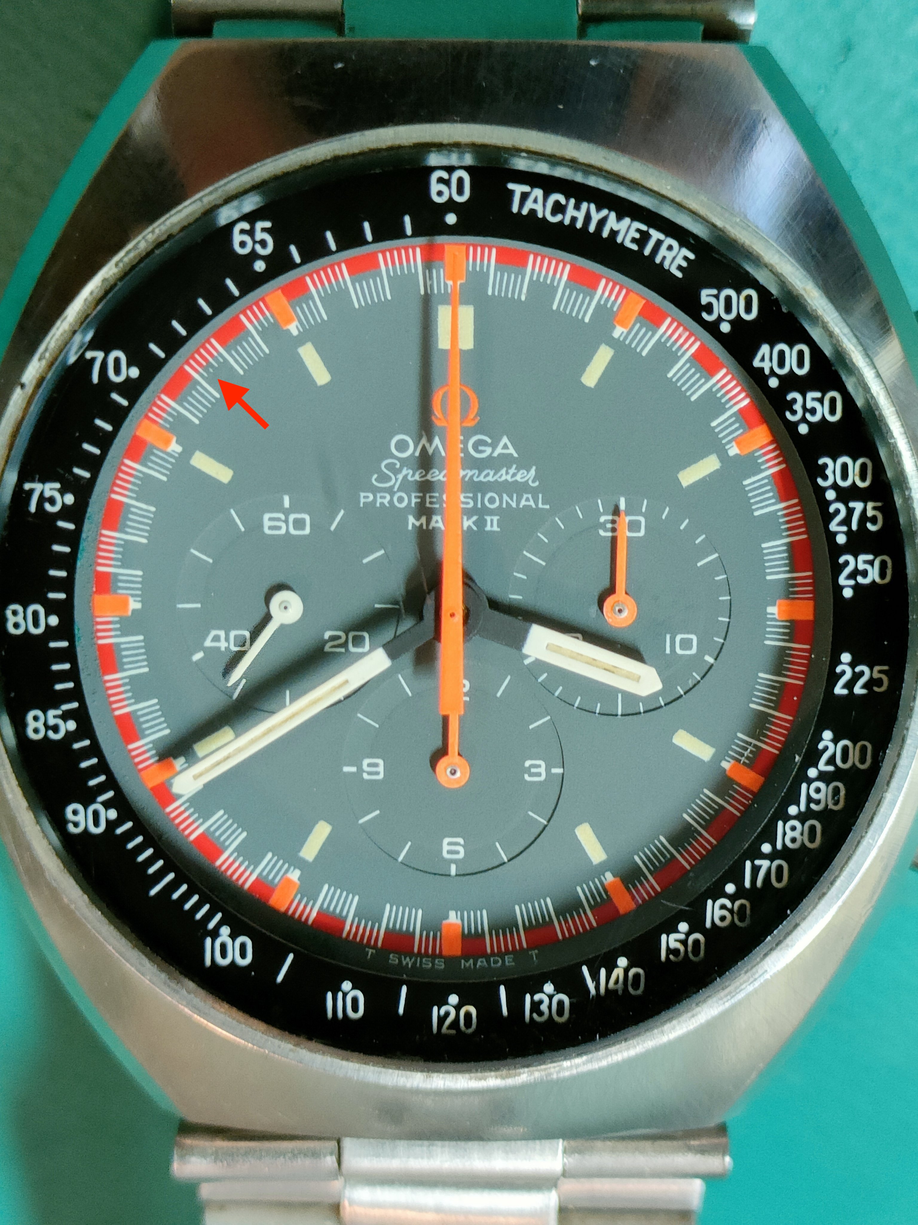 (2). Is this dial a refurnished dial? or repainted dial? For example, one of white ticks between 10 o'clock and 11 o'clock was discontinued (please see the red circle on the picture). And the thickness of some white ticks seems to not very uniform.