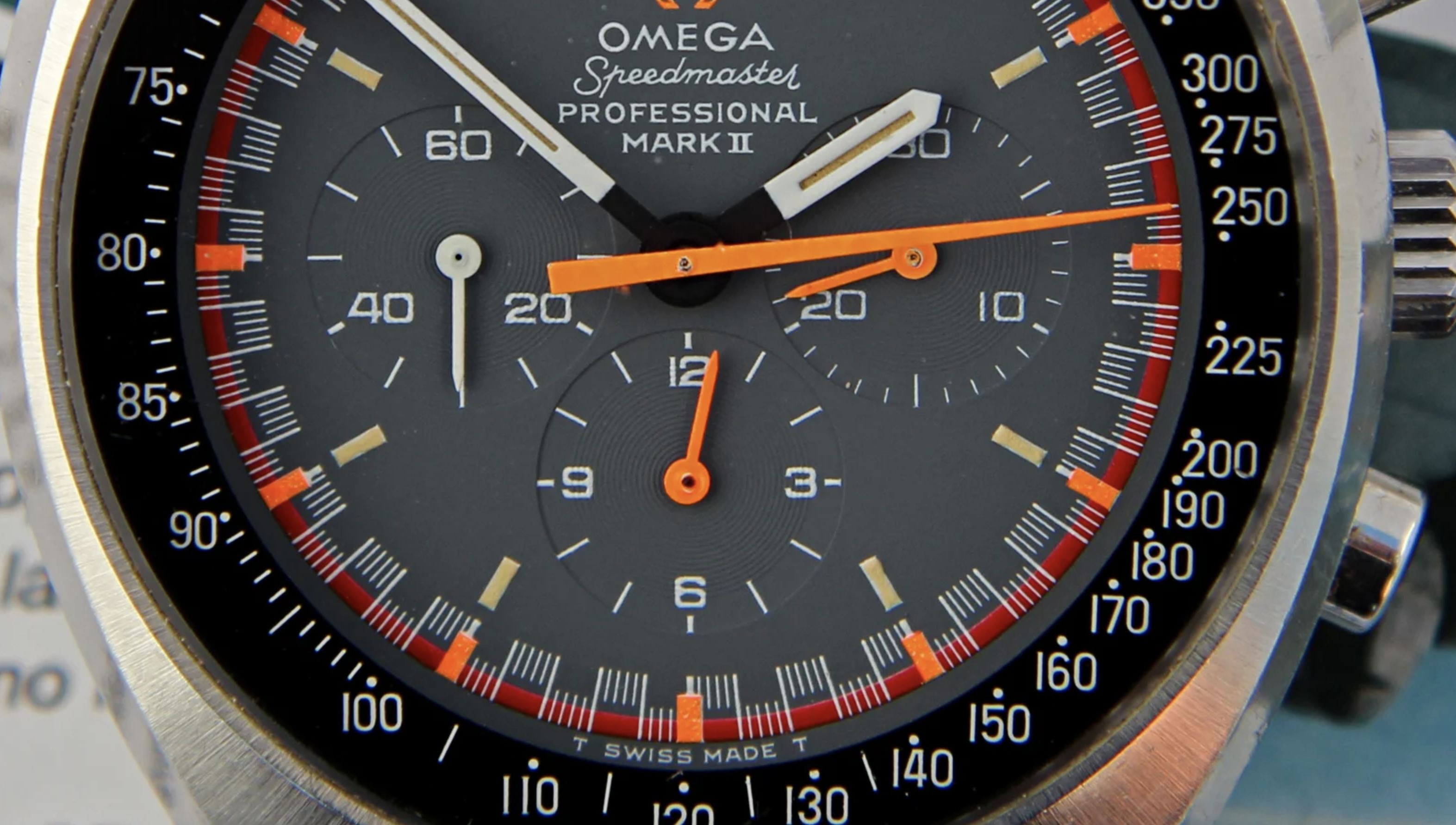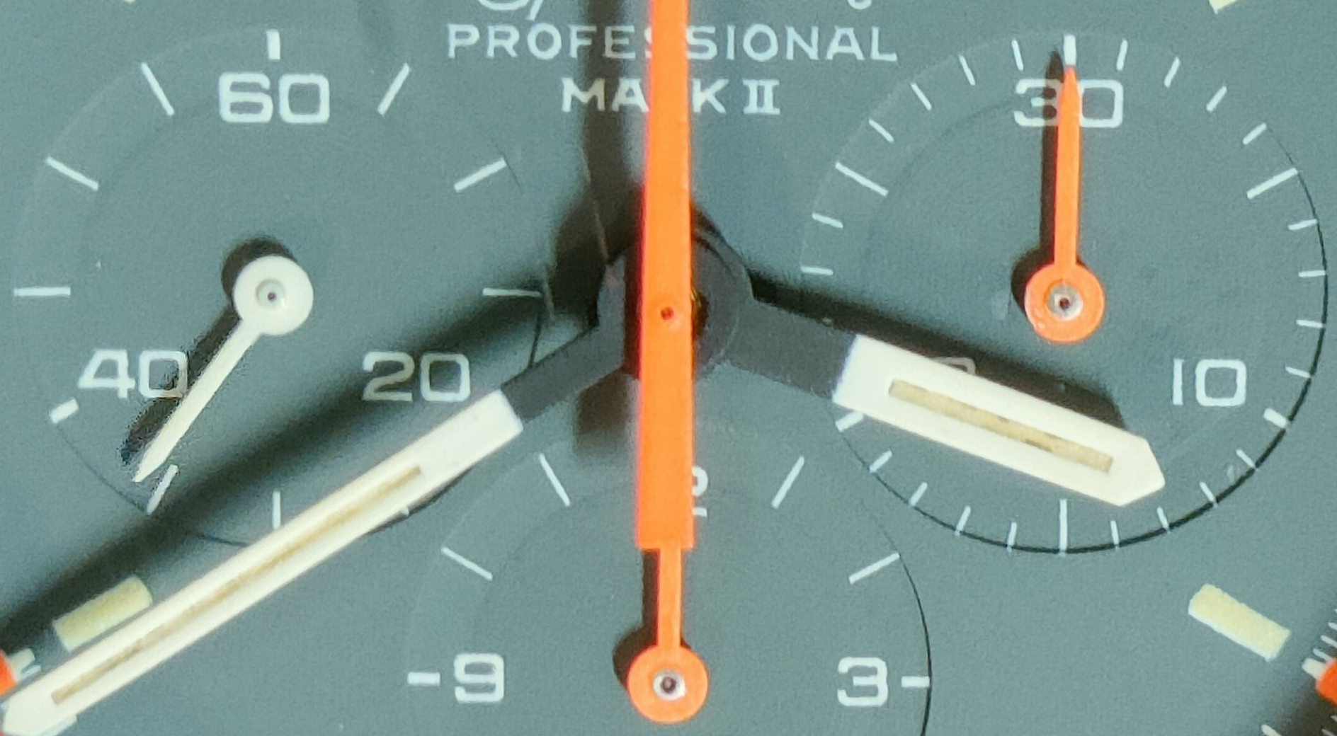 (1). I don't see the clear thin ring/circle patterns under the three choronograph hands. If I zoomed in, it seems that there are some vague ring/circle patterns, especially under 60-seconds chronograph hand. I do find a few watches of the same model sold on this forum do have very crisp ring/circle patterns. For example: https://omegaforums.net/threads/1972-omega-speedmaster-mkii-racing-dial-145-014-serviced.27701/ and https://omegaforums.net/threads/stunning-omega-speedmaster-markii-145-014-with-racing-dial.61218/.