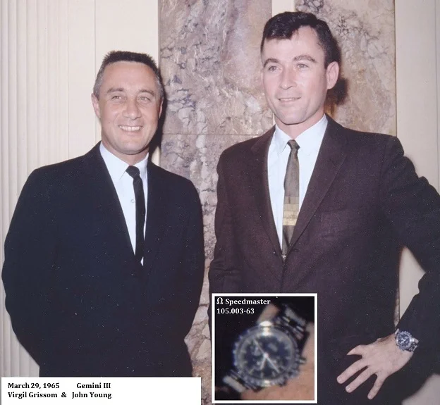 2. During Gemini III, besides an Accutron Astronaut GMT pilot watch, both Virgil Grissom & John Young wore an Omega Speedmaster 105.003, probably "survivors" of NASA testing as the first batch of 17 Omega Speedmaster 105.003-63 was only delivered on 1965, April 23...