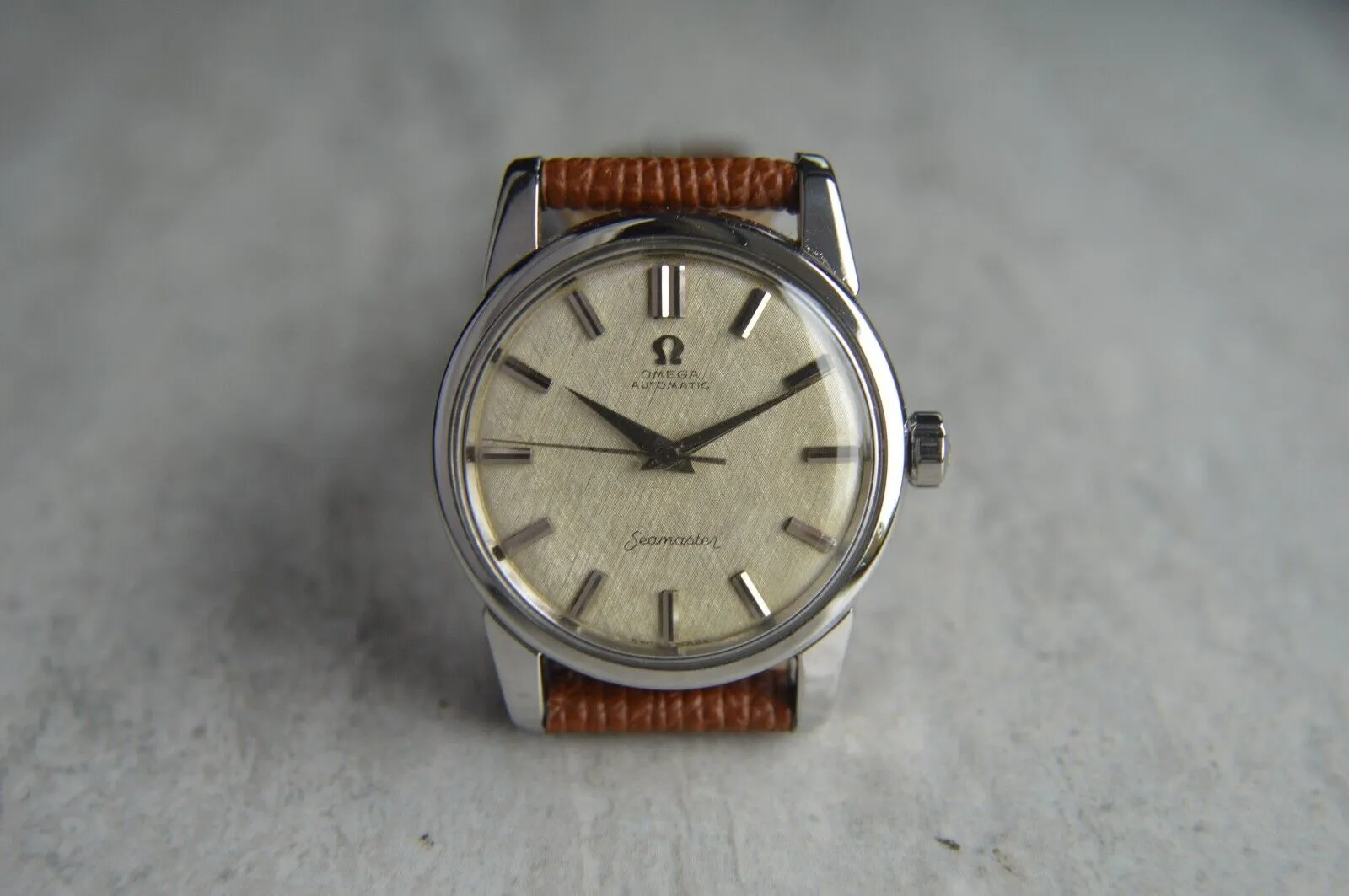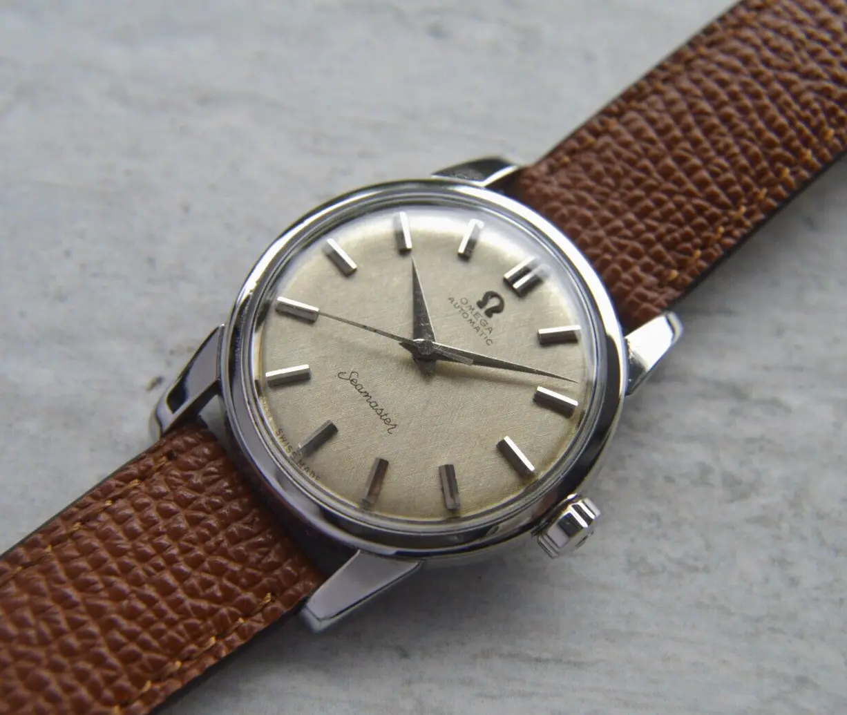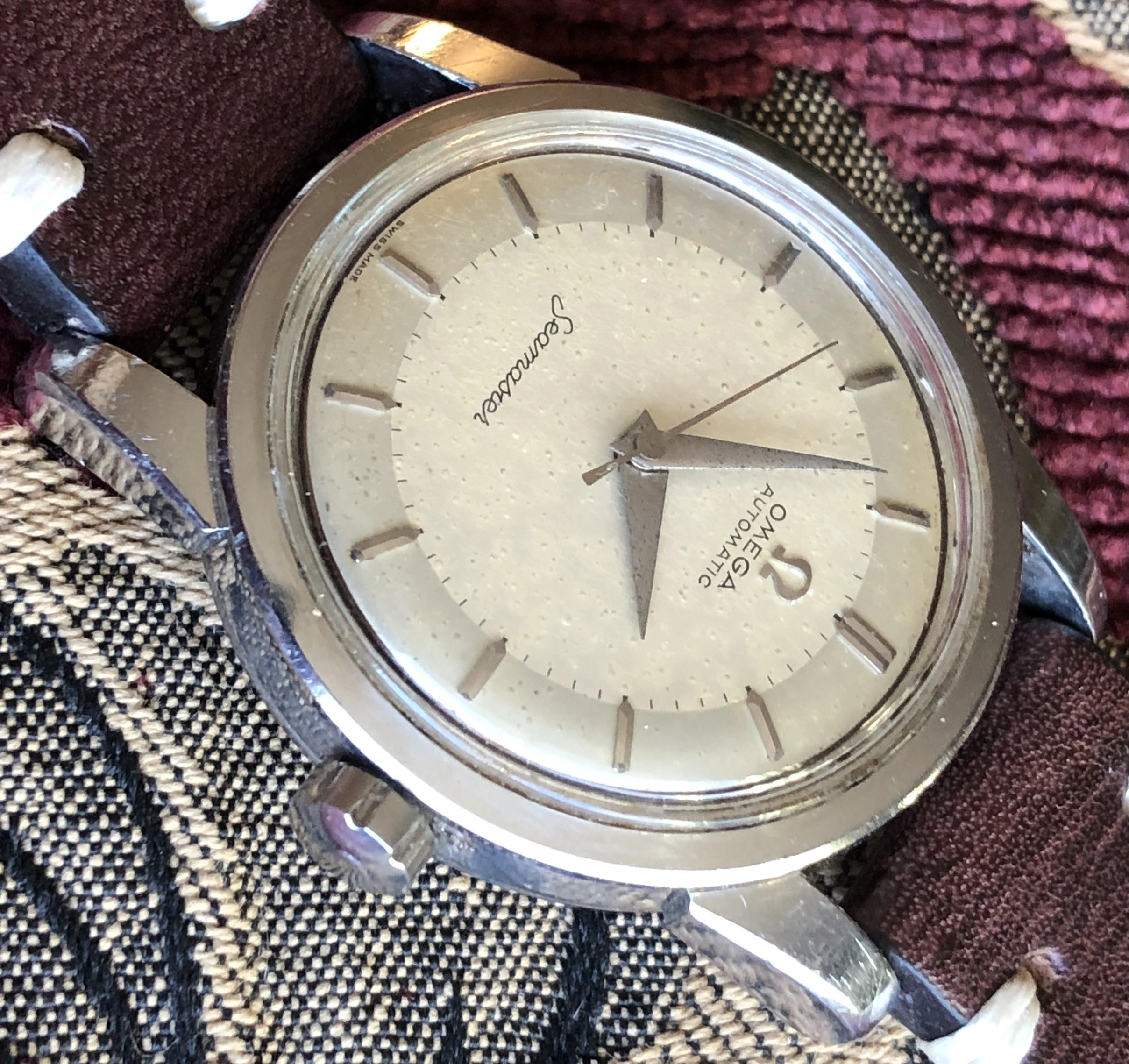 It's a linen dial Seamaster De Ville advertised to be from the 60s. The patina on the lume looks fine to my untrained eye.