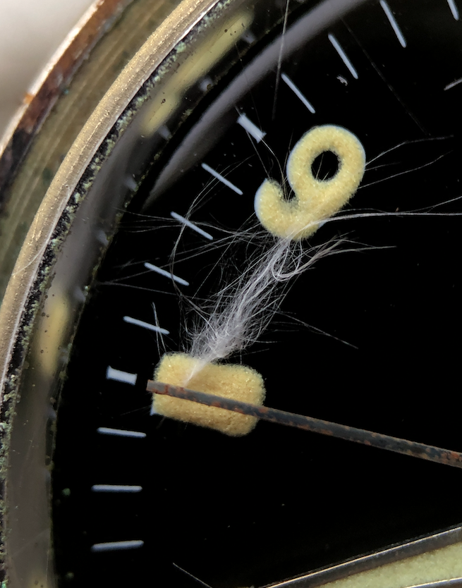 We've all seen "moldy" or darkened lume that's turned brown from moisture, but I've never come across strands of what appears to be fungi that's grown out of some old tritium.