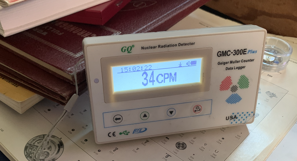 I attach the photos, but as you can see, immediately in front of the dial (where you are unlikely to be, unless you fall asleep with your watch on?), it goes off the scale and records something over 9.99 micro Sieverts per hour. Measured from behind the watch case (ie your wrist), the dose is 2.18 micro Sieverts per hour. Finally, six inches in front of the face, it’s 1.55 micro Sieverts per hour.