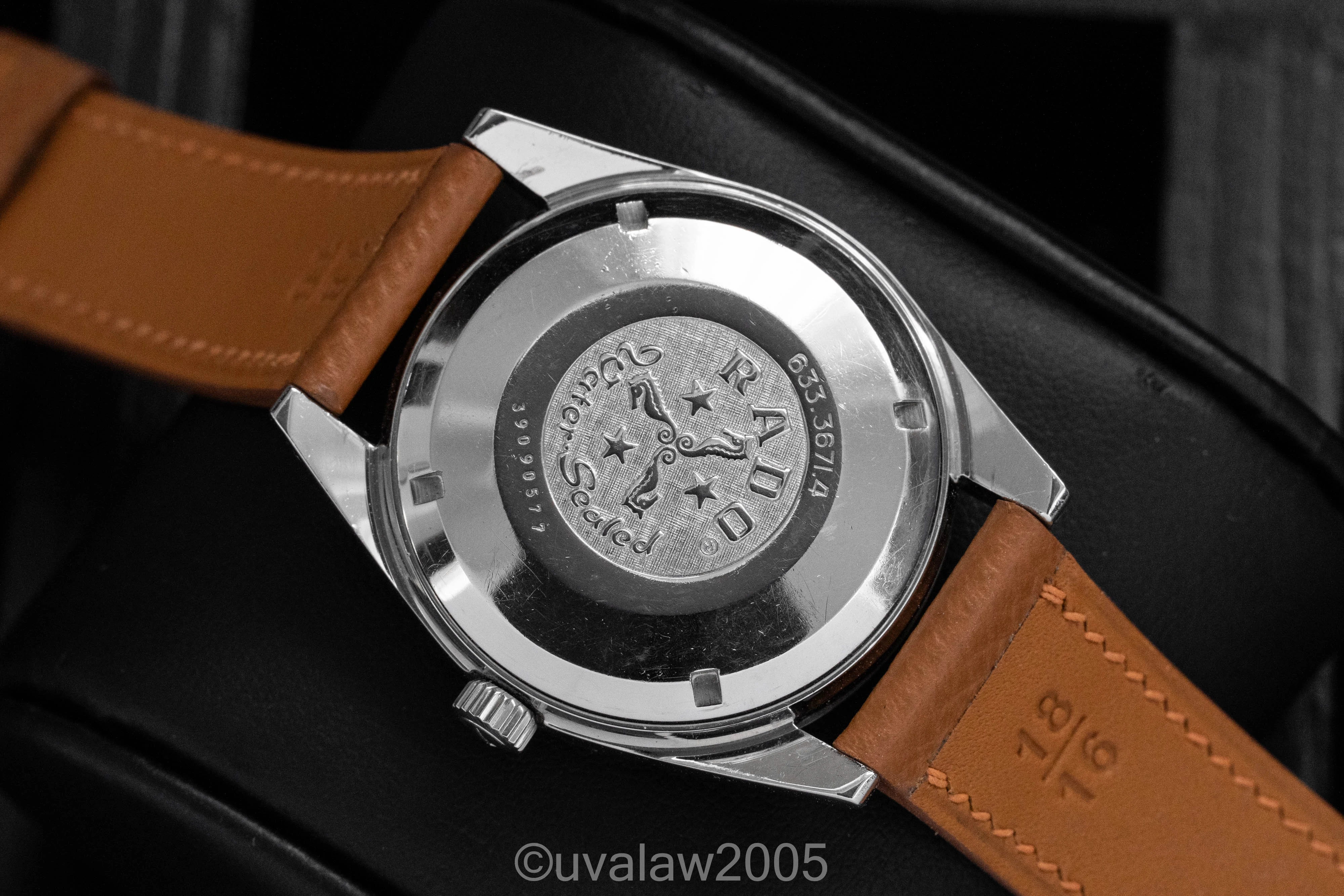 This 80s-era neo-vintage Swiss piece has great wrist presence. Original finish with polished case top and vertically brushed case sides. Sunburst dial surrounded by circular track, applied indices, and framed date window. Signed crown and caseback. Domed acrylic crystal has exceptional clarity and light wear with a few flea bites at the edges. The Rado anchor logo swivels as designed. ETA 2824-2 movement was recently serviced and is keeping excellent time, +10s/day on my wrist.
