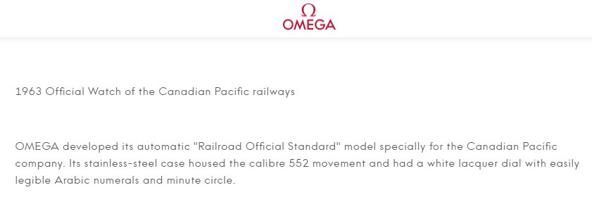 “OMEGA developed its automatic "Railroad Official Standard" model specially for the Canadian Pacific company. Its stainless-steel case housed the calibre 552 movement and had a white lacquer dial with easily legible Arabic numerals and minute circle.”