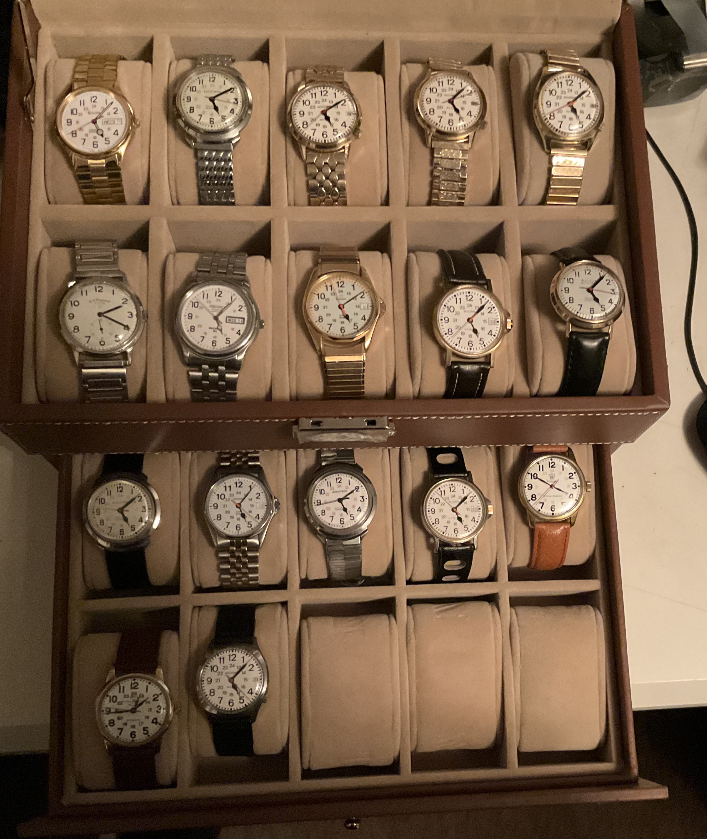 ·In preparation for our railroad standard wrist watch exhibit at a train show, this coming week end, here are 17 watches comprising 3 mechanicals (not set to time) including a stem wind Elgin, two Ball Trainmasters (self winders), one Seiko quartz, one Rodania quartz, one Bulova quartz, and 12 Accutron 214 and 218 models. They will be grouped out of the display cabinet shown, and in several groups of similar watches.