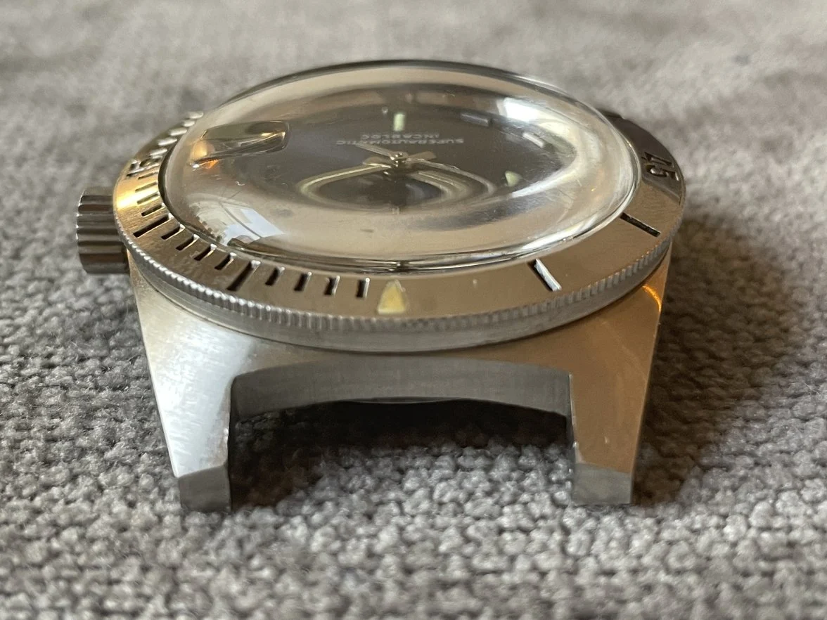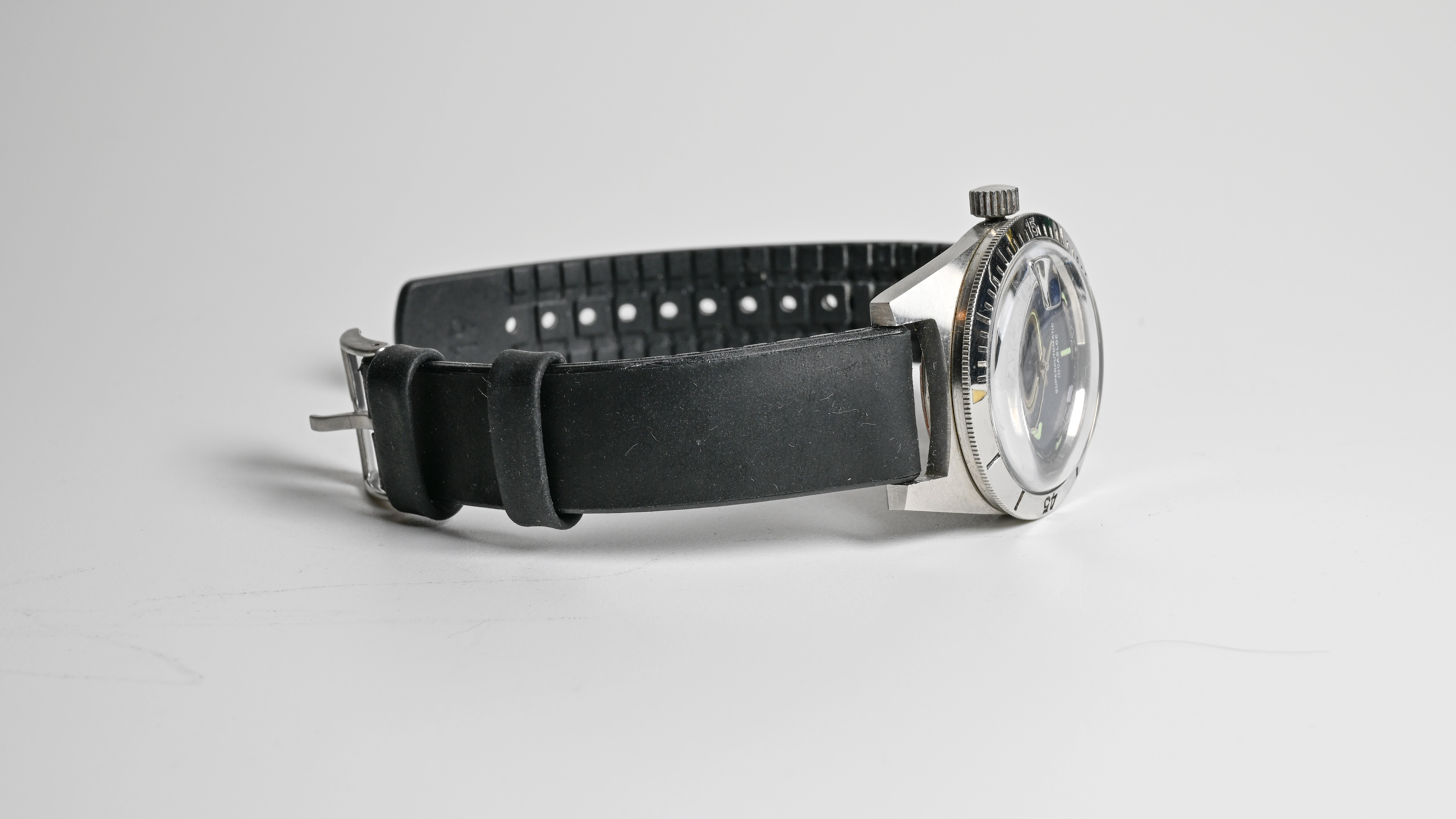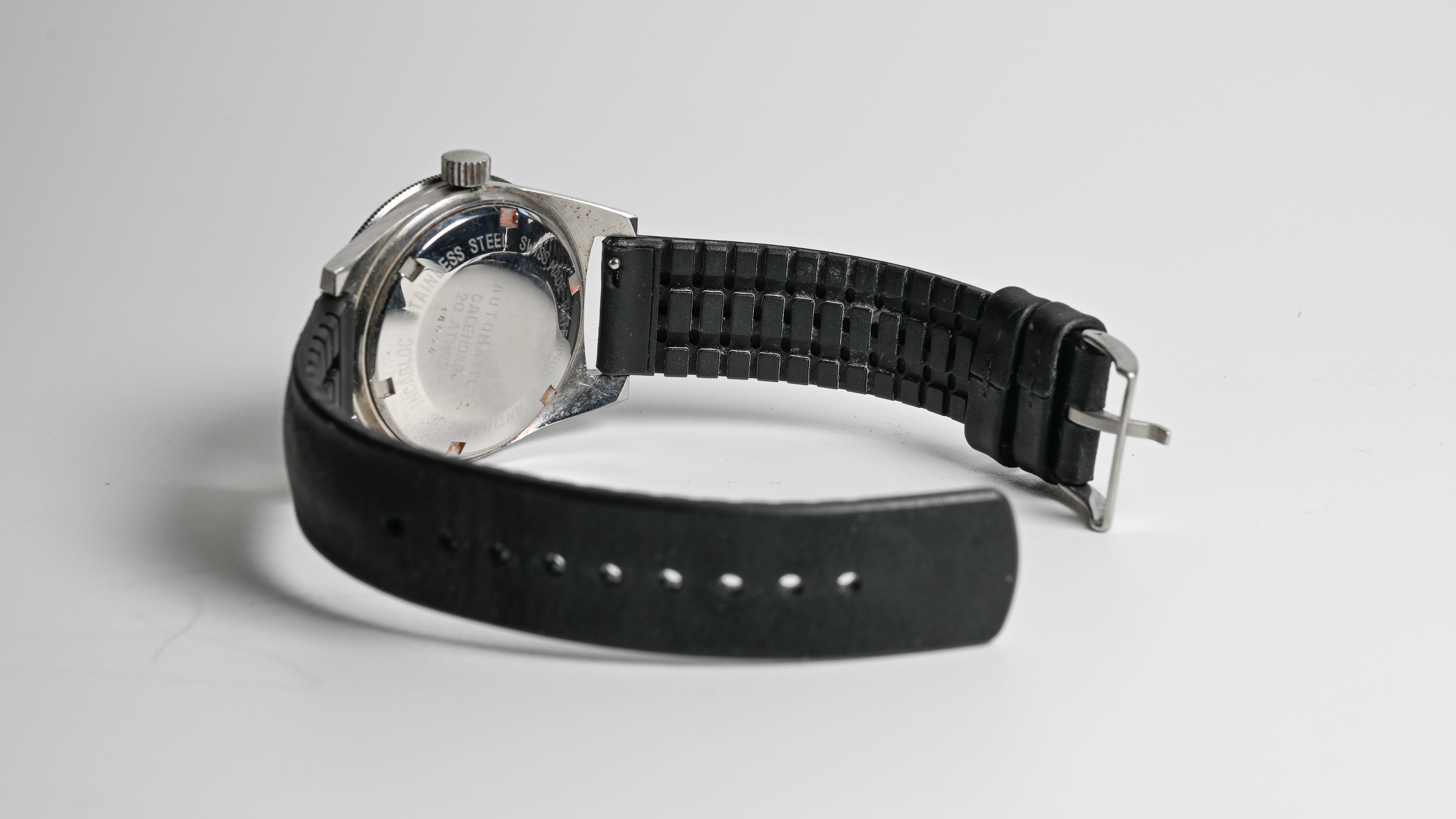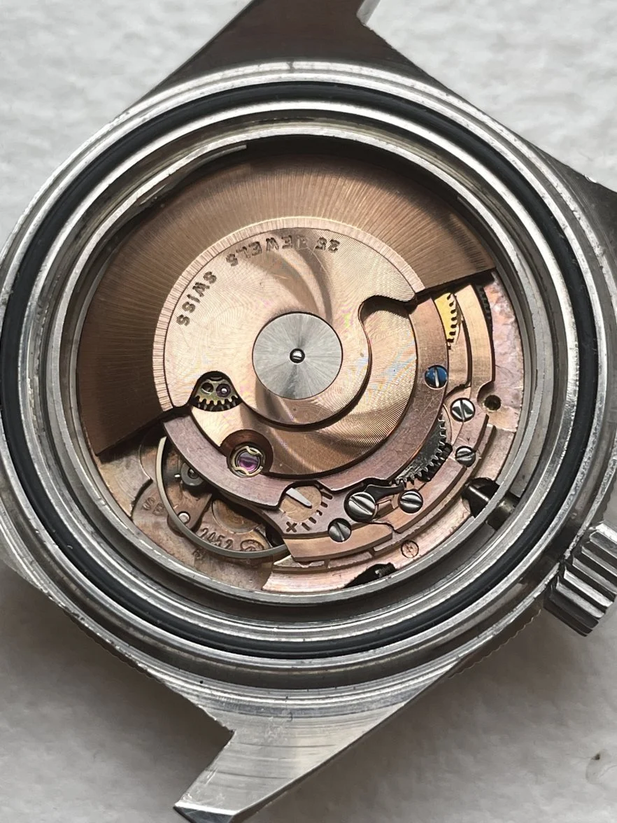 It is equipped with the reliable ETA caliber 2452, 25 jewel, automatic movement, with date function. Service history is unknown to me, but it was worn very sparingly over the past 16 months, and keeps excellent time. This workhorse of a movement was used in many similar dive watches of the era, many of which bore much more prestigious brand names and command much higher price-tags today.