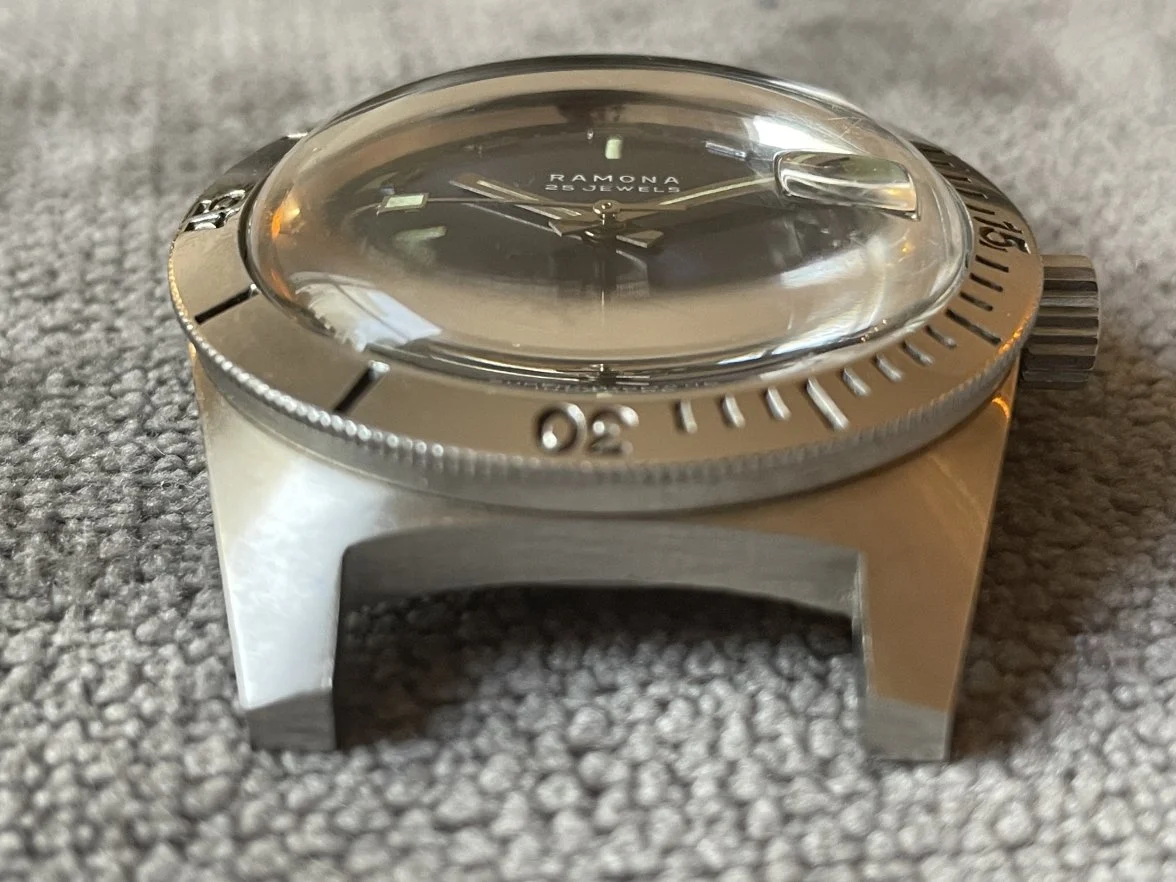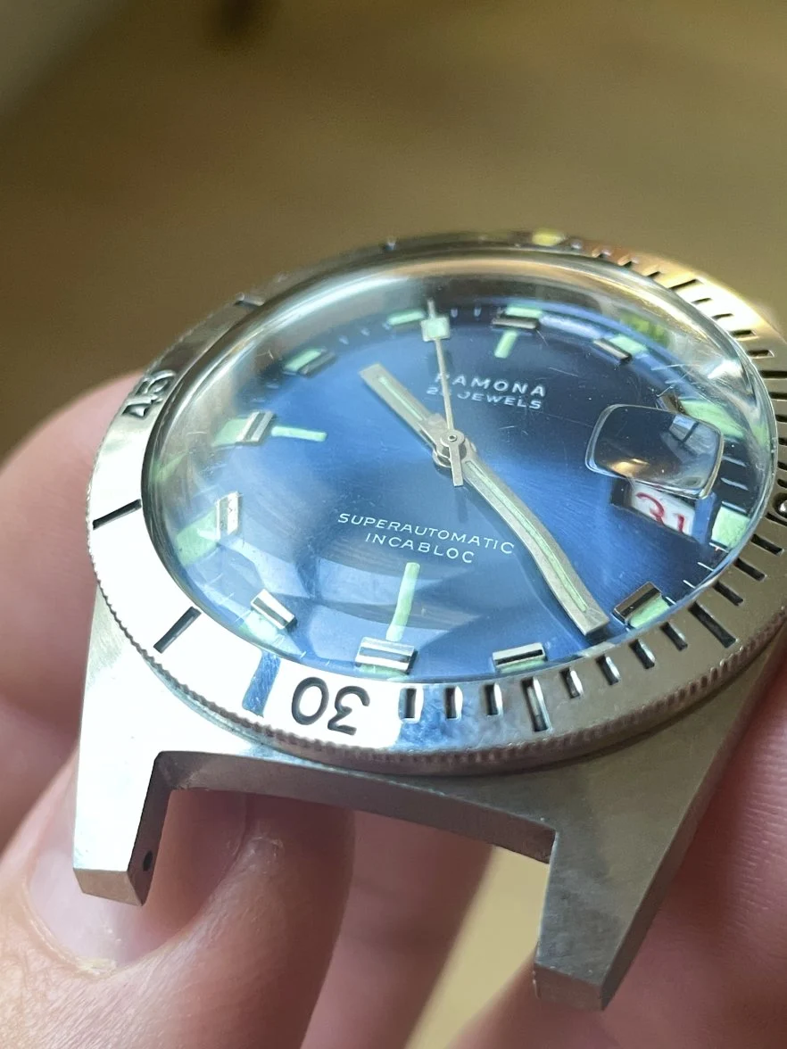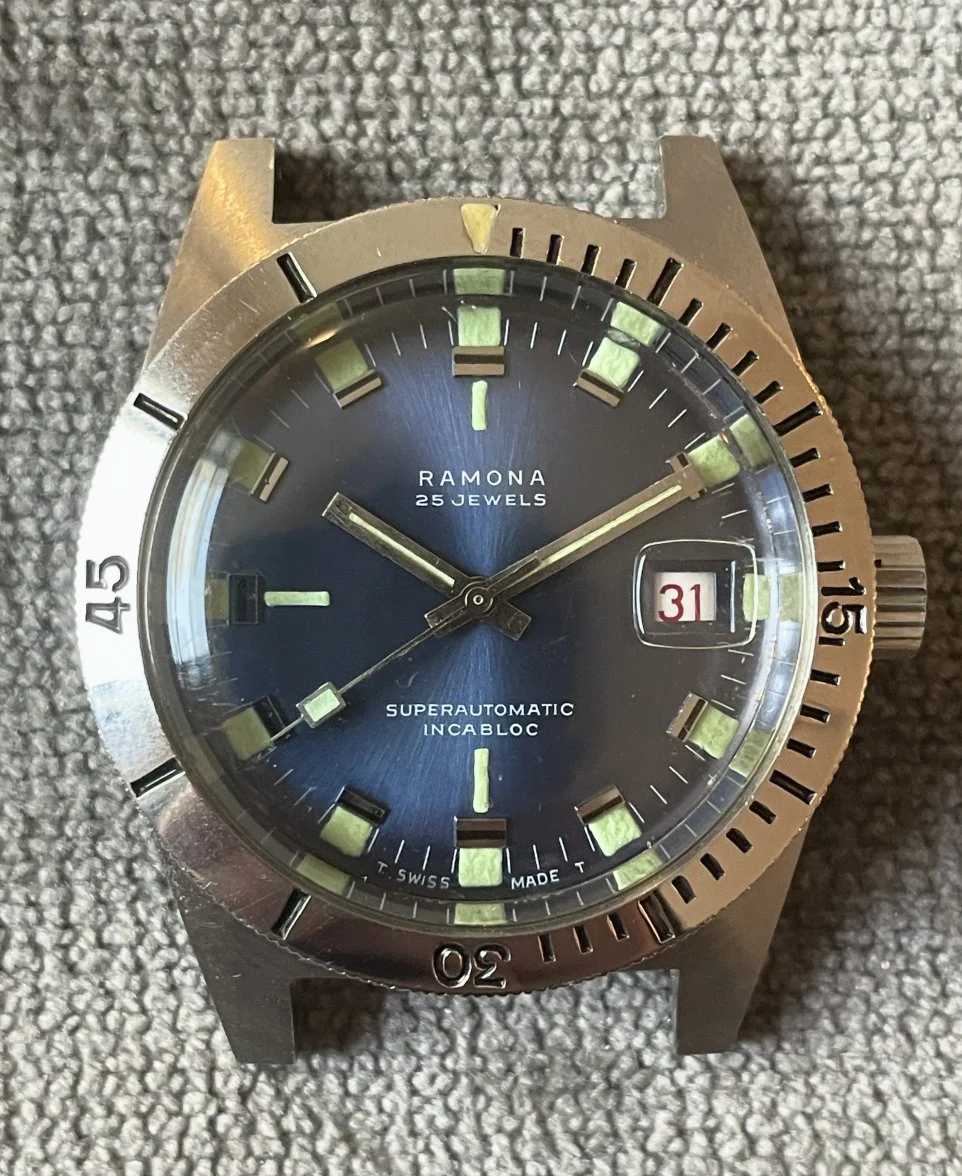This Ramona ref. 14004 is a delight to hold and wear, with a 37mm razor-sharp stainless steel case (factory lines and brushing visible all around) and a stunning, blue radial dial with lots of perfectly conserved luminous tritium, and perfectly matching hands. The stainless bezel is also in remarkable shape (slightly wider than the case at 39mm diameter), with an intact lume plot and an ultra-thick domed plexiglass with a date magnifier that shows practically no scratches at all.