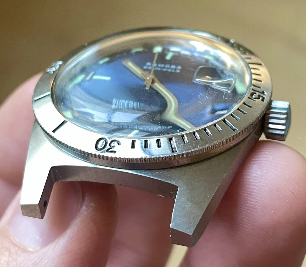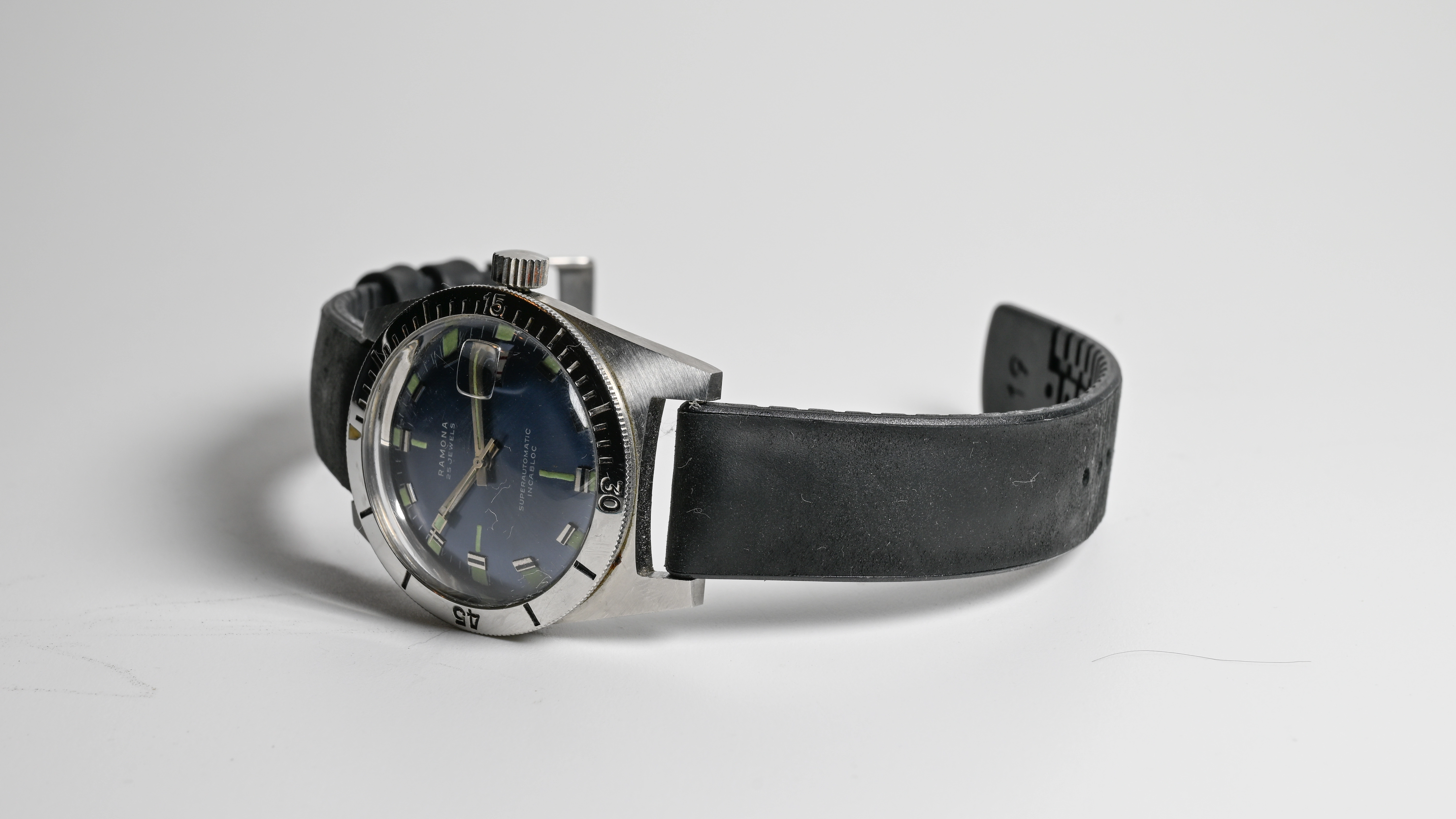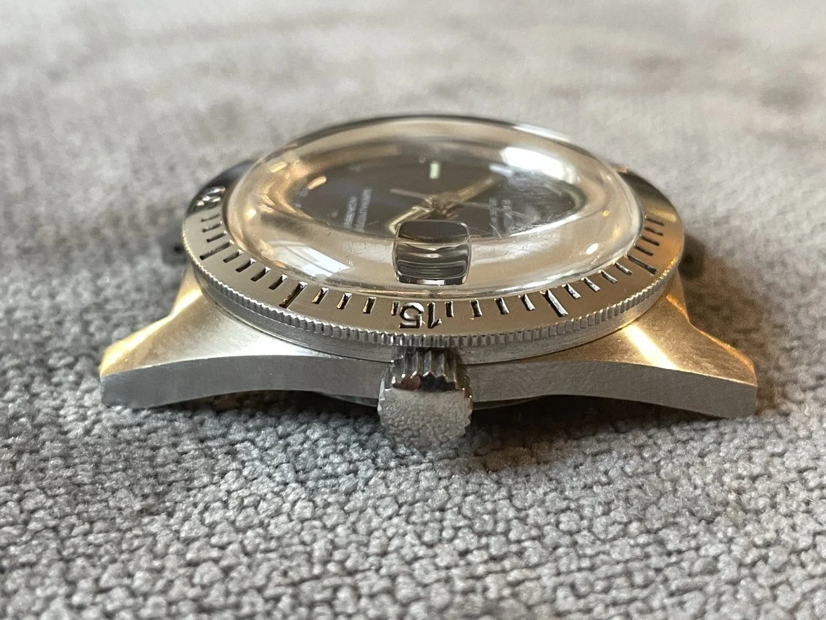 This Ramona ref. 14004 is a delight to hold and wear, with a 37mm razor-sharp stainless steel case (factory lines and brushing visible all around) and a stunning, blue radial dial with lots of perfectly conserved luminous tritium, and perfectly matching hands. The stainless bezel is also in remarkable shape (slightly wider than the case at 39mm diameter), with an intact lume plot and an ultra-thick domed plexiglass with a date magnifier that shows practically no scratches at all.